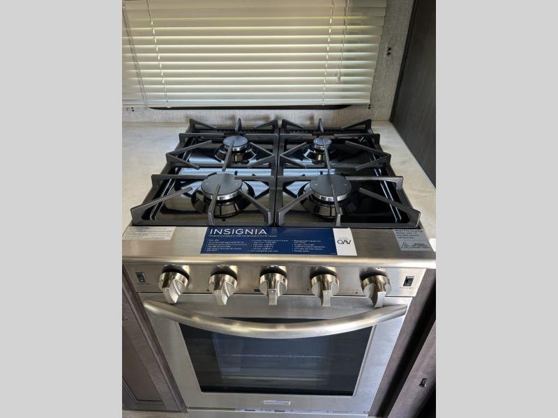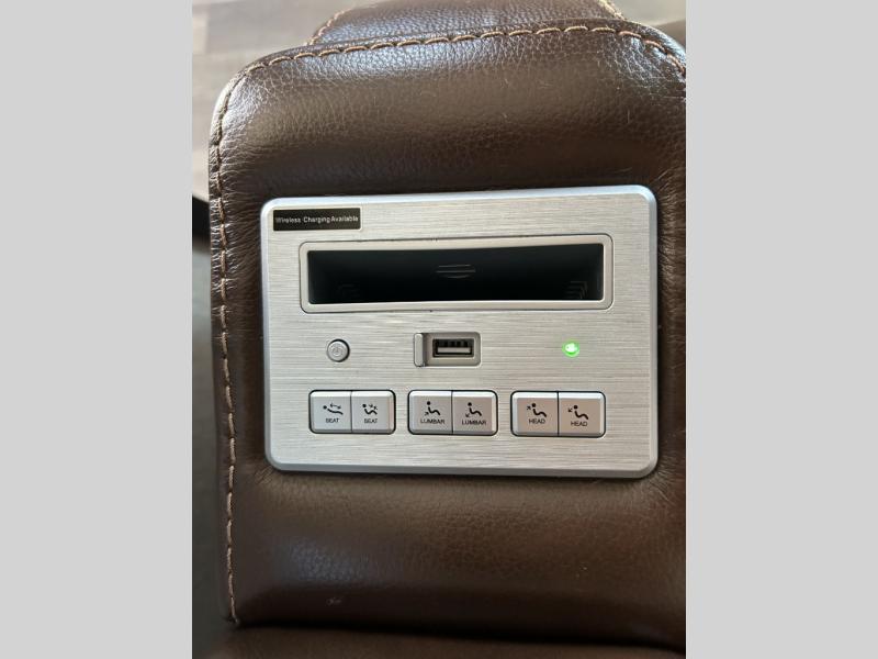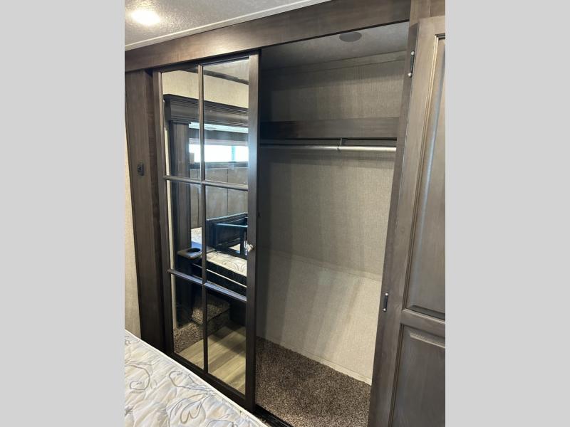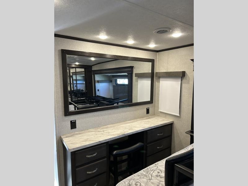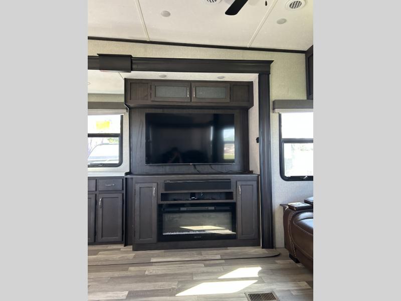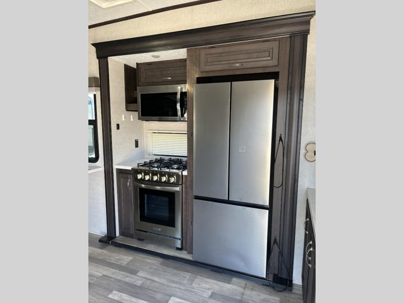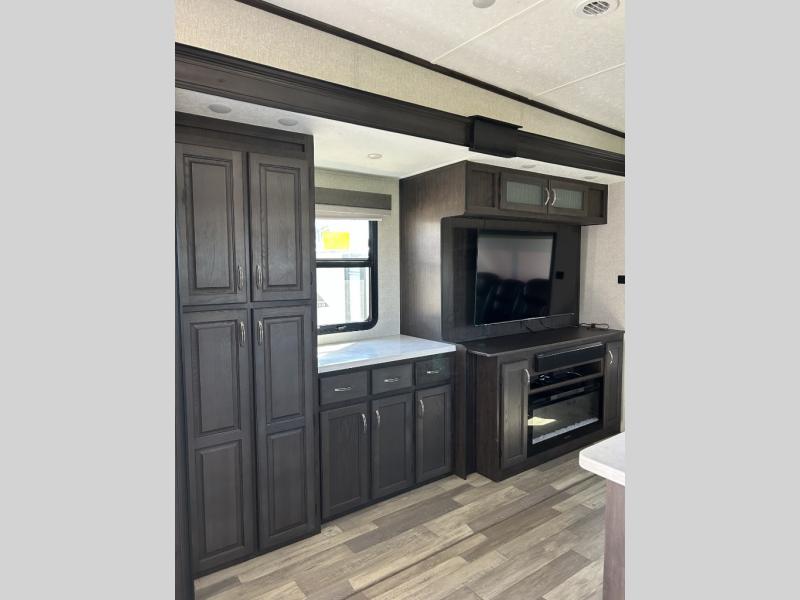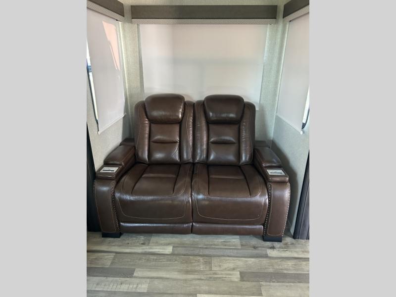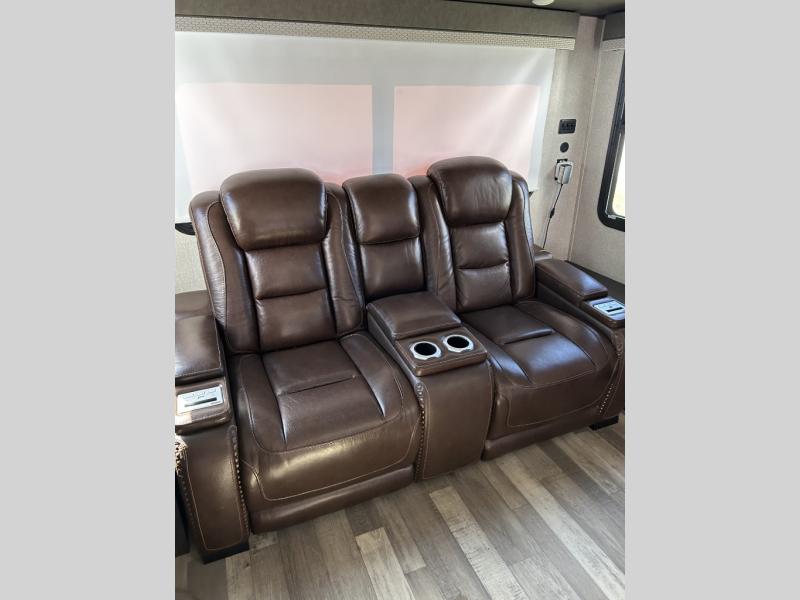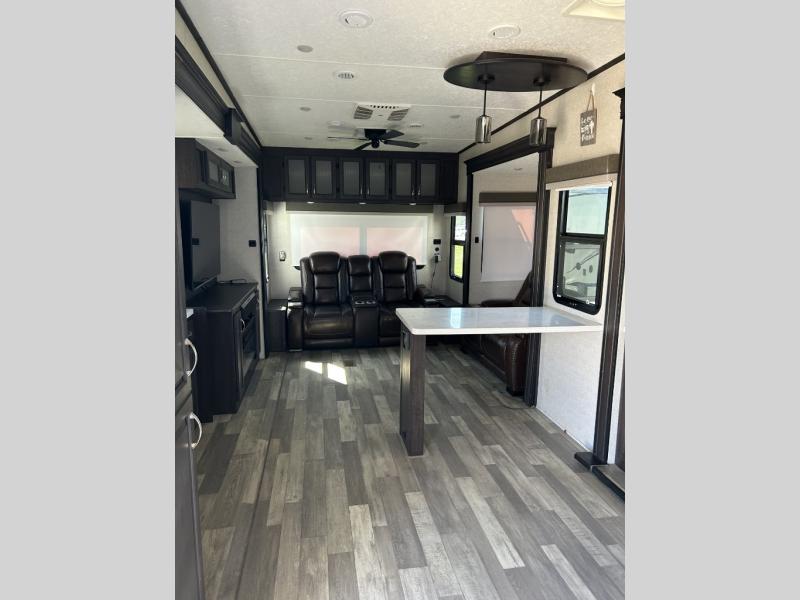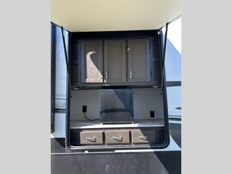This fifth wheel is designed to make sure you enjoy every square foot! The private queen bedroom has plenty of storage, with a dresser and wardrobe, including prep for an optional washer and dryer. Plus there's a desk area with a chair so you can have a private space to set up your laptop and get some work done. In the living room, you have a variety of luxurious furniture, including a tri-fold sofa, theater seats, and an entertainment center. Step into the kitchen where you can sit at the bar top table with four bar stools. The kitchen is fully equipped with a residential cooktop and oven, microwave, and refrigerator. There's tons of storage, which also includes extra touches like a pantry with an adjacent coffee station so you can have a dedicated space to make hot drinks. Don't miss the outside amenities either, including a power awning and an exterior refrigerator.