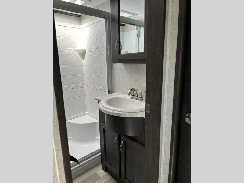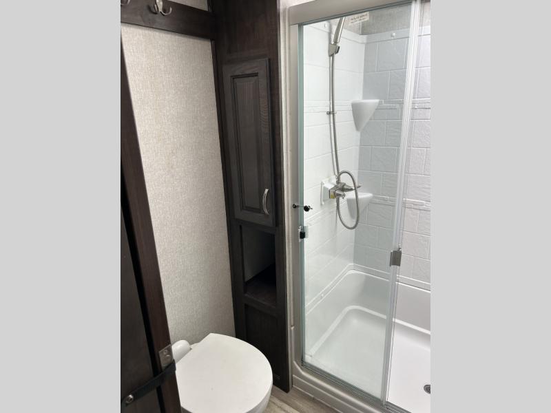 The Brookstone fifth wheels by Coachmen are coming to you with wide-body comfort, home-like amenities, and unique designs for a truly luxurious RV. The 4 Season Protection Package includes double batten insulated roof with radiant barrier insulation, Weather Shield+, a 40,000 BTU high capacity furnace, and more that will help you extend your camping season or go full-time. The frameless automotive-style windows feature 80% privacy tint safety glass, and the vacuum bonded and aluminum framed sidewalls with rot proof Azdel will provide durability. Head inside to find solid hardwood drawers, granite/marble style solid surface countertops in the kitchen, a residential bed with a pillow top mattress and full storage underneath, and the list of comforts goes on! The Brookstone also includes 6-point electric auto-leveling, marine-grade exterior speakers with an LED light, four Solid Step entry steps, and many more exterior conveniences!