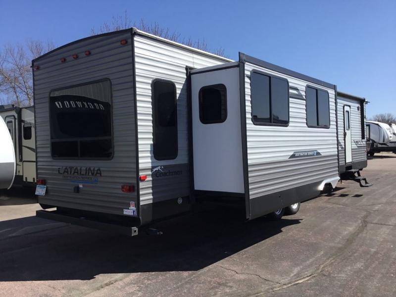 The Catalina Destination Series trailers by Coachmen RV are constructed with a seamless Alpha roof membrane, a cambered structural steel l-beam frame, full length frame E-coated outriggers, fiberglass insulation throughout, and a platinum aluminum exterior metal skirt. Along the exterior you will find JBL Elite exterior speakers, a battery disconnect switch on the A frame and a LP quick connect port. The interior offers two 12V 14" ceiling vent fans in the living and bedroom, full length kitchen drawer guides, a slim line range hood, a skylight above the shower, and Congoleum Woodplank linoleum flooring for easy care. Why wait to enjoy your favorite location every chance you get, choose your favorite destination trailer today!