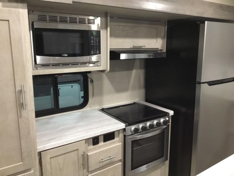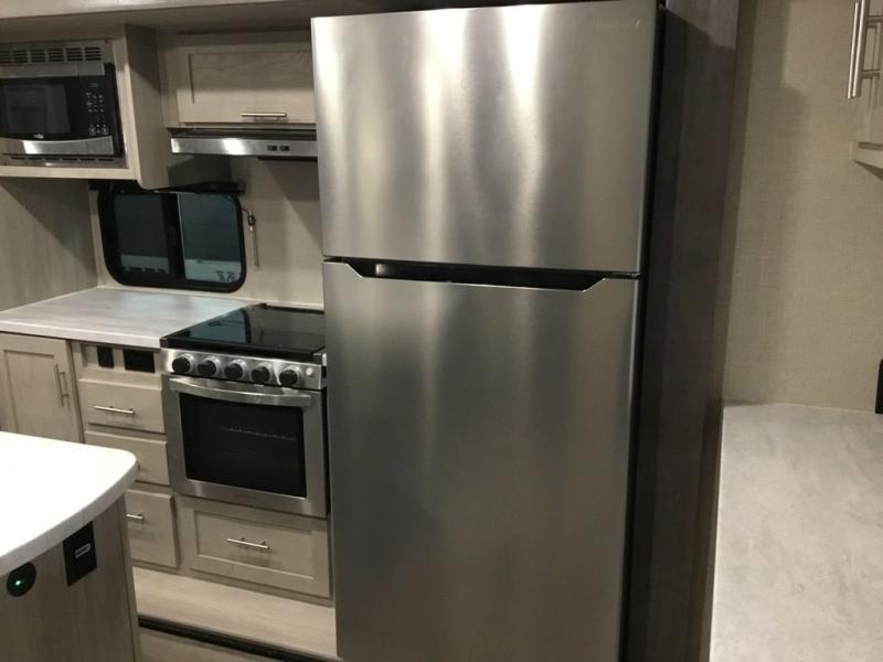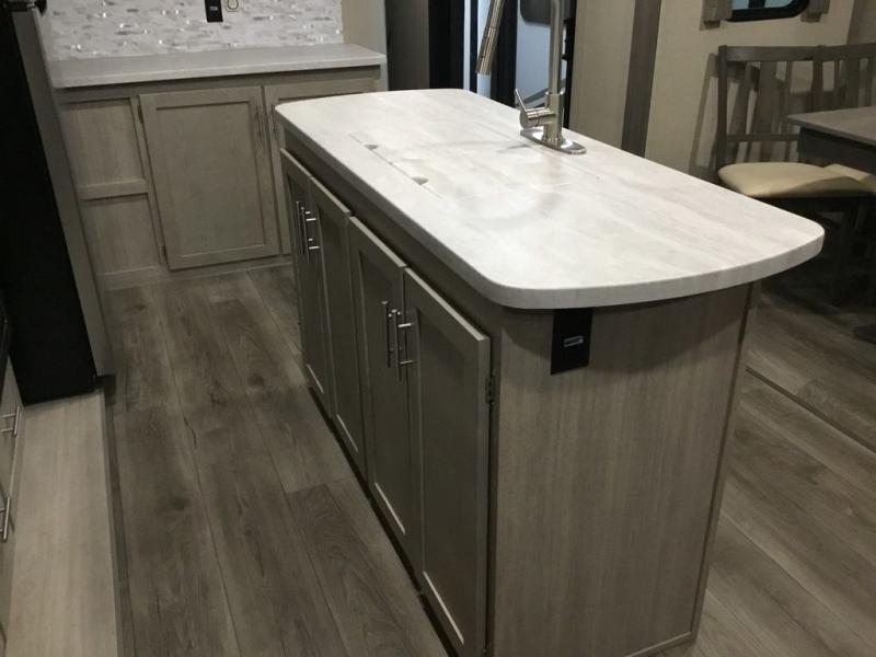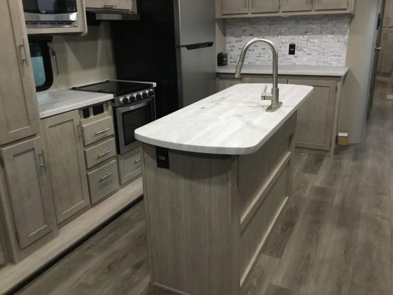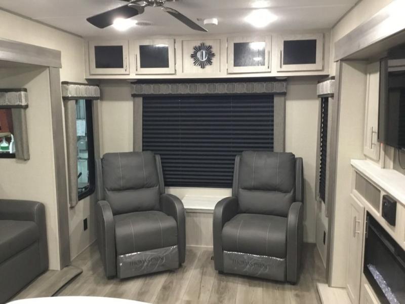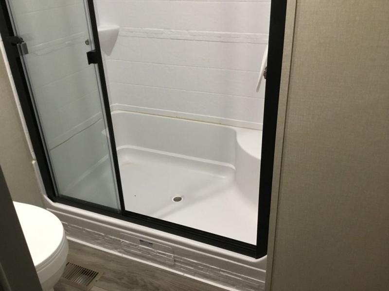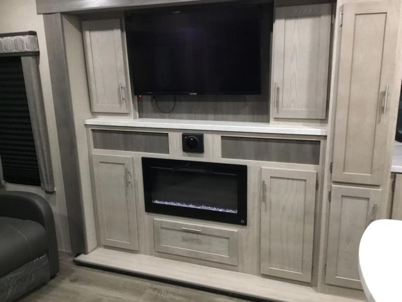 Get away to your ranch, farm, or lake house that you have created by having this destination trailer! The spacious living and kitchen area offers opposing slides, a center island with bar stools, a 39" TV with a dual zone entertainment sound bar, and a fireplace. You will also find seating on a tri-fold sofa and booth dinette as well as dual recliners. The chef will have full amenities to keep everyone fed, plus a residential refrigerator to store any leftovers. Take a break in the full bathroom which includes a shower with a seat and linen storage. When it's time to retire for the evening, the front bedroom gives you a spacious oasis with a king bed slide, a ceiling fan, and lots of storage. You might even like to add a few options such as a free standing dinette, a washer/dryer to the prepped space, and/or an optional 18' awning that would provide protection from the outside elements.
