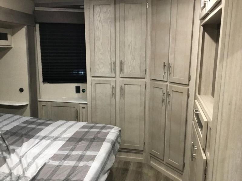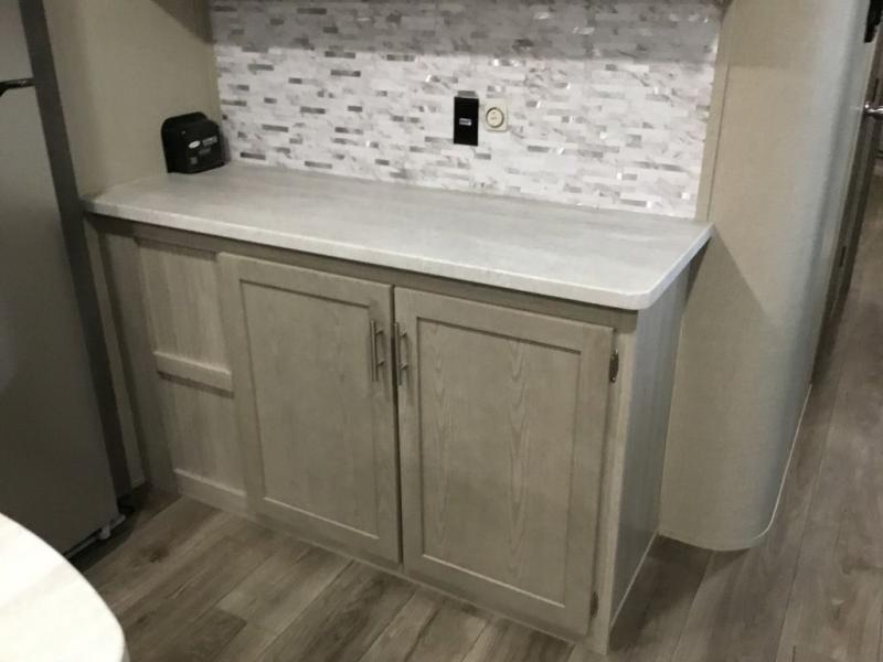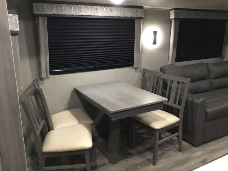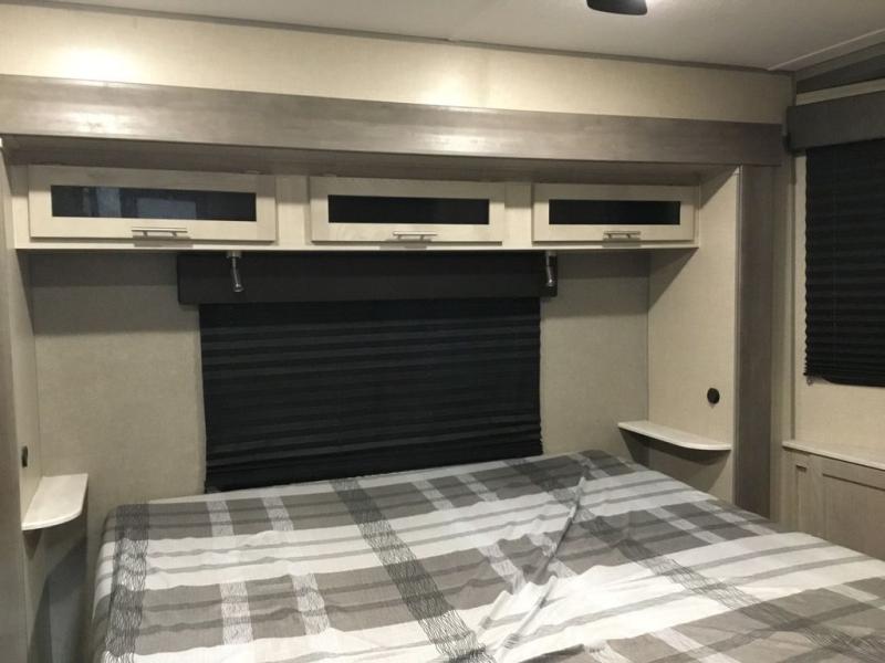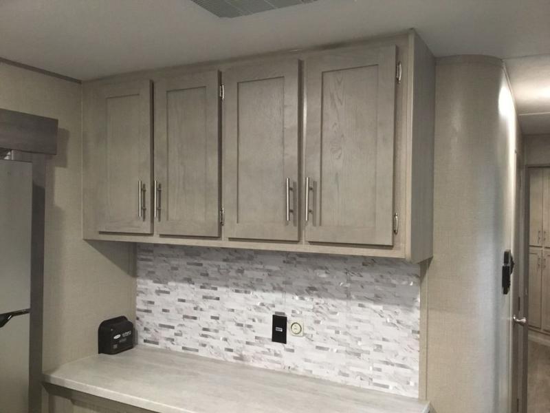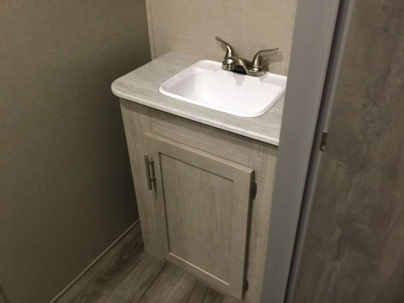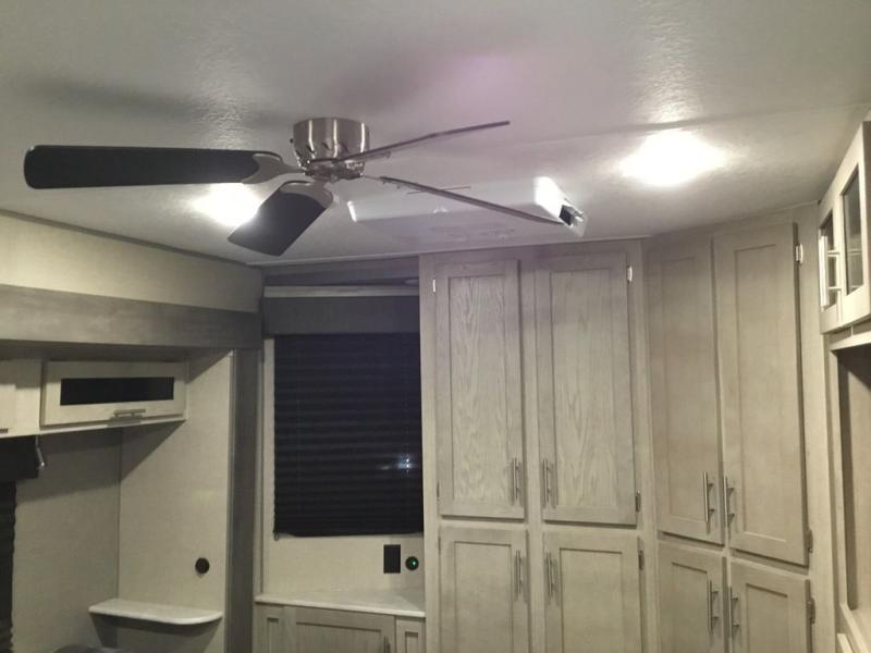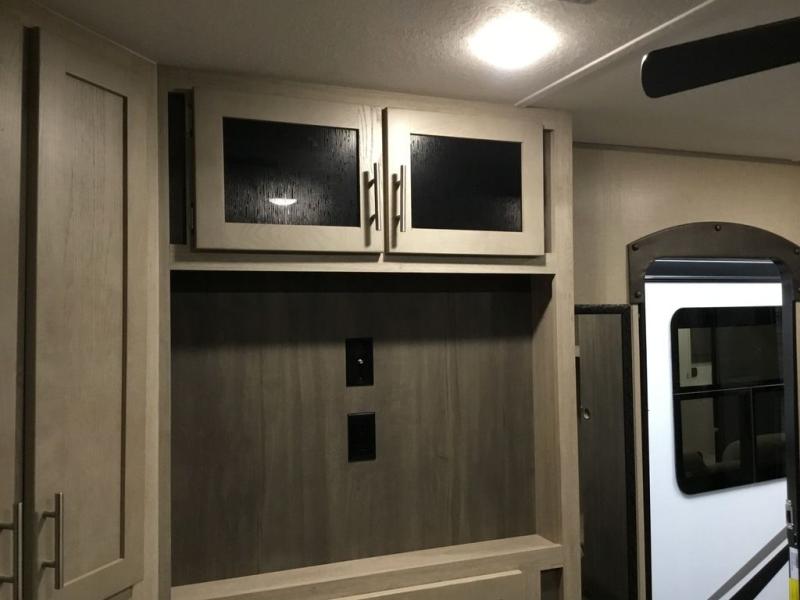 Get away to your ranch, farm, or lake house that you have created by having this destination trailer! The spacious living and kitchen area offers opposing slides, a center island with bar stools, a 39" TV with a dual zone entertainment sound bar, and a fireplace. You will also find seating on a tri-fold sofa and booth dinette as well as dual recliners. The chef will have full amenities to keep everyone fed, plus a residential refrigerator to store any leftovers. Take a break in the full bathroom which includes a shower with a seat and linen storage. When it's time to retire for the evening, the front bedroom gives you a spacious oasis with a king bed slide, a ceiling fan, and lots of storage. You might even like to add a few options such as a free standing dinette, a washer/dryer to the prepped space, and/or an optional 18' awning that would provide protection from the outside elements.