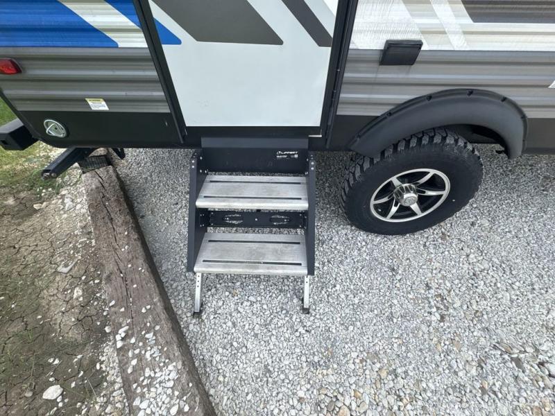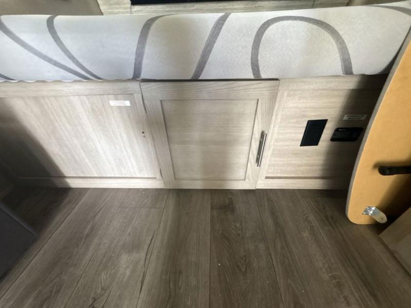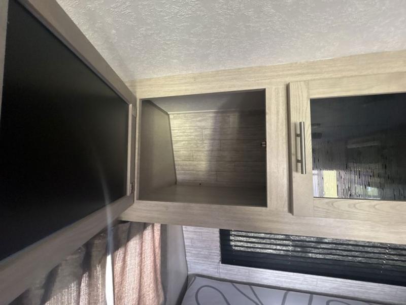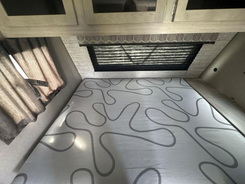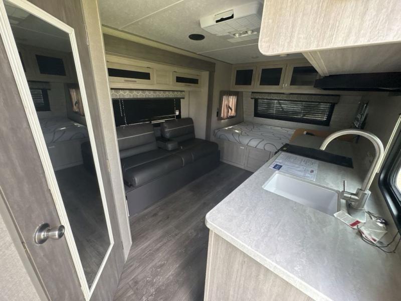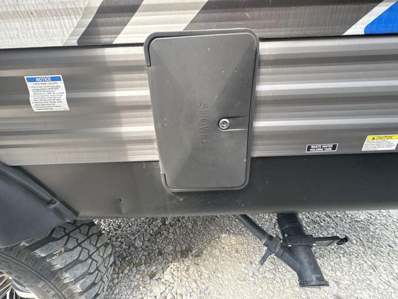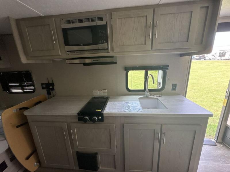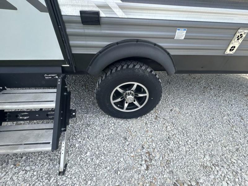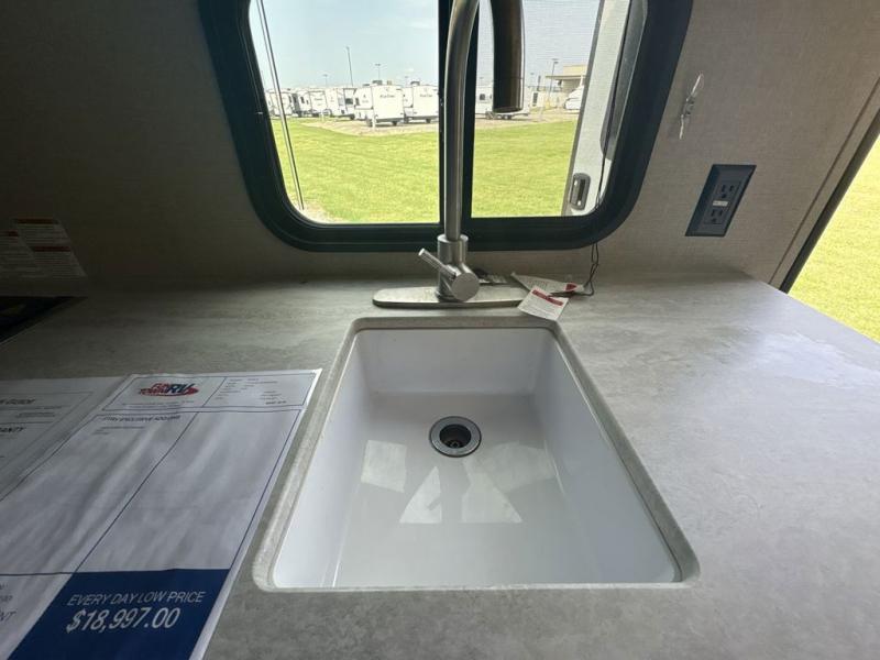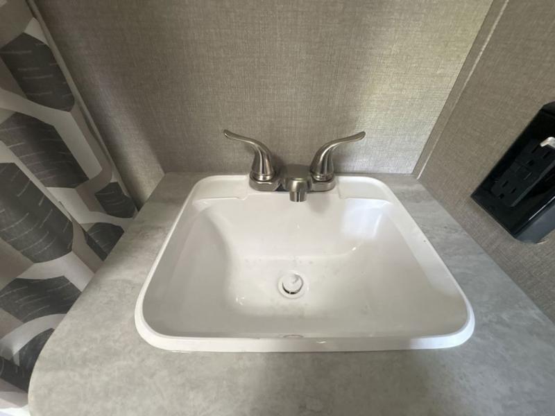 Get ready for adventure either at a local RV park or off-grid as you enjoy the outdoors. You will be able to return to your own accommodations in this trailer with a spacious interior thanks to the single slide that offers more elbow room and floor space to move about, and plenty of space to stretch your legs, and dine. This area is also great for an overnight guest or two small children to sleep on. Spend your days outside swimming at the lake or hiking trails to return to a rear corner bath with a 32" x 32" radius shower that will allow you to get cleaned up before bed. You will find an RV queen bed with a countertop at the foot of the bed which is a perfect spot to drop your phones for the night or stash your reading material, alarm clock and/or purse/wallet. This model also includes a heavy-duty table to use indoors or outdoors!