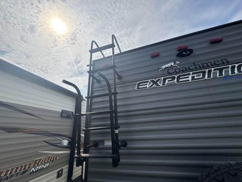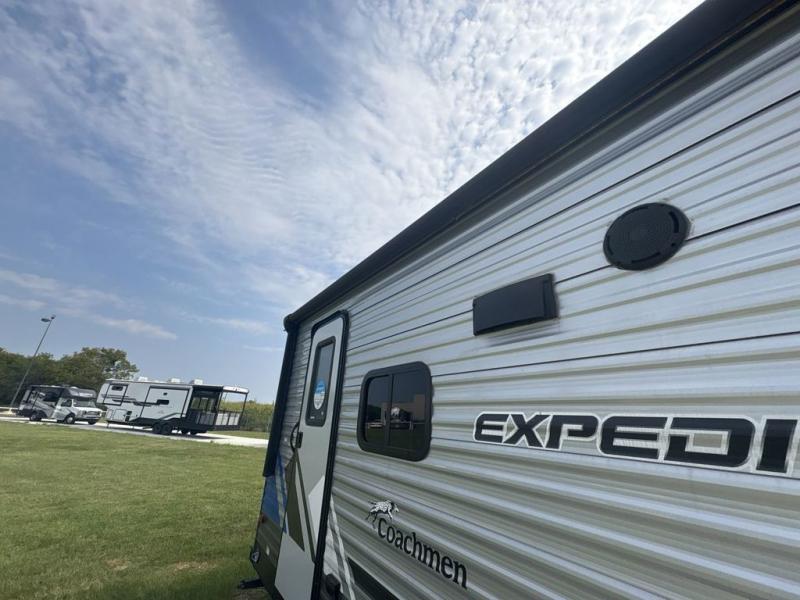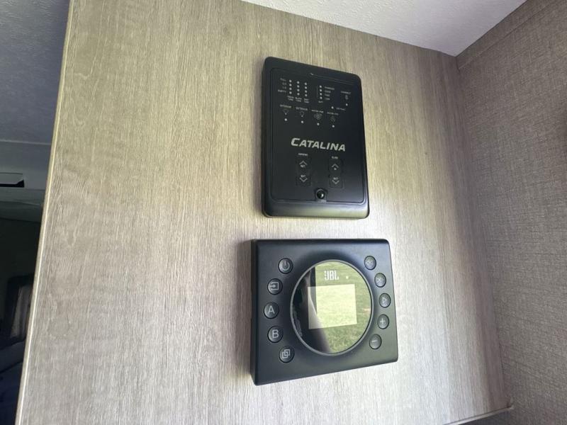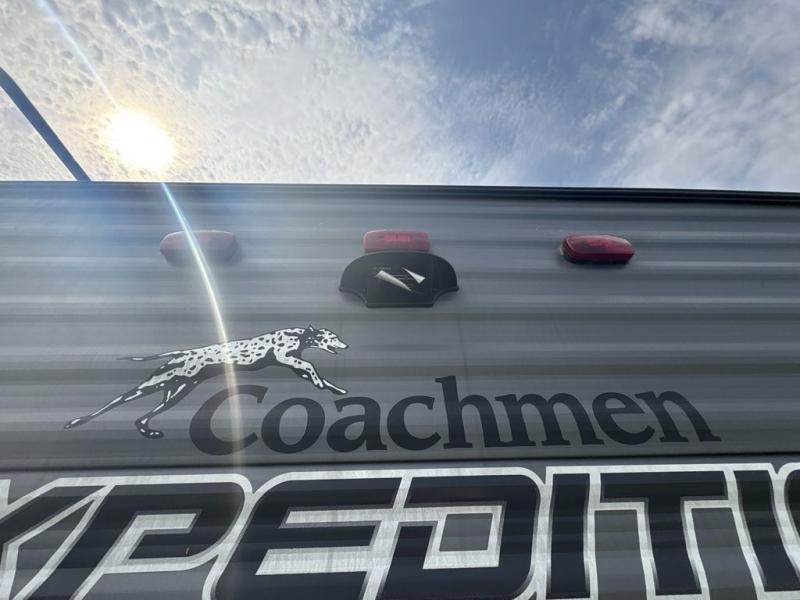 With any Catalina Expedition travel trailer by Coachmen, you will have a lightweight RV that was built with a cambered structural steel l-beam frame, a seamless Alpha roof membrane, fiberglass insulation throughout. There are oversized off-road fender flares, all terrain tires, and a premium exterior graphics package. On the outside, an electric awning includes a multicolor LED strip with a remote offering a covered outdoor living area that can be utilized during the day or night, plus a multizonal JBL premium exterior speaker to listen to tunes. The interior provides Congoleum woodplank linoleum flooring, seamless Thermofoil countertops throughout, hard valance window treatments, and so much more! It's time to start your expedition!