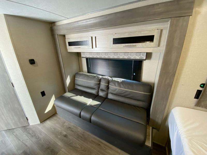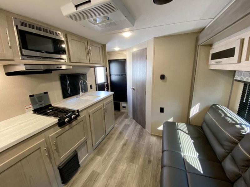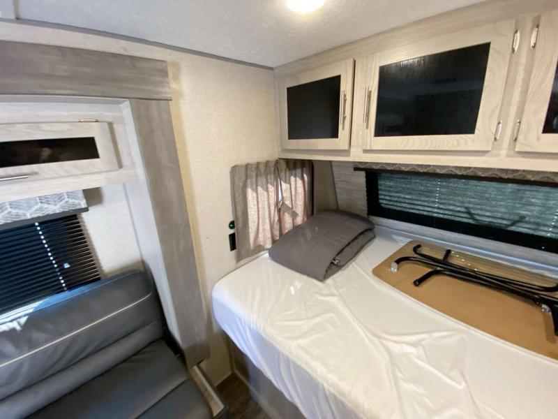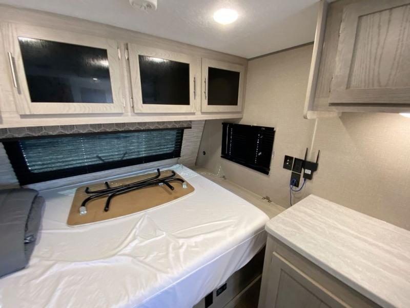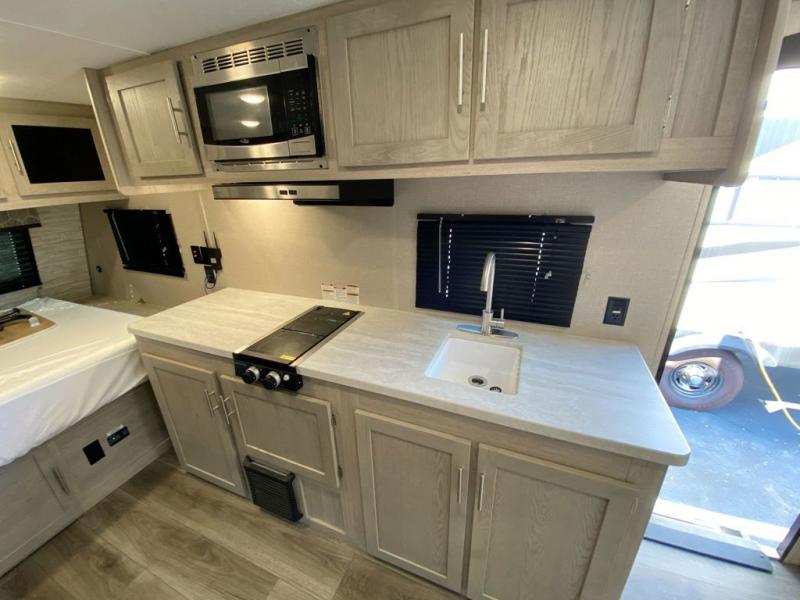 Get ready for adventure either at a local RV park or off-grid as you enjoy the outdoors. You will be able to return to your own accommodations in this trailer with a spacious interior thanks to the single slide that offers more elbow room and floor space to move about, and plenty of space to stretch your legs, and dine. This area is also great for an overnight guest or two small children to sleep on. Spend your days outside swimming at the lake or hiking trails to return to a rear corner bath with a 32" x 32" radius shower that will allow you to get cleaned up before bed. You will find an RV queen bed with a countertop at the foot of the bed which is a perfect spot to drop your phones for the night or stash your reading material, alarm clock and/or purse/wallet. This model also includes a heavy-duty table to use indoors or outdoors!