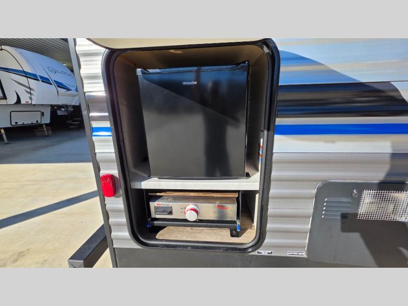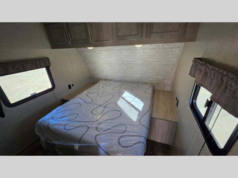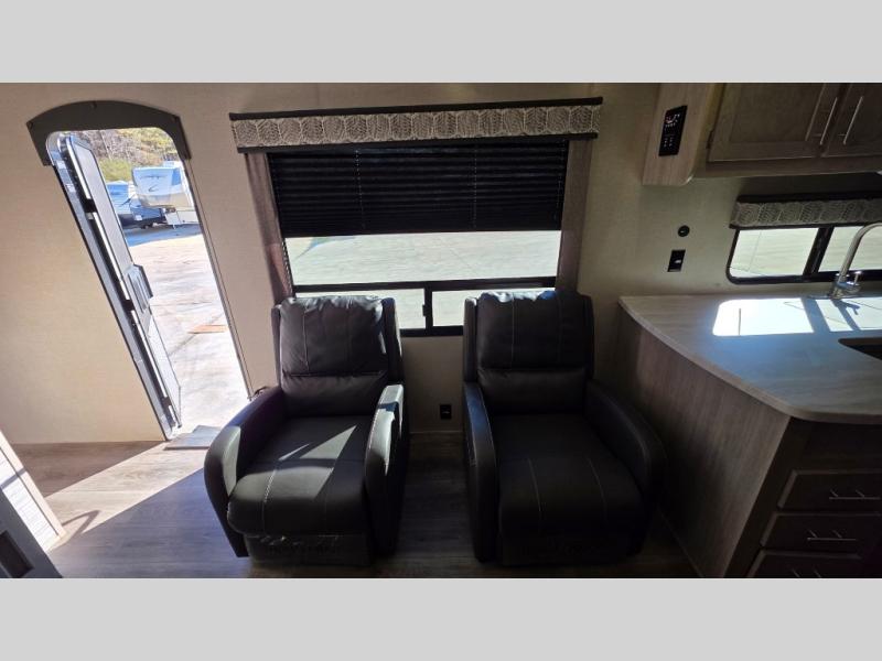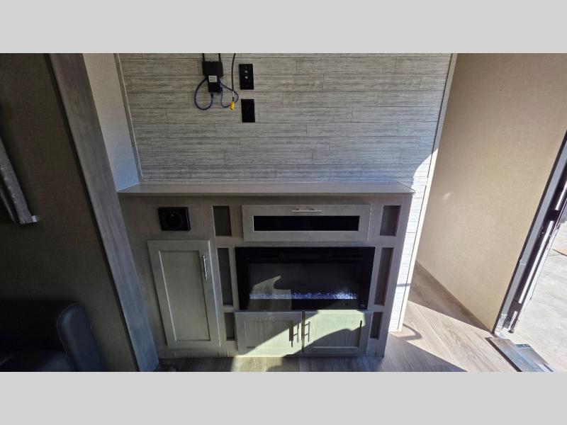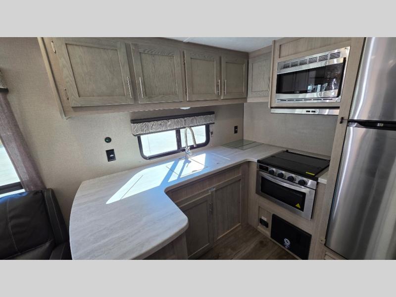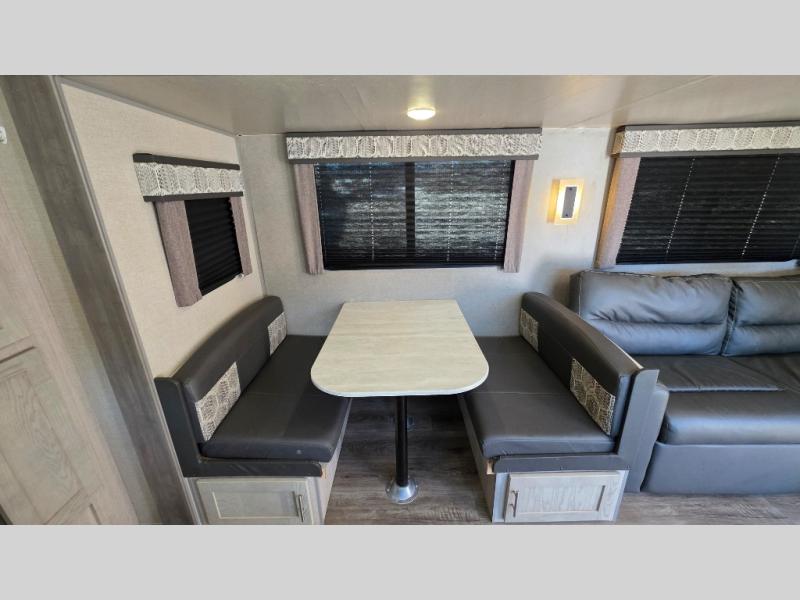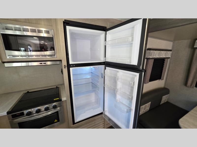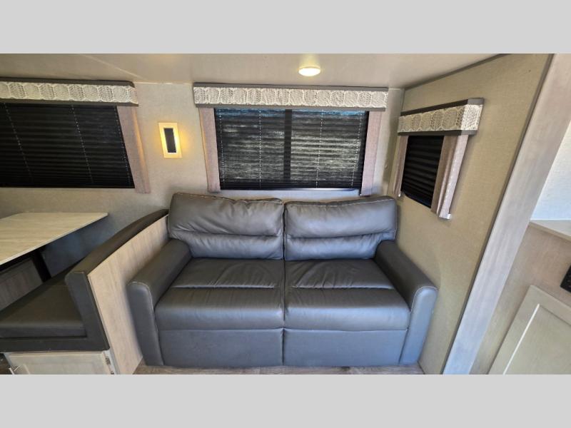 Whether you camp to relax indoors or play outdoors, this trailer offers interior comforts for a couple or a family of four! From the spacious rear kitchen thanks to the large slide out that includes a booth dinette and sofa. Yet you might like to choose the free standing dinette option in place of the booth dinette. The U-shaped counter offers plenty of space to dry dishes and prep meals. There is a 10 cu. ft. refrigerator and pantry for food storage, and everyone can enjoy the entertainment center with a fireplace option below while cooking, cleaning, dining and relaxing. And the recliner lounges will probably be popular seats. At night head to the front bedroom to sleep on the walk-around king bed after stopping off at the full bathroom to get cleaned up.