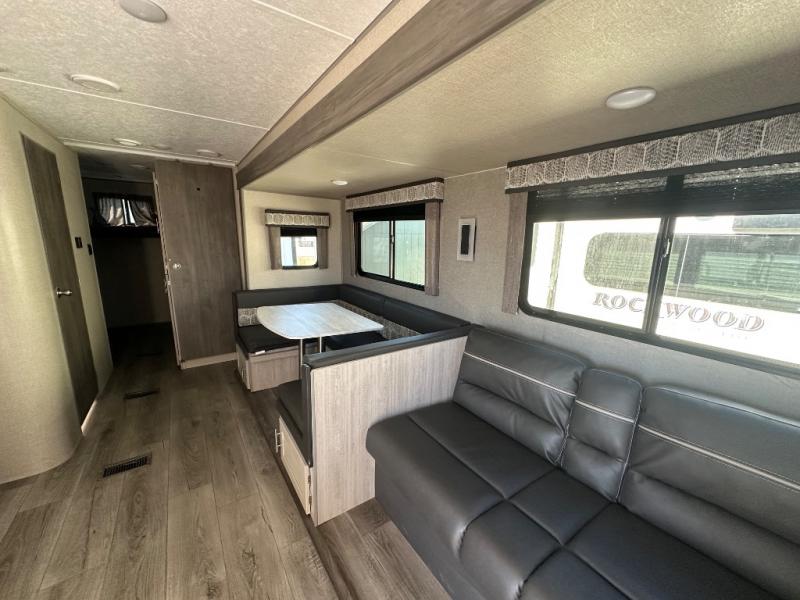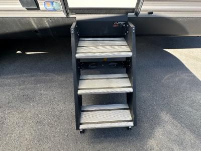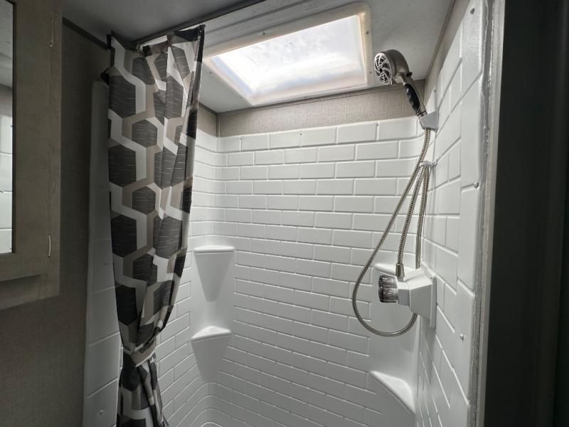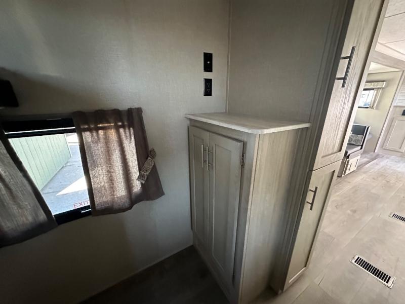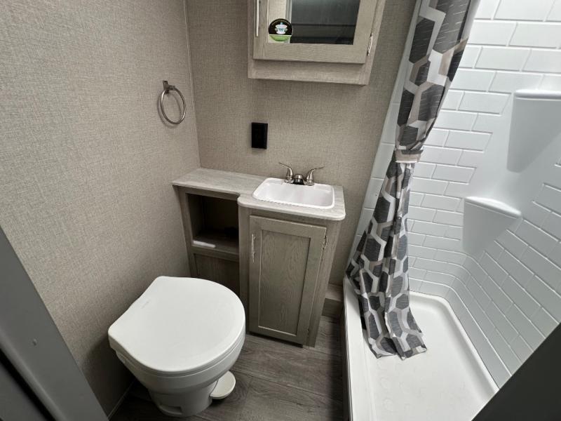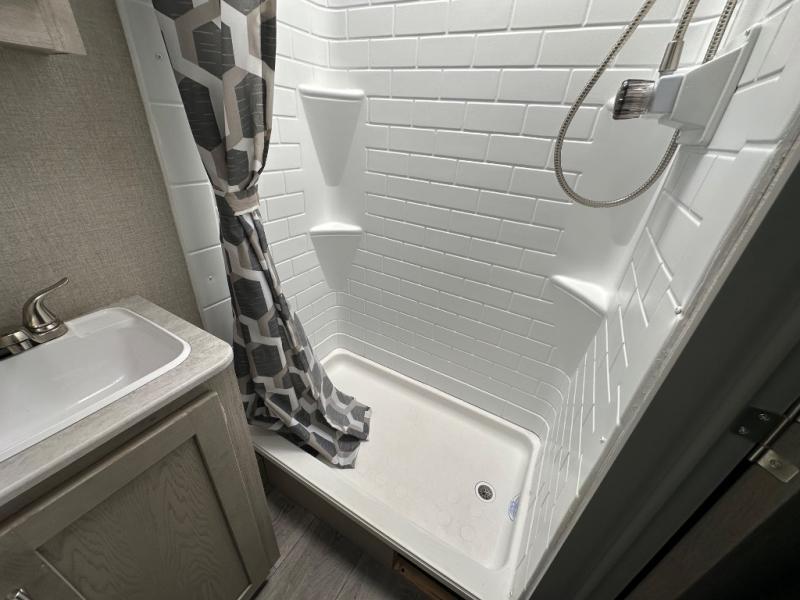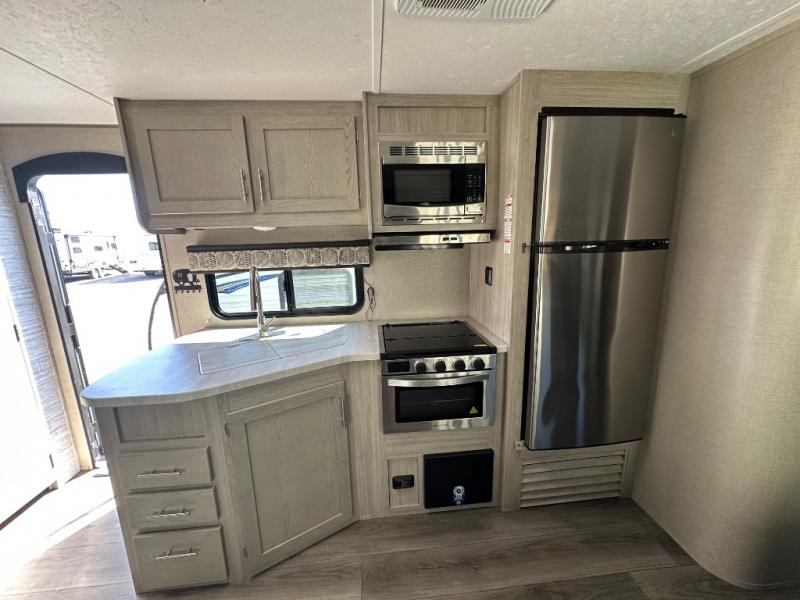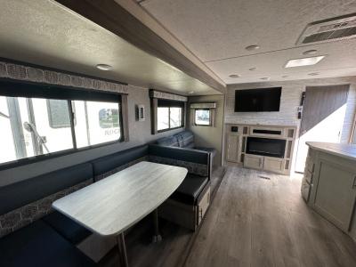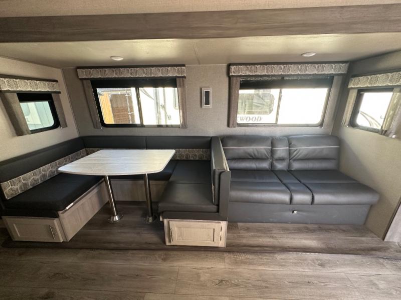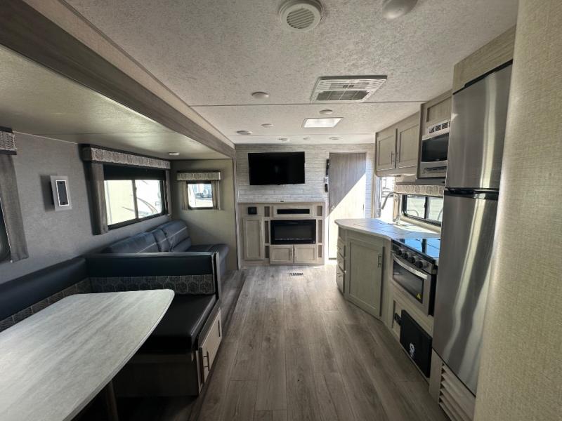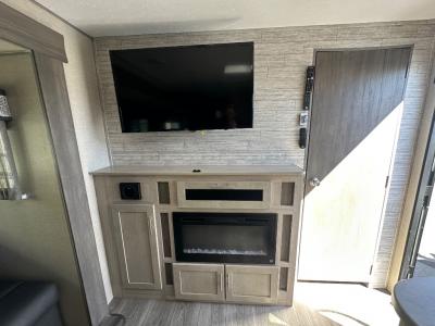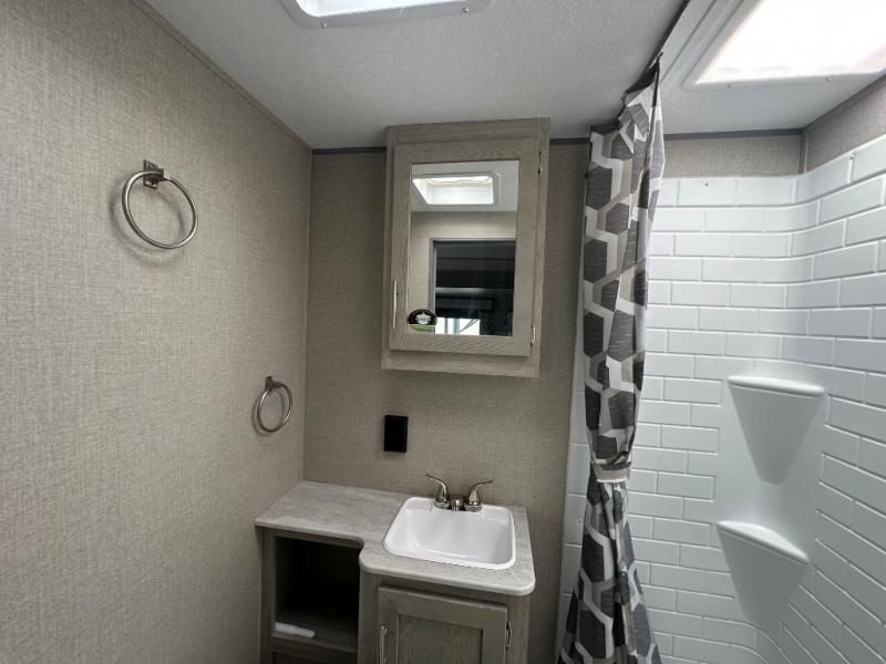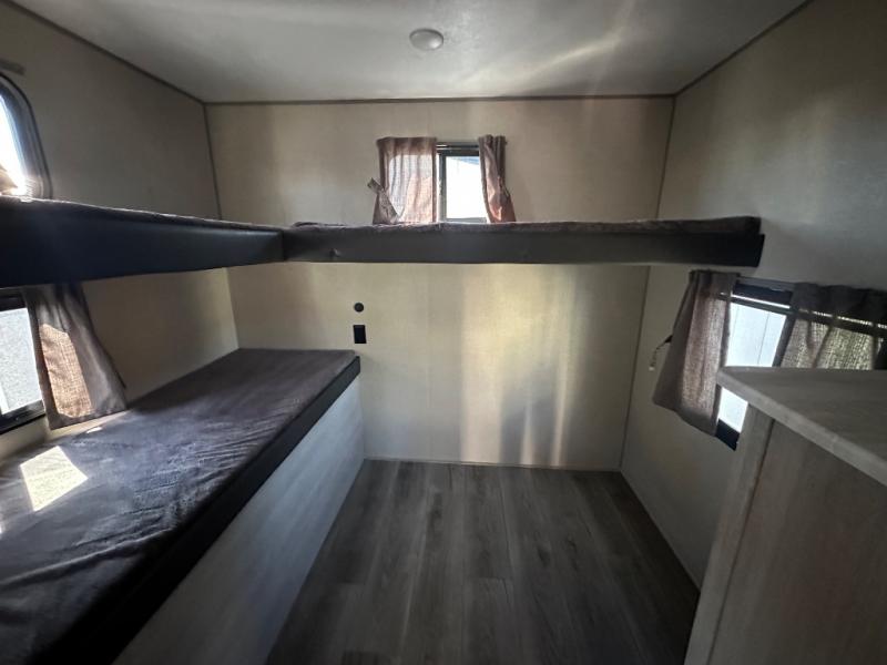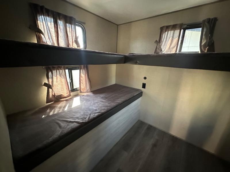 Not only will you be comfortable in this trailer, your friends will have comfort and privacy thanks to having their own bunkhouse, and you'll have a front bedroom where you can sleep like royalty! There are three bunk beds and two COA cube seats plus a location for a TV, a wardrobe, and windows for natural lighting. The combined living and kitchen is spacious thanks to the slide out U-shaped dinette and sofa with drink holders. You can even add the fireplace option if you want that feature. The cook will have full amenities to whip up meals including overhead cabinets for dishes and snacks. And the exterior camper kitchen allows the cook to visit with everyone outside under the 18' electric awning that includes multicolor LED lights with a remote.