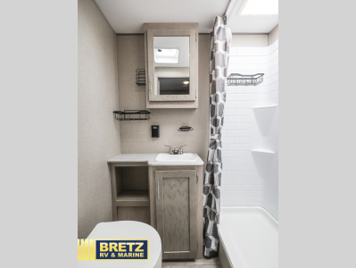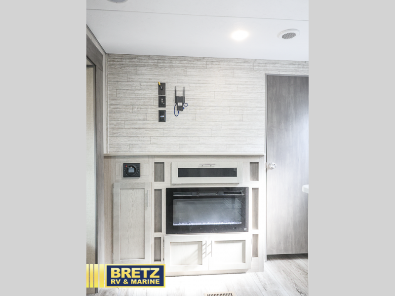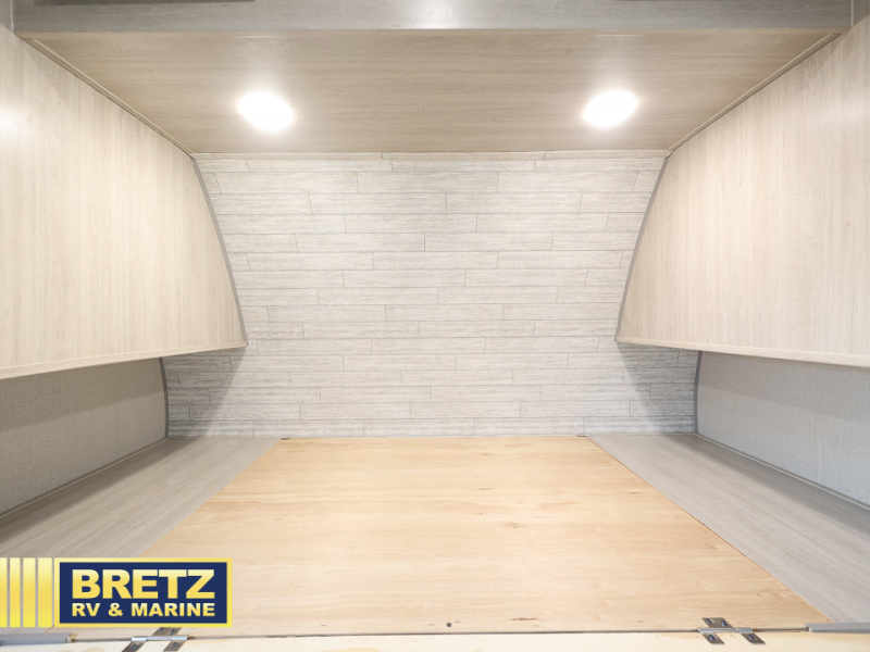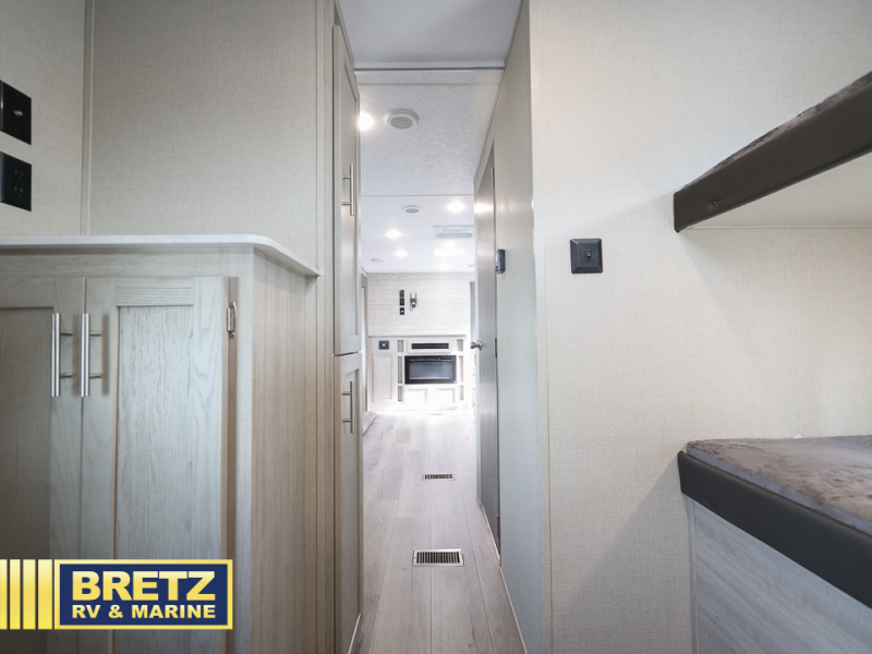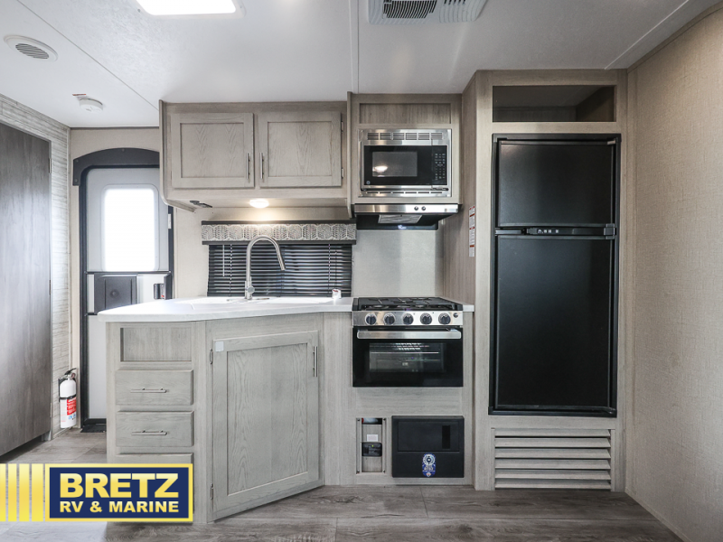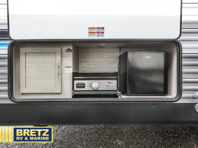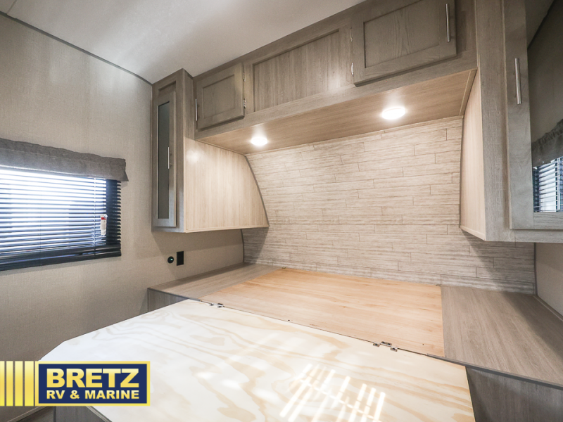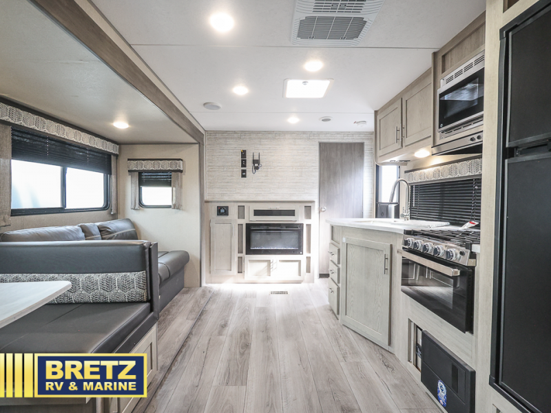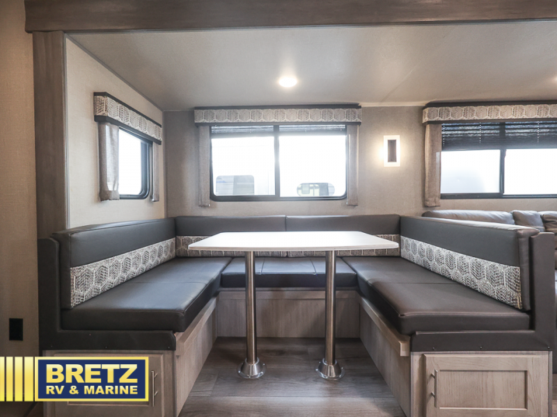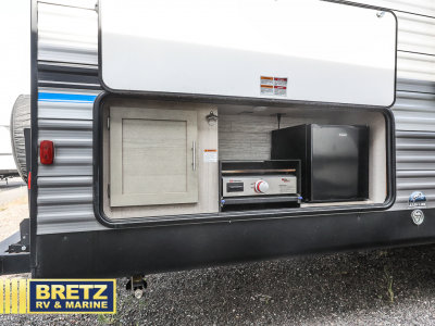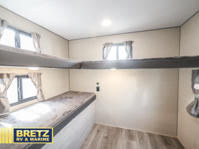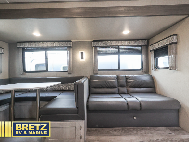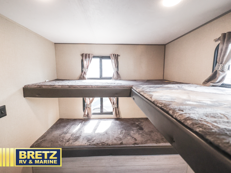 Not only will you be comfortable in this trailer, your friends will have comfort and privacy thanks to having their own bunkhouse, and you'll have a front bedroom where you can sleep like royalty! There are three bunk beds and two COA cube seats plus a location for a TV, a wardrobe, and windows for natural lighting. The combined living and kitchen is spacious thanks to the slide out U-shaped dinette and sofa with drink holders. You can even add the fireplace option if you want that feature. The cook will have full amenities to whip up meals including overhead cabinets for dishes and snacks. And the exterior camper kitchen allows the cook to visit with everyone outside under the 18' electric awning that includes multicolor LED lights with a remote.