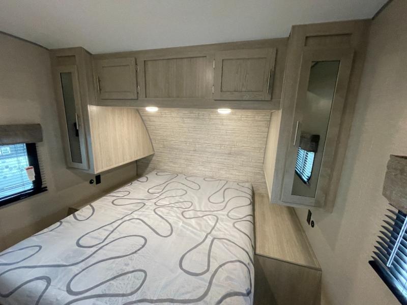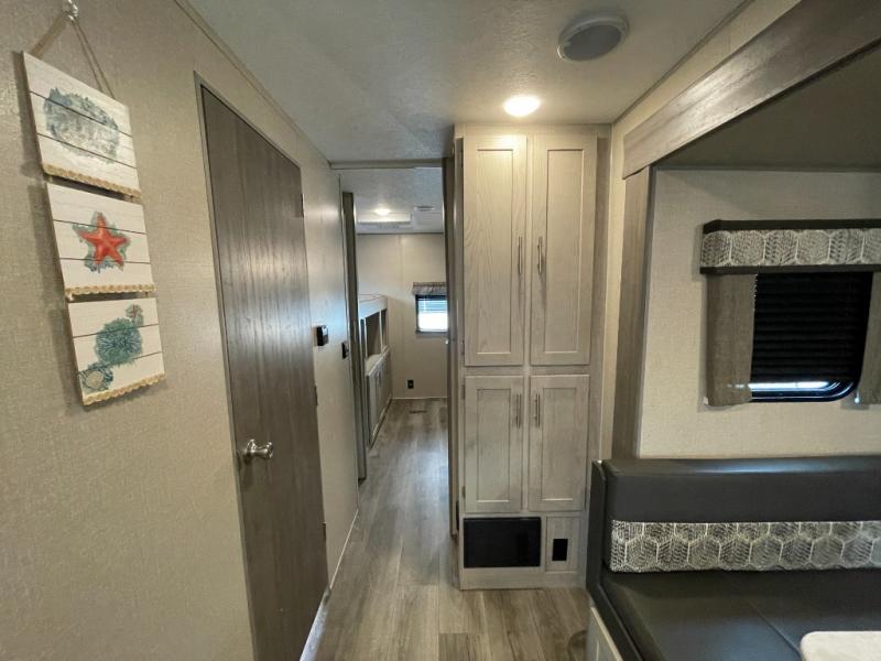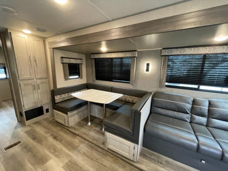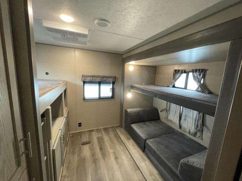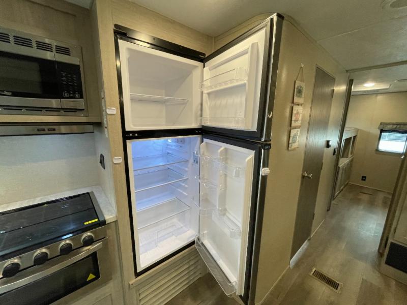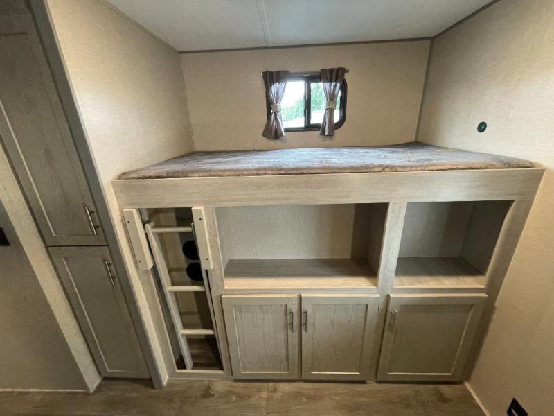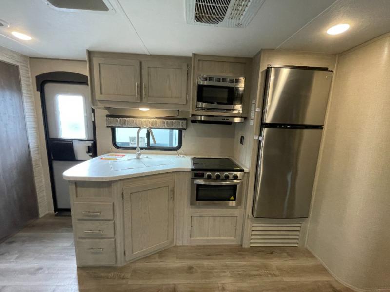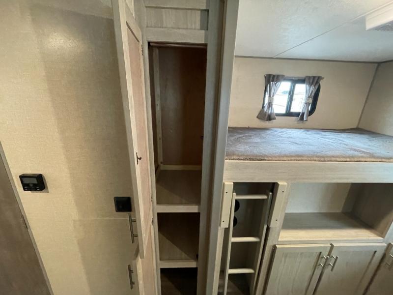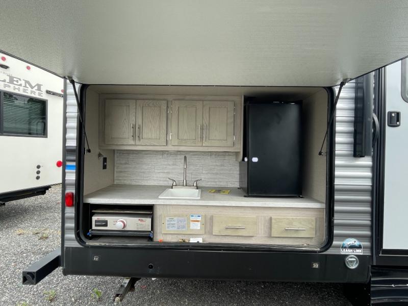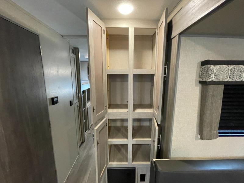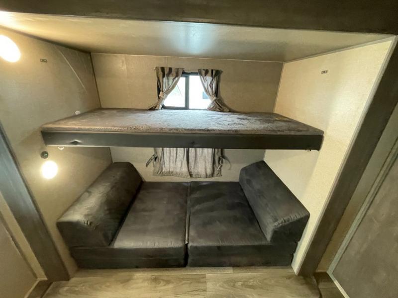 When you enjoy hiking, biking, and fishing, and waking up to beautiful scenery from your own comforts, then start camping with this trailer at the campsite! You will be able to sleep like a queen on the walk-around bed with dual wardrobes and overhead storage for more items in the front private bedroom while your family or friends have their own privacy in the bunkhouse complete with two bunks, two COA cube futons and plenty of storage. The full bathroom includes the second entry/exit door for convenience when outside under the 21' electric awning with multicolor LED lights, or while cooking using the full size camper kitchen along the exterior. There are full kitchen amenities inside including a 10 cu. ft. refrigerator and a pantry.