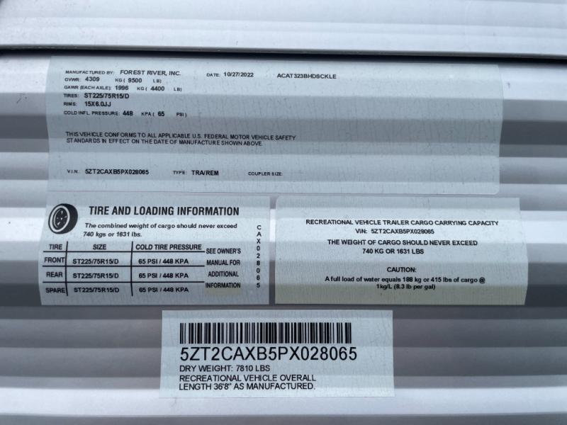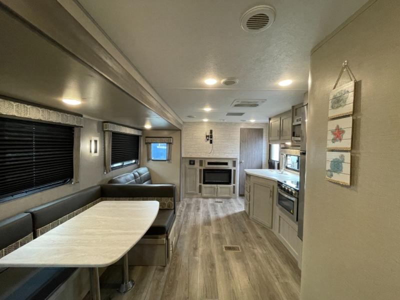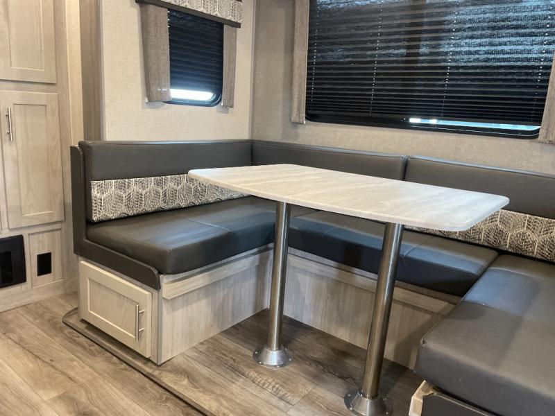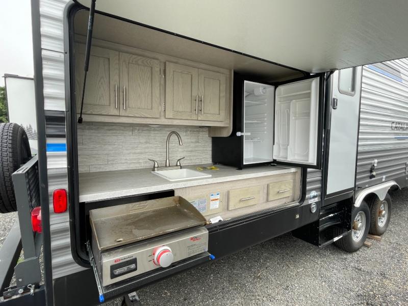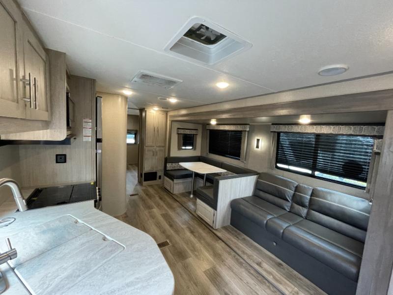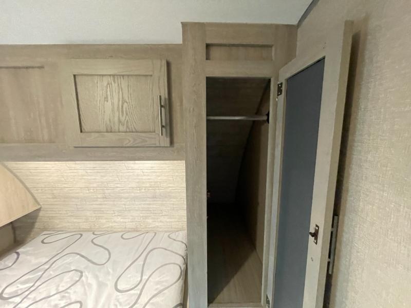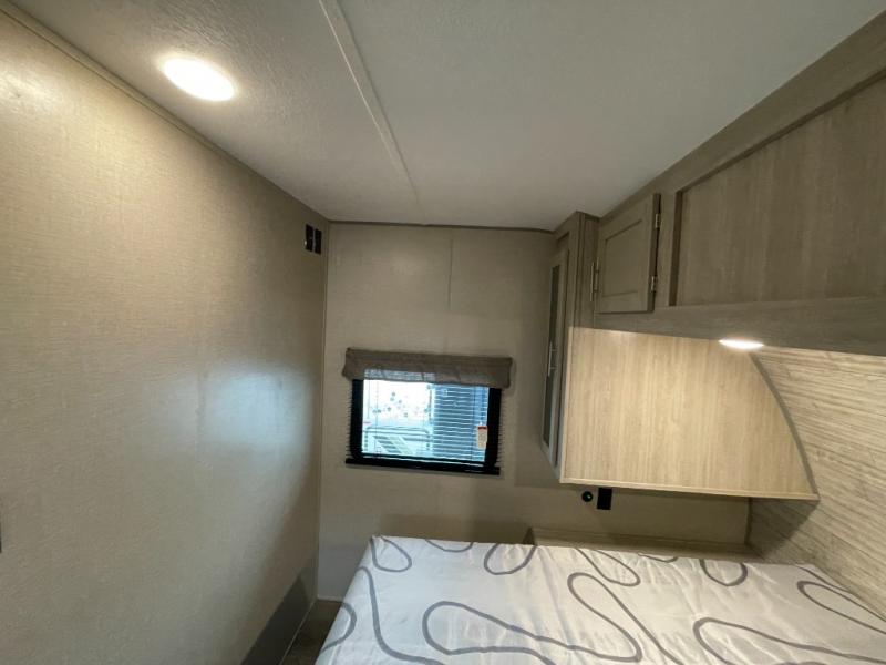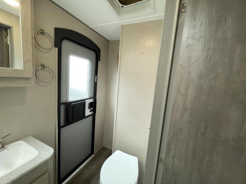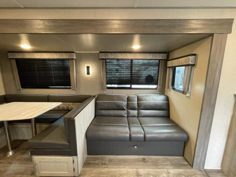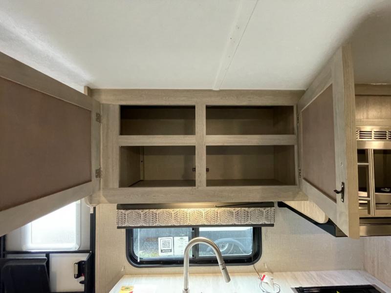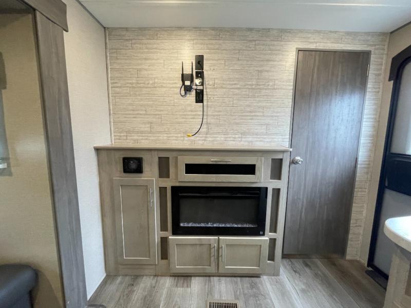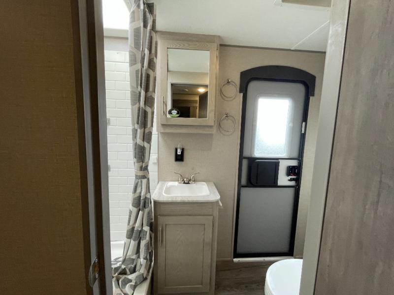 When you enjoy hiking, biking, and fishing, and waking up to beautiful scenery from your own comforts, then start camping with this trailer at the campsite! You will be able to sleep like a queen on the walk-around bed with dual wardrobes and overhead storage for more items in the front private bedroom while your family or friends have their own privacy in the bunkhouse complete with two bunks, two COA cube futons and plenty of storage. The full bathroom includes the second entry/exit door for convenience when outside under the 21' electric awning with multicolor LED lights, or while cooking using the full size camper kitchen along the exterior. There are full kitchen amenities inside including a 10 cu. ft. refrigerator and a pantry.