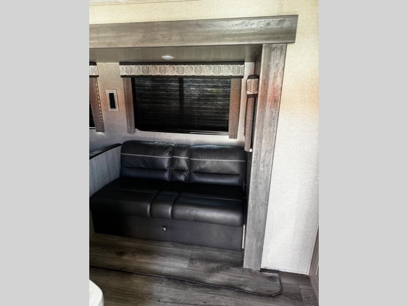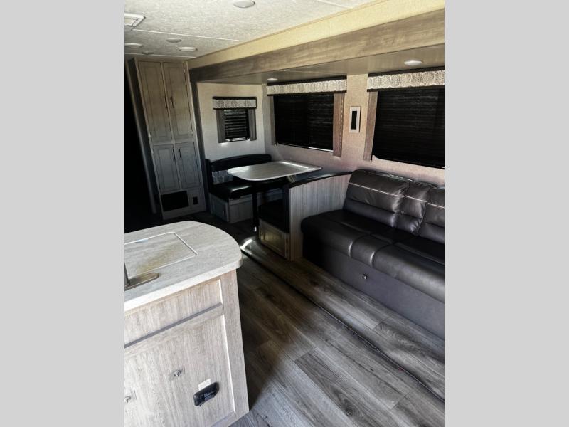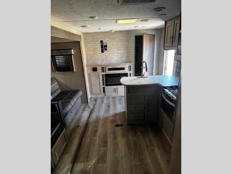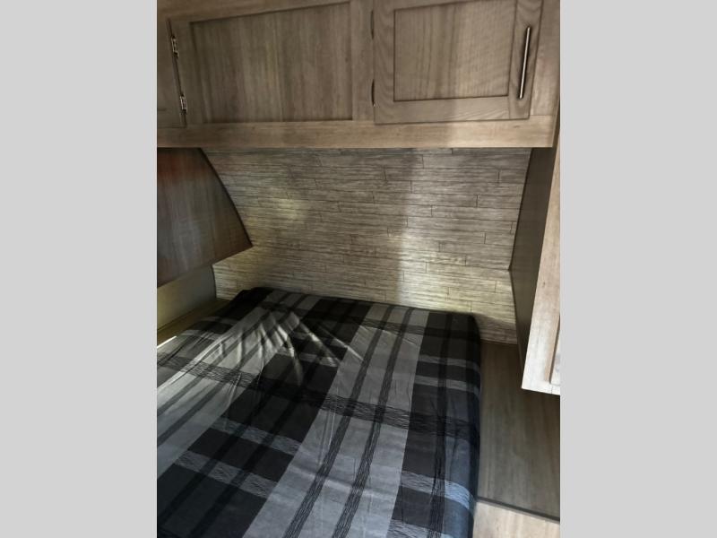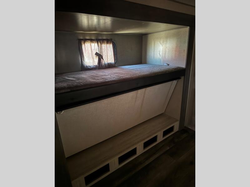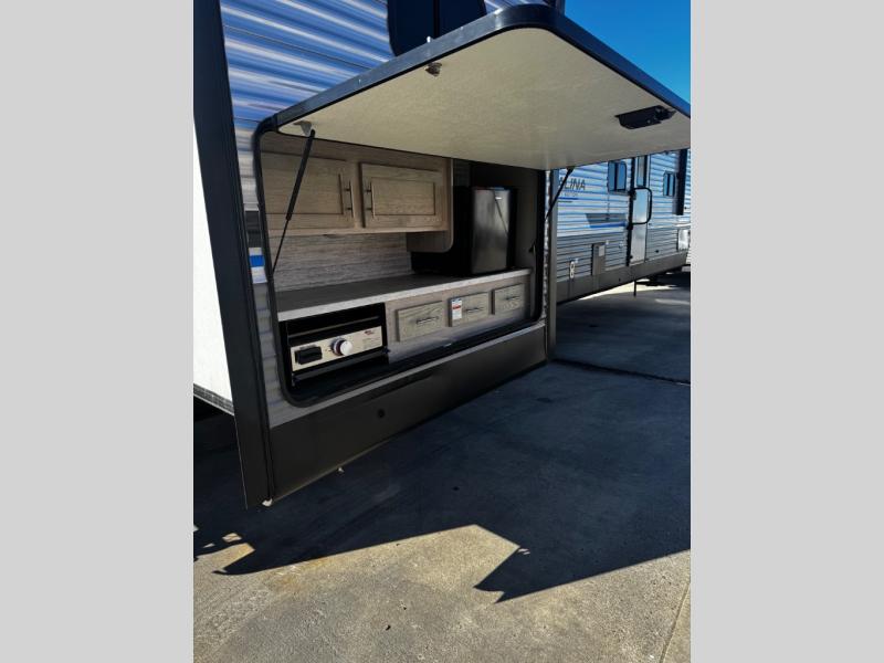 This spacious trailer allows you to unwind and relax indoors after exploring outdoors. Easily setup at the campsite, and enjoy! The rear private bunkhouse offers triple bunks, plus COA cube futon seating, as well as a flip-up table, two closets and an entertainment center. And there are two slides that provide more floor space. Your private bedroom is up front on the opposite side, and offers a walk-around queen bed, dual wardrobes and windows for some natural lighting and views. The main living and kitchen area has another slide with a booth dinette and sofa, plus there is an entertainment center with fireplace option. The kitchen amenities include an L-shaped counter, a pantry for dry goods, and everything you need to make warm meals and store leftovers. And there is a full size camper kitchen along the exterior and an electric awning with multicolor LED strip.