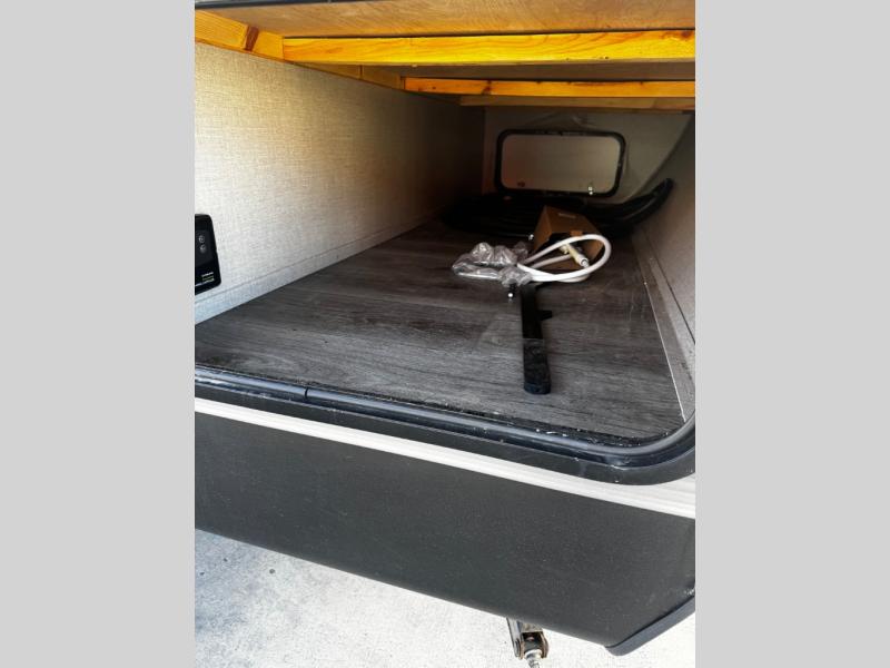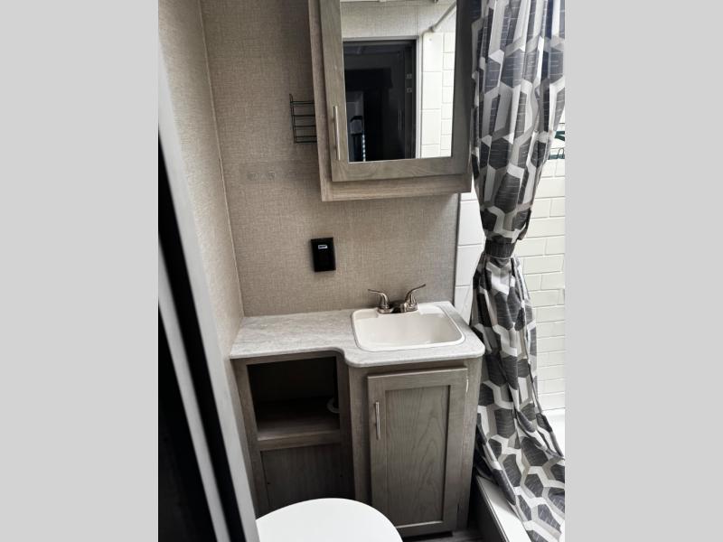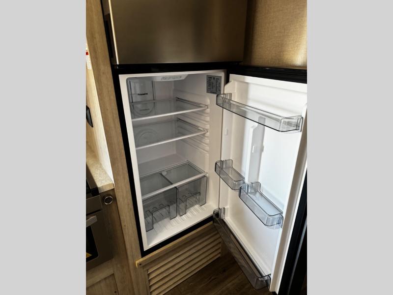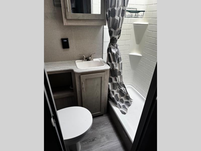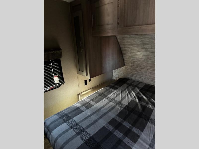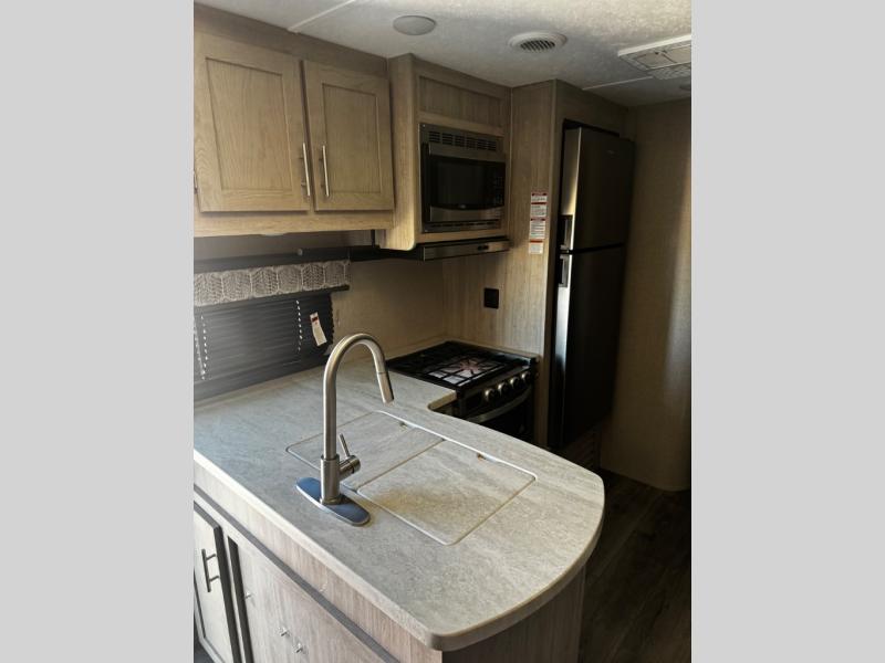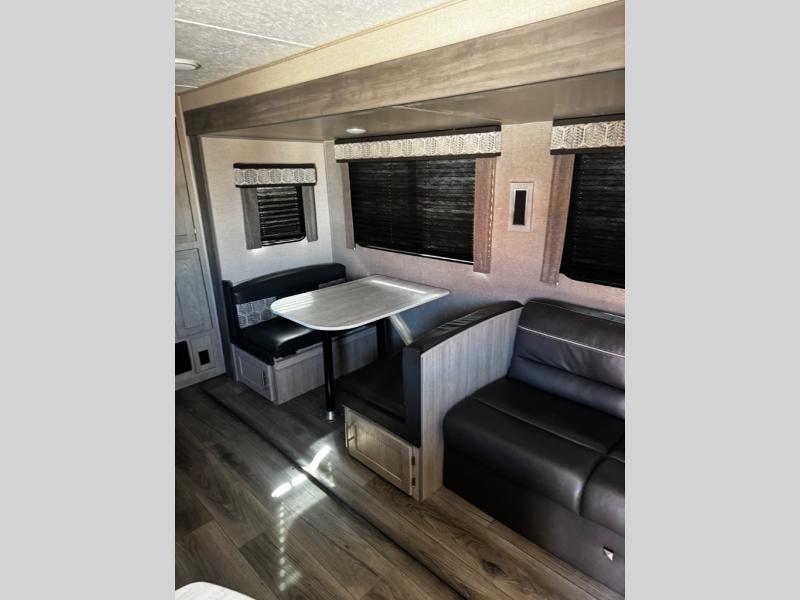 This spacious trailer allows you to unwind and relax indoors after exploring outdoors. Easily setup at the campsite, and enjoy! The rear private bunkhouse offers triple bunks, plus COA cube futon seating, as well as a flip-up table, two closets and an entertainment center. And there are two slides that provide more floor space. Your private bedroom is up front on the opposite side, and offers a walk-around queen bed, dual wardrobes and windows for some natural lighting and views. The main living and kitchen area has another slide with a booth dinette and sofa, plus there is an entertainment center with fireplace option. The kitchen amenities include an L-shaped counter, a pantry for dry goods, and everything you need to make warm meals and store leftovers. And there is a full size camper kitchen along the exterior and an electric awning with multicolor LED strip.