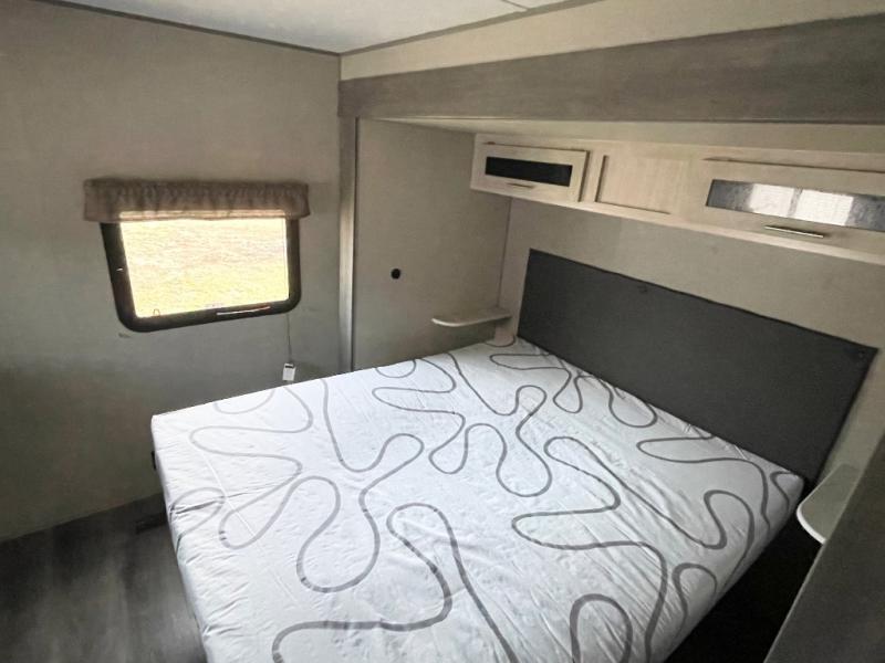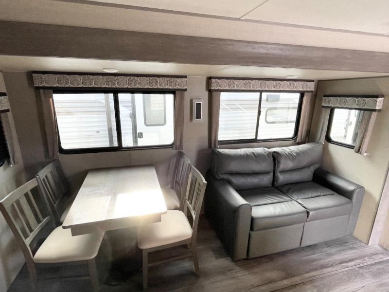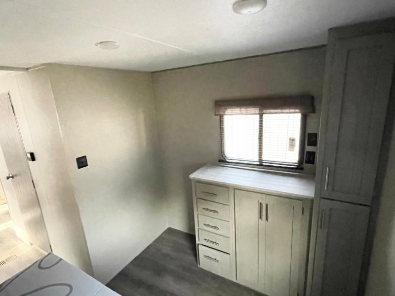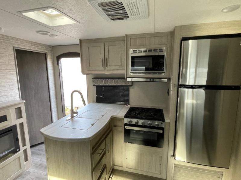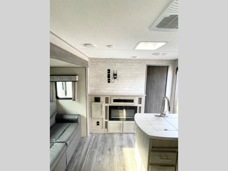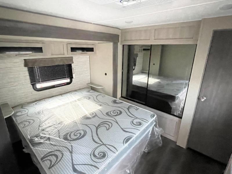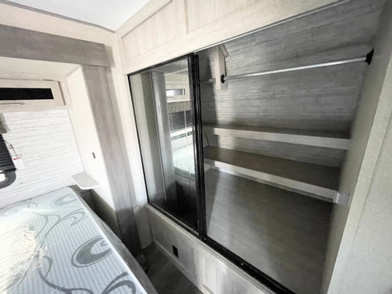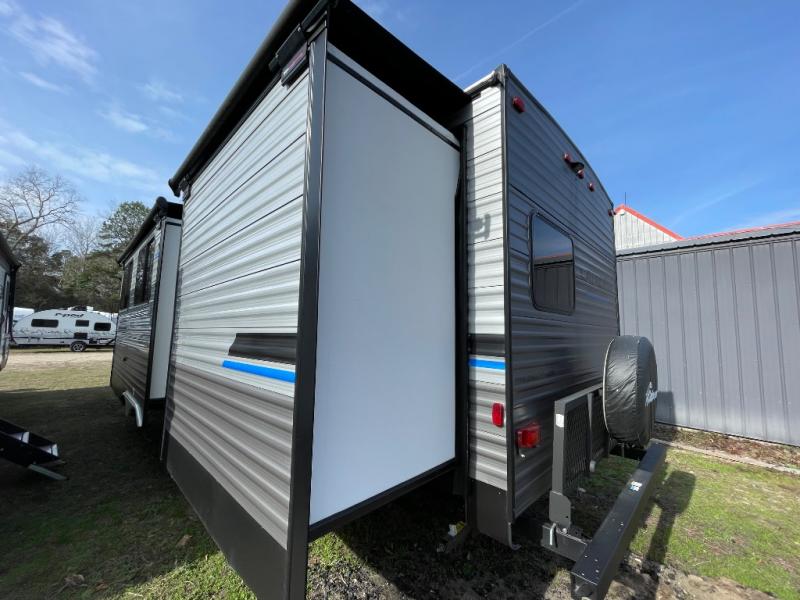 This family-friendly trailer offers lots of floor space thanks to the triple slides throughout! You and your family will love the combined living and kitchen area with a slide out booth dinette and a sofa with drink holders. The L-shaped kitchen counter allows the cook to make meals without moving for anyone trying to get to the full bathroom or the rear bunkhouse. The kids will have their own privacy, two bunk beds, a COA cube futon and the slide offers more floor space to spread out. The front private bedroom allows you to sleep like a queen, and offers a large closet for your clothing and another closet prepped for a washer/dryer. And don't forget about the full size camper kitchen and the 21' power awning with multicolor LED lights when you are outside.