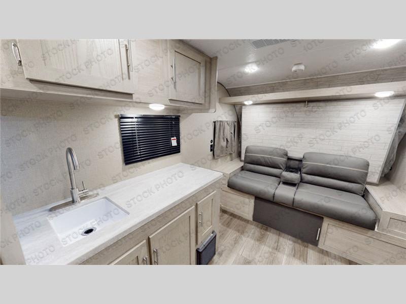 Camping for two, anyone? This cute Catalina Summit Series 7 is the perfect camper that provides you with both a living space and a sleeping space all while keeping it under 20'. This unit comes in at 19' 6" to be exact, and with the 60" x 74" Murphy bed layout you can have both a comfortable place to sleep at night, and during the day it's all tucked away behind a wall and a sofa sits in its place. You don't even have to make the bed! A rear bath offers a 36" x 30" shower, toilet, and linen cabinet for your towels and toiletries. The sink is just outside the bathroom door on your left. For cooking inside, you will have a two burner cooktop and a microwave oven, plus plenty of solid surface countertop prep space. On the outside, a 10' power awning with multicolored LED light strip will make a wonderful outdoor living space to enjoy both during the day and at night keeping you protected from the elements. And, the large front pass-through storage space allows you to take along all of your necessities to have a great time.