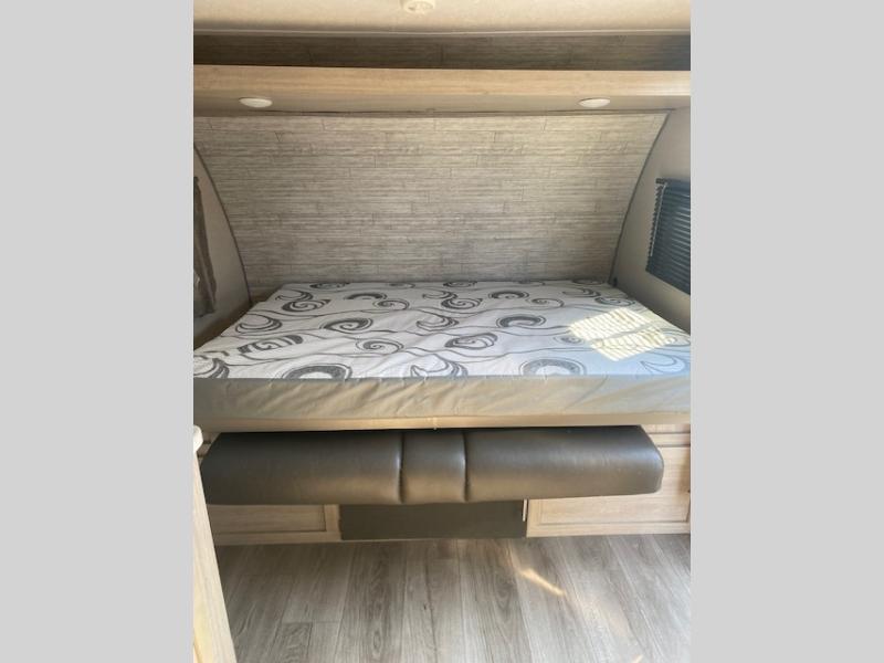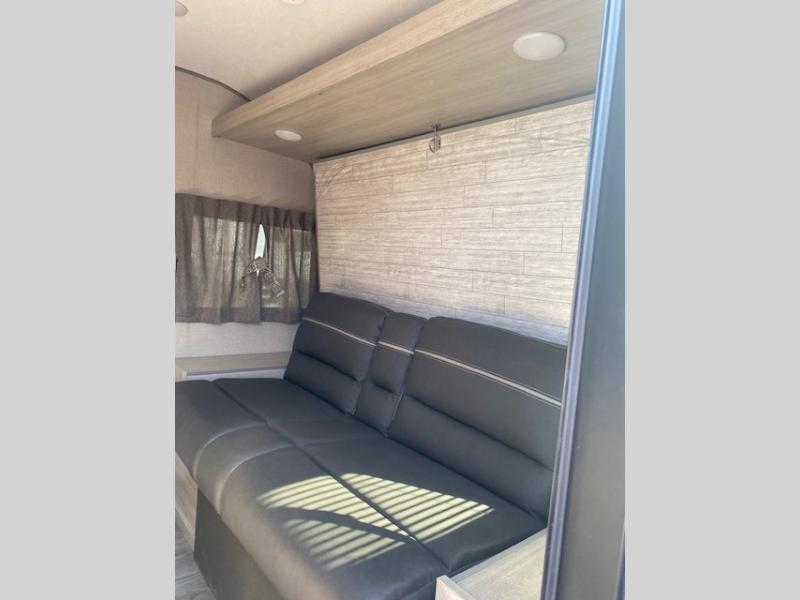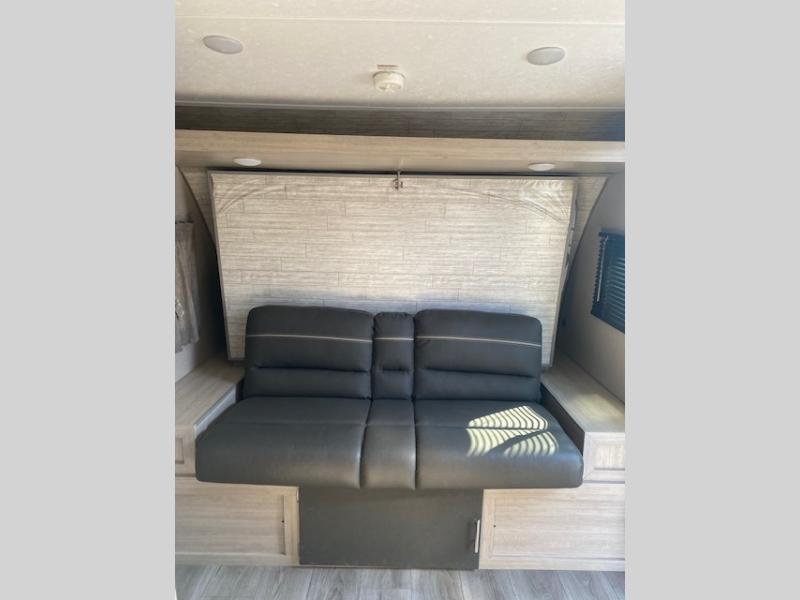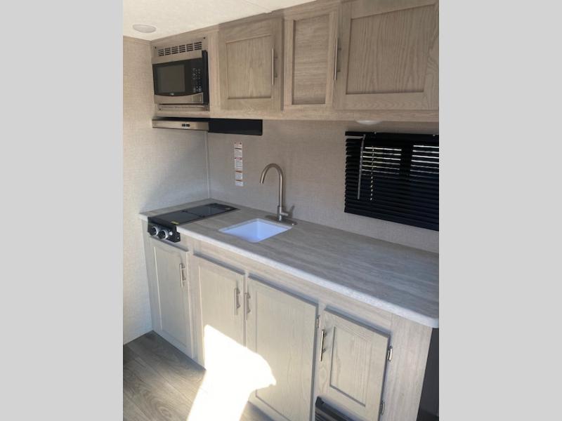 Camping for two, anyone? This cute Catalina Summit Series 7 is the perfect camper that provides you with both a living space and a sleeping space all while keeping it under 20'. This unit comes in at 19' 6" to be exact, and with the 60" x 74" Murphy bed layout you can have both a comfortable place to sleep at night, and during the day it's all tucked away behind a wall and a sofa sits in its place. You don't even have to make the bed! A rear bath offers a 36" x 30" shower, toilet, and linen cabinet for your towels and toiletries. The sink is just outside the bathroom door on your left. For cooking inside, you will have a two burner cooktop and a microwave oven, plus plenty of solid surface countertop prep space. On the outside, a 10' power awning with multicolored LED light strip will make a wonderful outdoor living space to enjoy both during the day and at night keeping you protected from the elements. And, the large front pass-through storage space allows you to take along all of your necessities to have a great time.