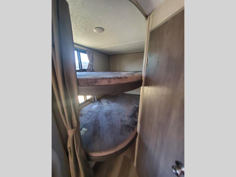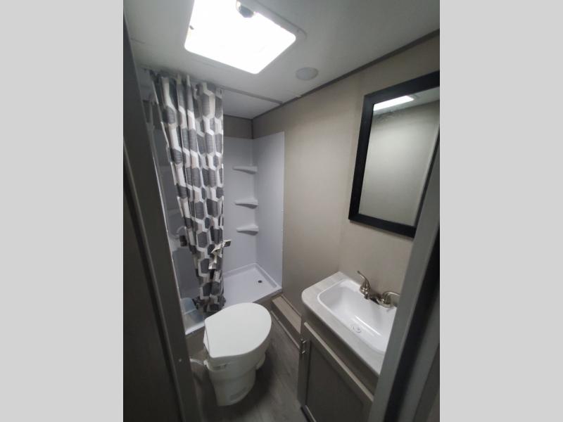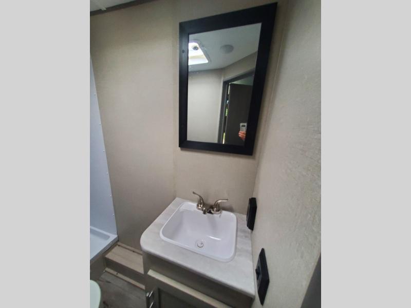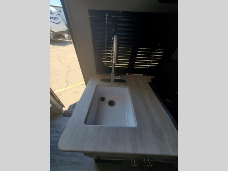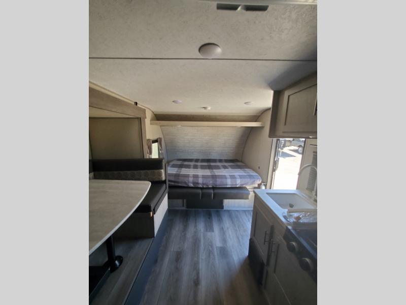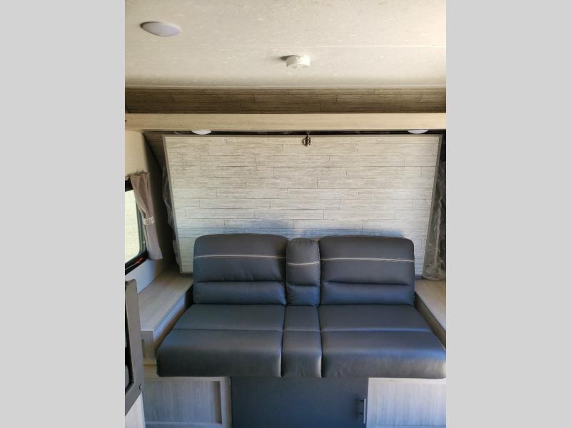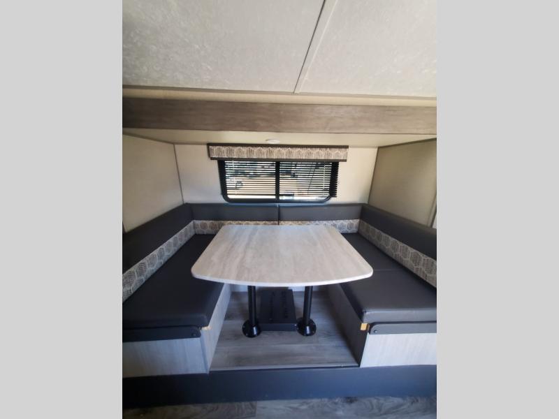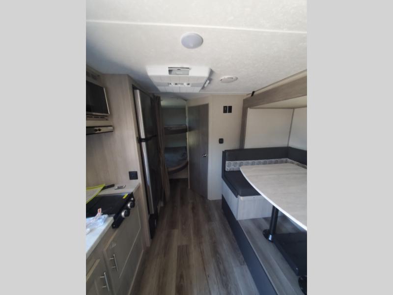 This trailer is easy to tow, store, and maneuver at campgrounds into parking spots! After a day of exploring, everyone can enjoy napping or falling asleep on the double-size bunks next to the full bathroom, or on the Murphy bed up front. This front multi-use space offers both a living area and bedroom depending on the time of day. The U-shaped dinette gives everyone a place to dine inside, or you can head outside to grab your camping chairs from the pass-through storage and dine under the 15' power awning with your choice of LED color. There is much more to enjoy inside and outside, and you might like to add the optional camper kitchen as well.
