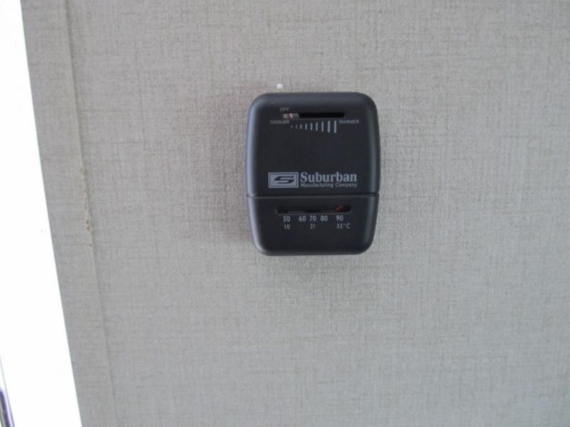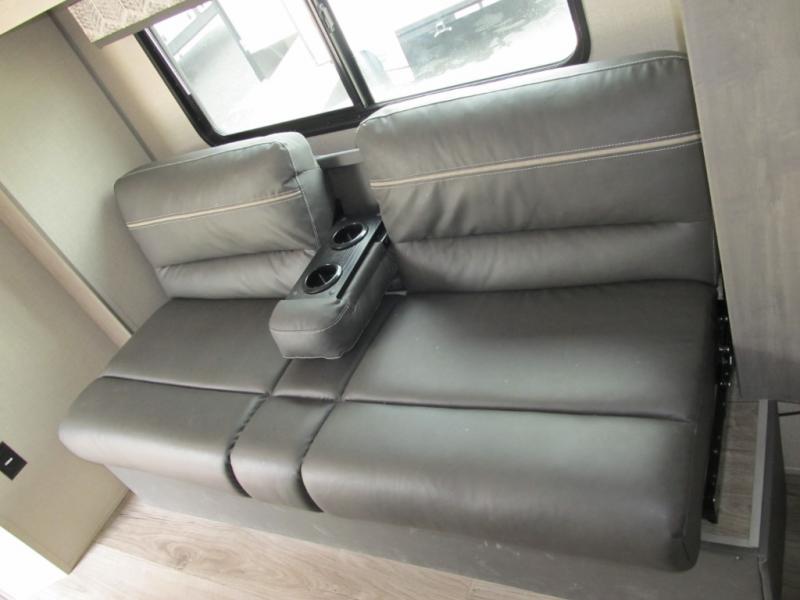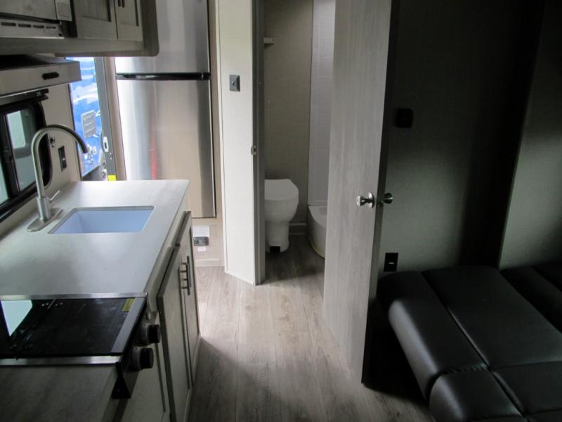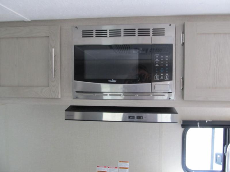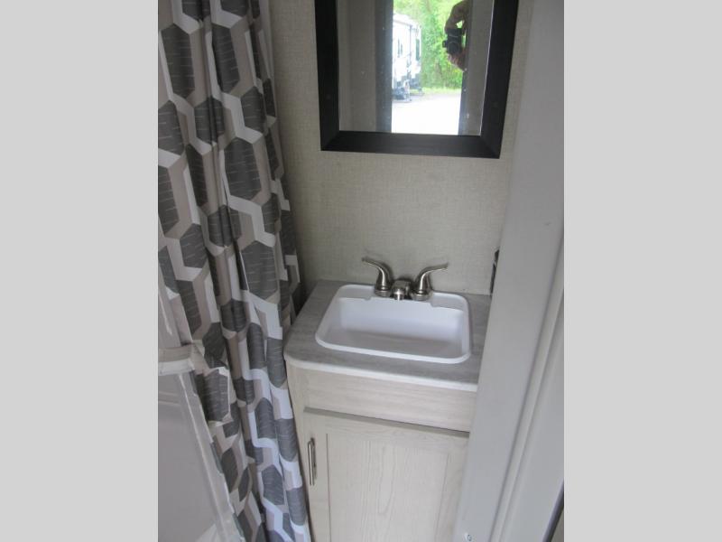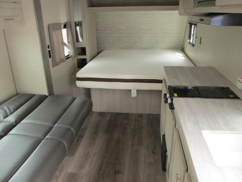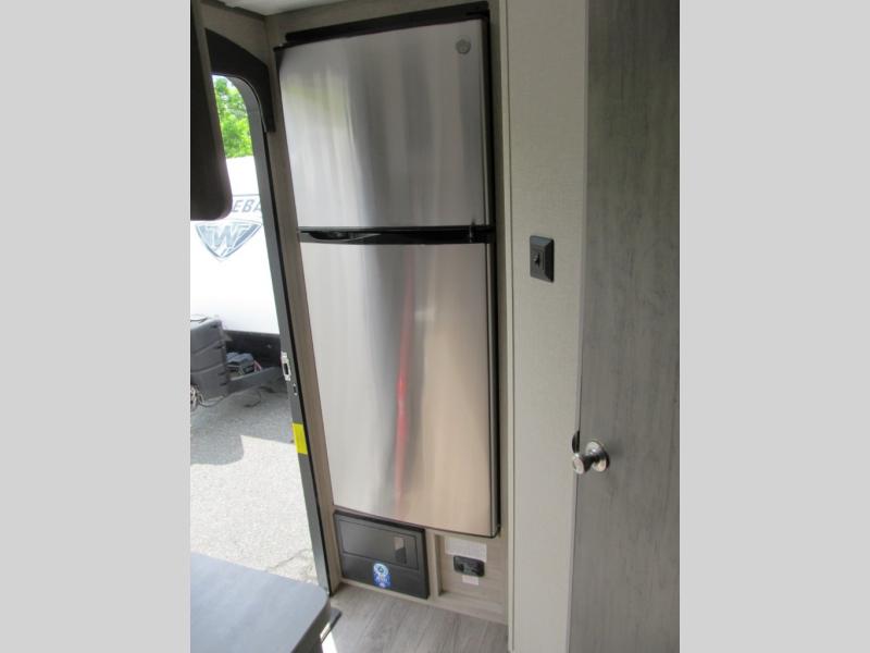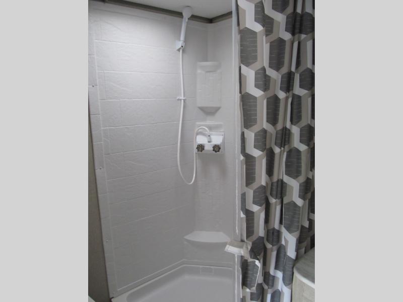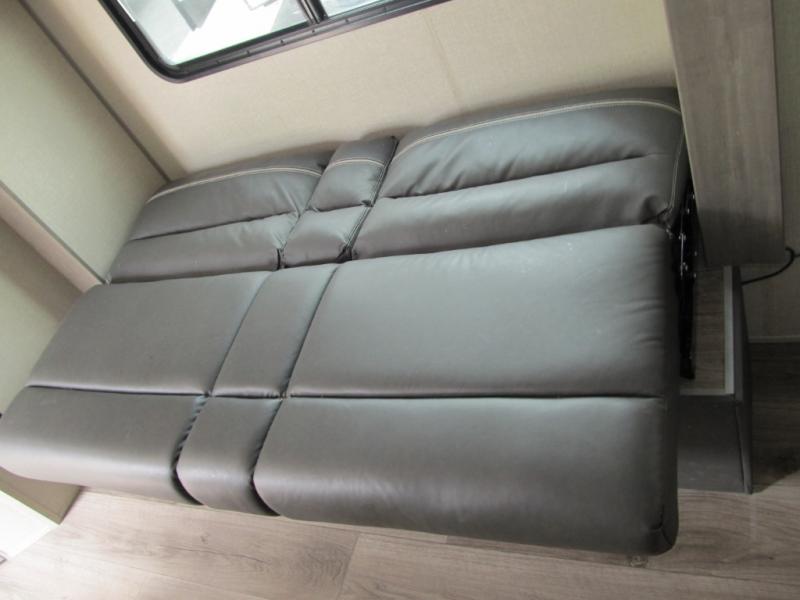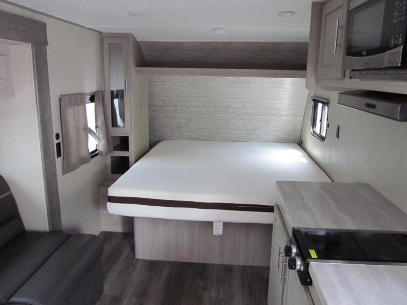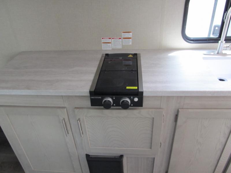When you're ready to escape the hustle and bustle of the city life, head to the woods in this cozy travel trailer for two or four. The sofa slide out with a table will provide a place to relax, eat, and even sleep an overnight guest. Preparing at-home meals each day will be a breeze with a two burner cooktop and a microwave oven, plus there is ample counter space for your work in the kitchen. The spacious full bath on board means you won't have to use the camp's facilities, and the front queen bed will make this model feel just like home. After dinner is cleaned up, head outdoors to relax under the 15' electric awning with multicolored LED lights and a remote. Camping has never been easier!