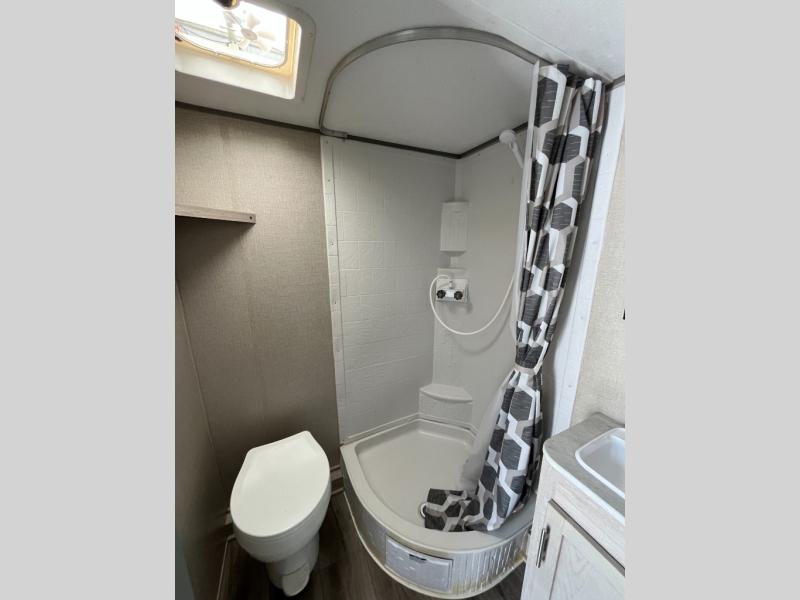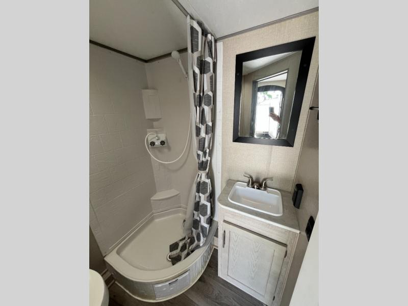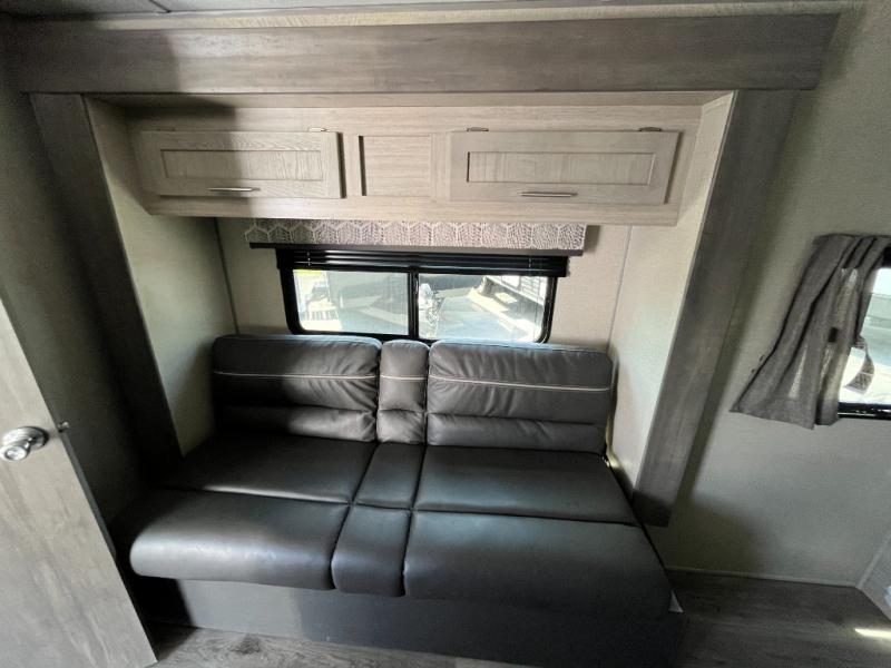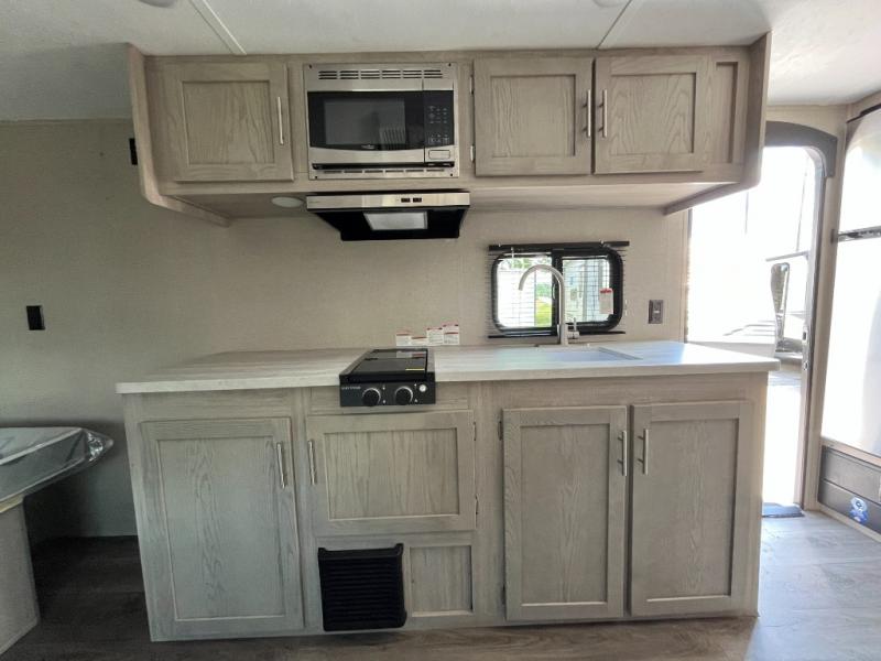 When you're ready to escape the hustle and bustle of the city life, head to the woods in this cozy travel trailer for two or four. The sofa slide out with a table will provide a place to relax, eat, and even sleep an overnight guest. Preparing at-home meals each day will be a breeze with a two burner cooktop and a microwave oven, plus there is ample counter space for your work in the kitchen. The spacious full bath on board means you won't have to use the camp's facilities, and the front queen bed will make this model feel just like home. After dinner is cleaned up, head outdoors to relax under the 15' electric awning with multicolored LED lights and a remote. Camping has never been easier!