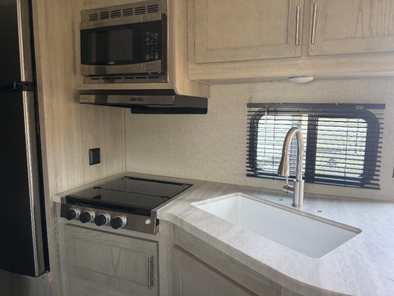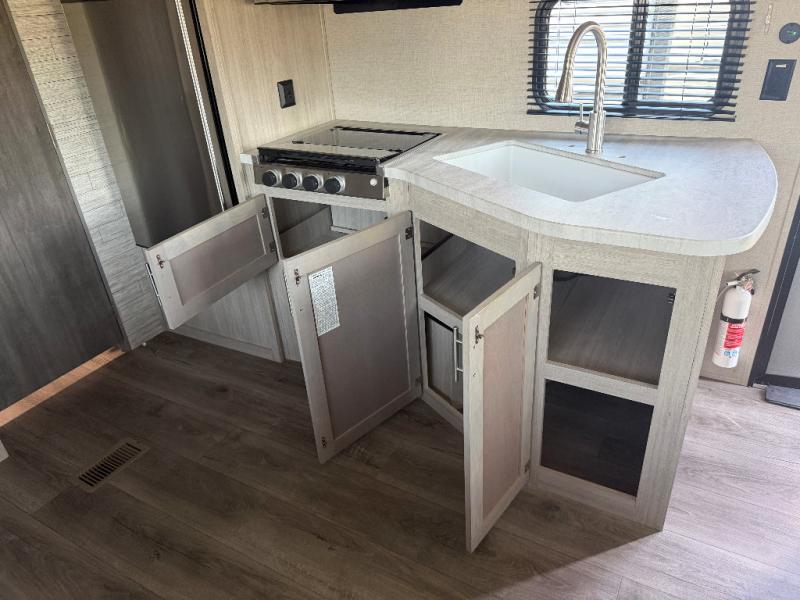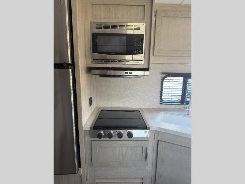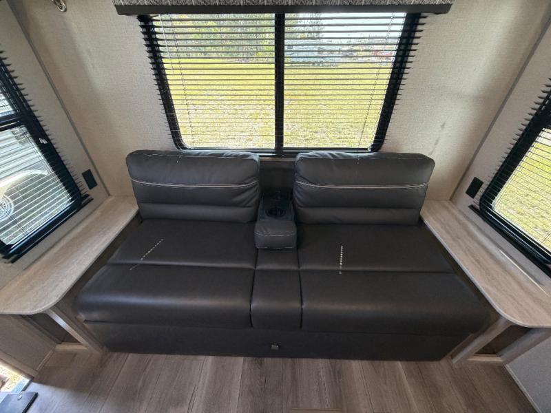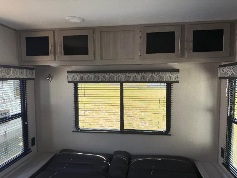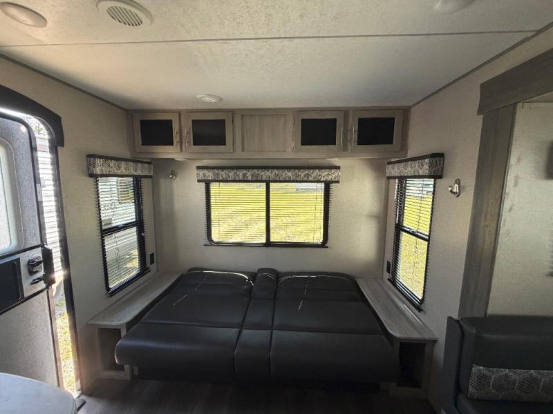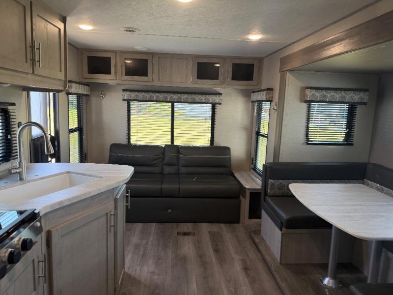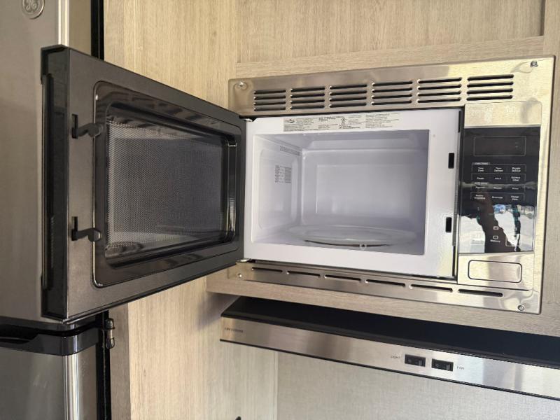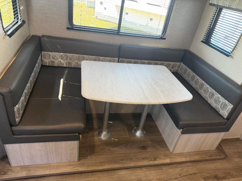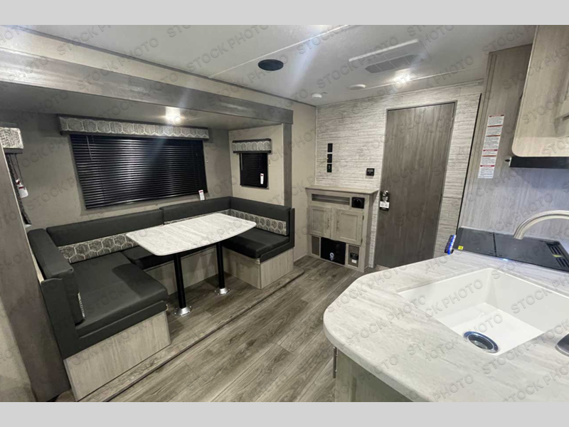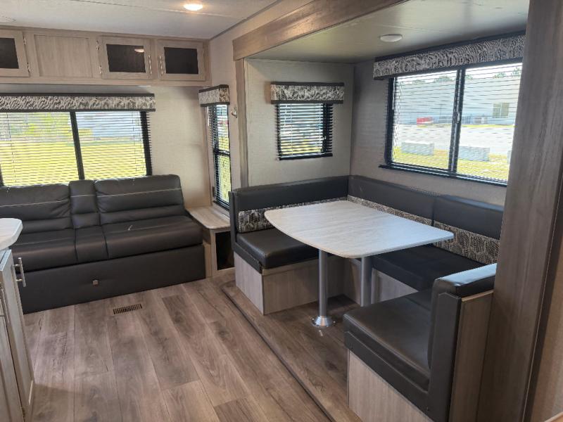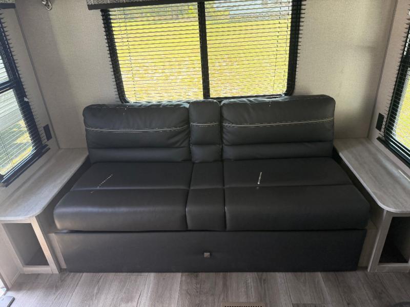 You and your spouse will love the layout of this trailer with a walk-through bathroom which is convenient for you when you are in the front bedroom, and handy for your guests when they stay overnight on the jiffy sofa. The sofa includes dual end tables to set your drink on, and the U-shaped dinette will be perfect to dine around or play games at. The galley kitchen offers all the appliances needed to make all your meals, such as a three burner cooktop, a stainless steel microwave, plus a 10 cu. ft. 12V refrigerator. You will have your own side of the walk-around queen bed and a wardrobe, as well as USB ports and 110V outlets in the nightstands.