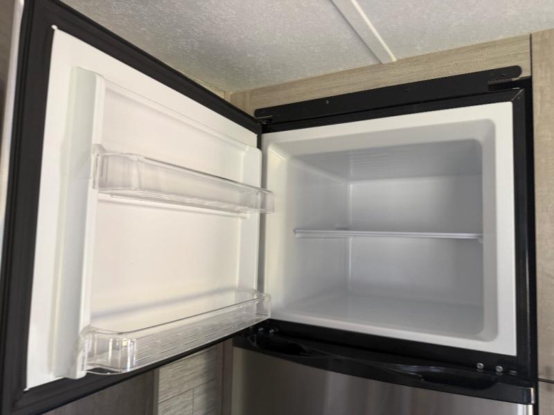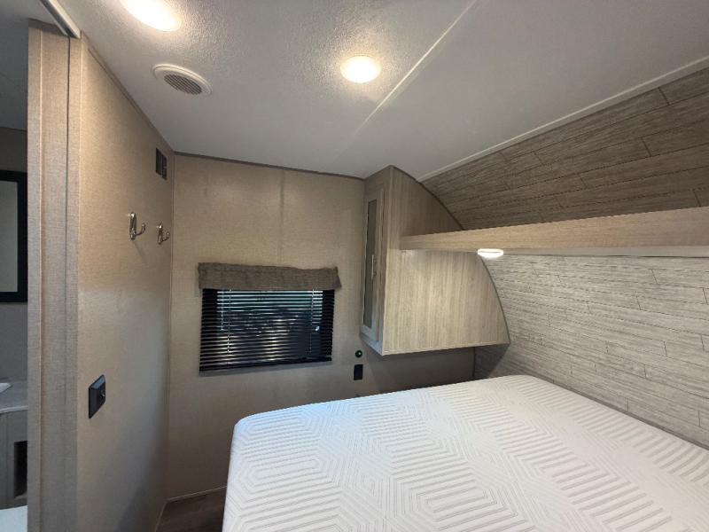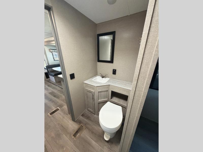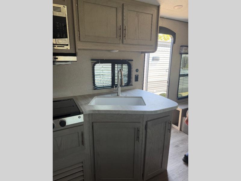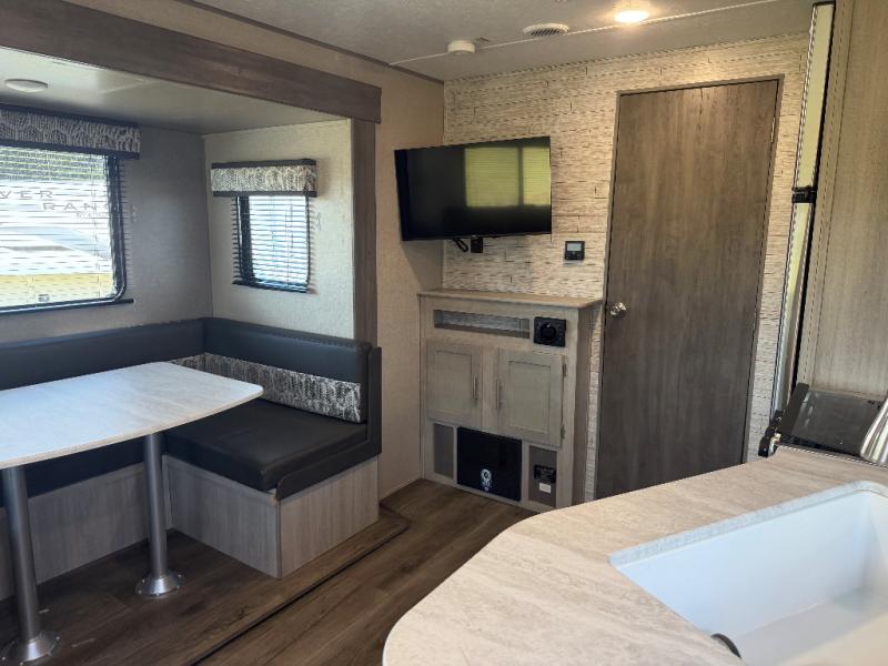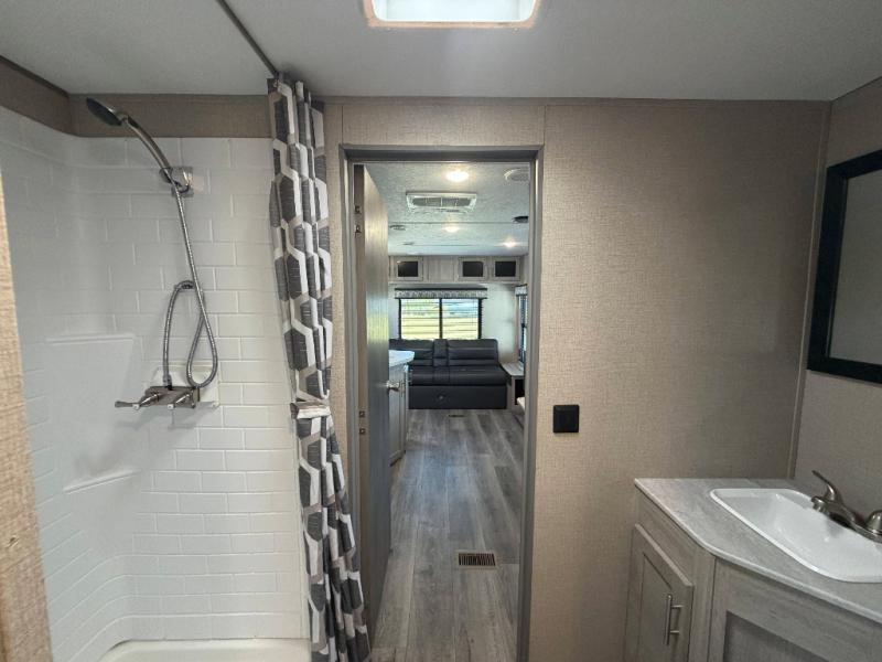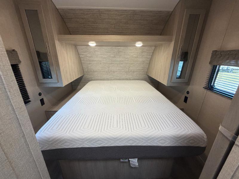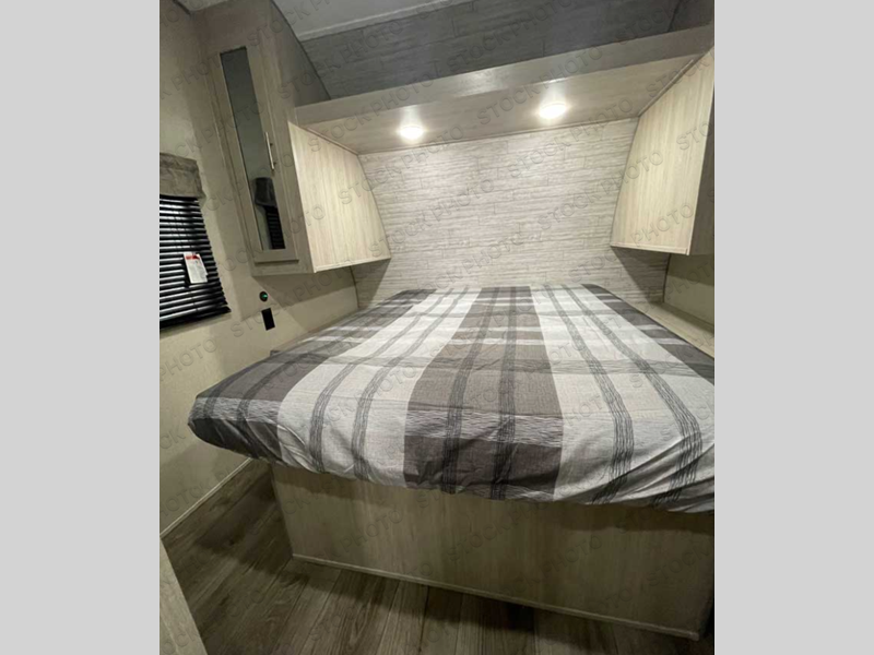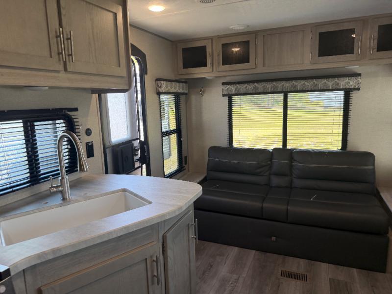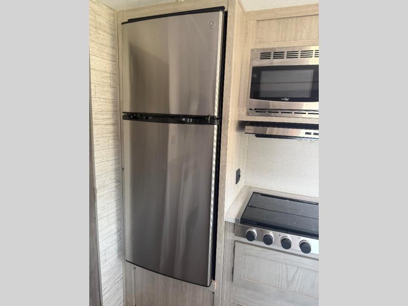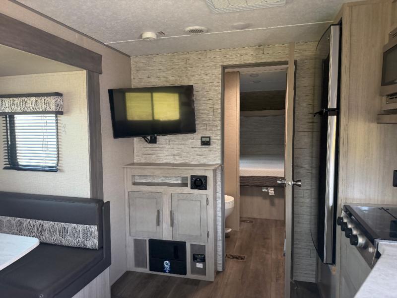 You and your spouse will love the layout of this trailer with a walk-through bathroom which is convenient for you when you are in the front bedroom, and handy for your guests when they stay overnight on the jiffy sofa. The sofa includes dual end tables to set your drink on, and the U-shaped dinette will be perfect to dine around or play games at. The galley kitchen offers all the appliances needed to make all your meals, such as a three burner cooktop, a stainless steel microwave, plus a 10 cu. ft. 12V refrigerator. You will have your own side of the walk-around queen bed and a wardrobe, as well as USB ports and 110V outlets in the nightstands.
