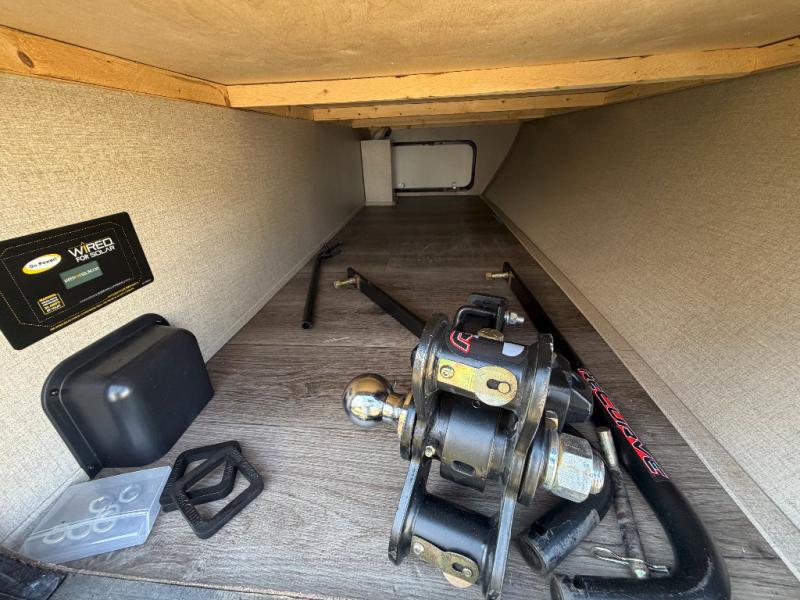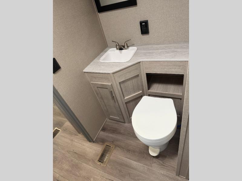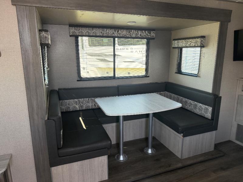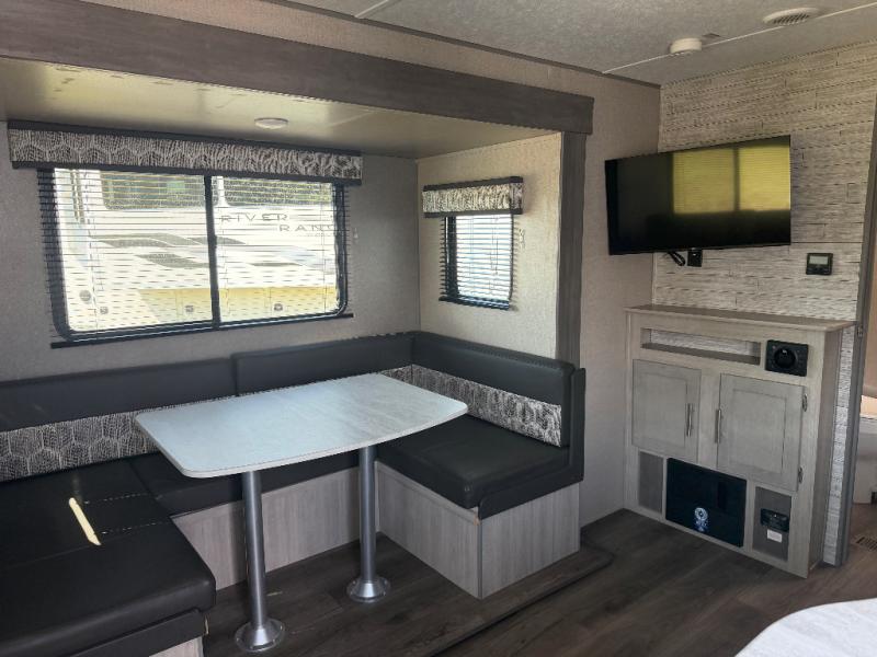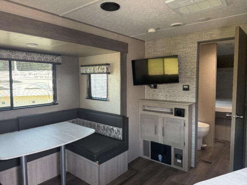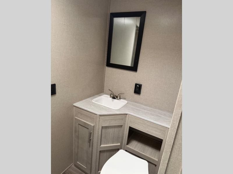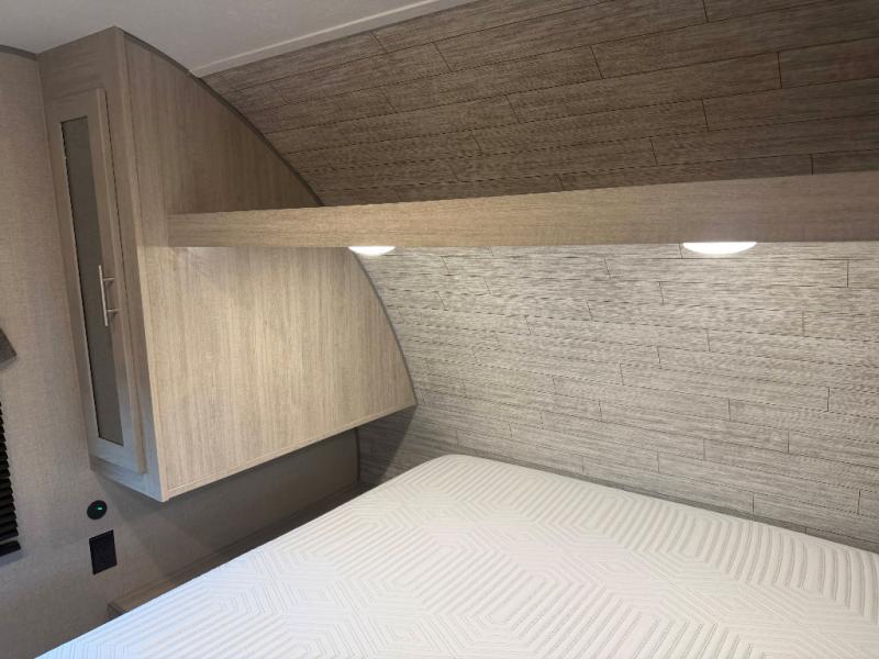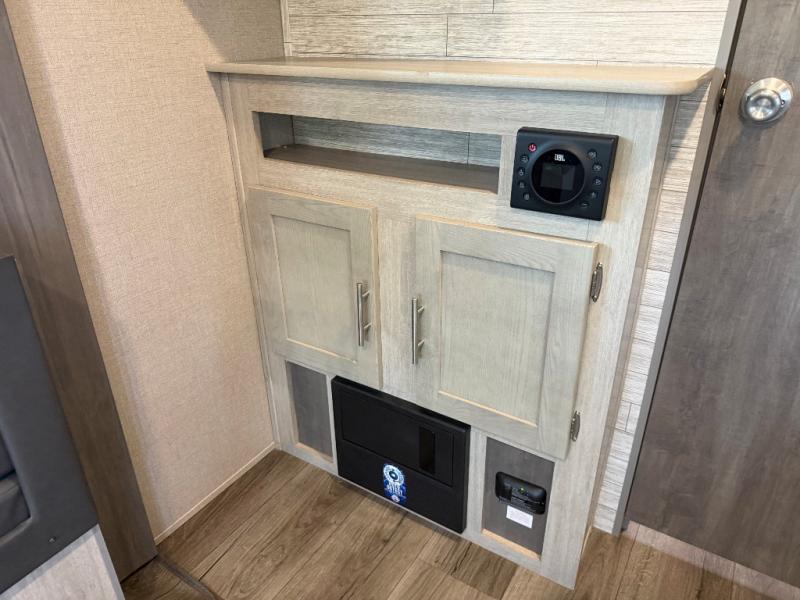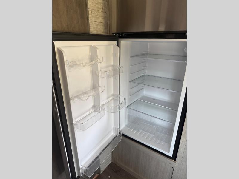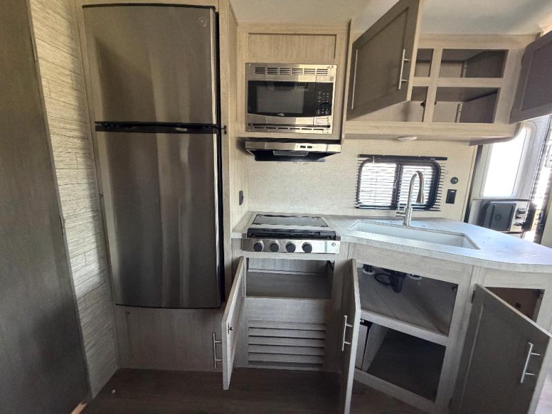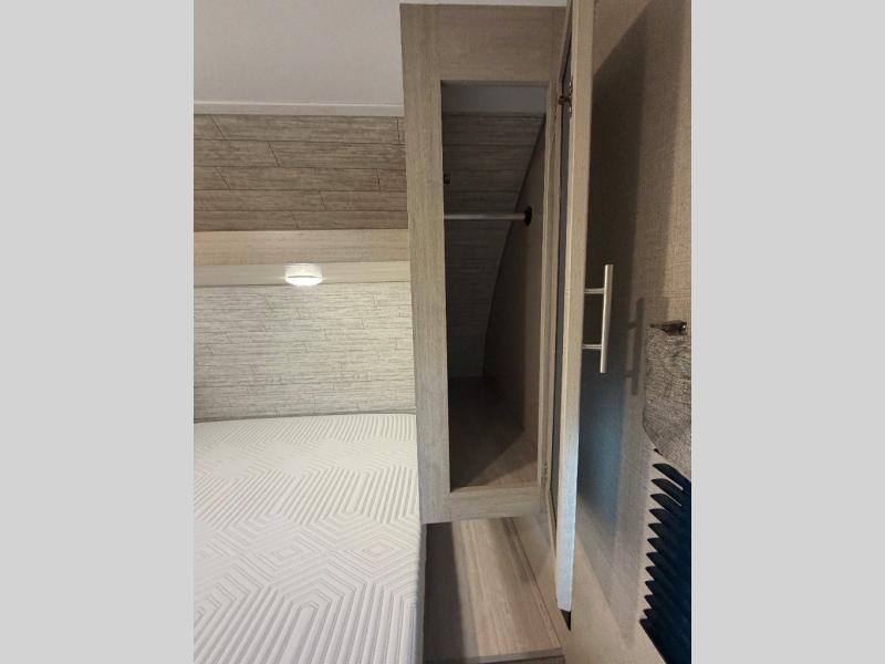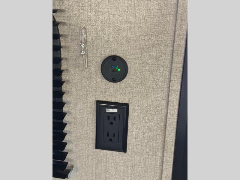 You and your spouse will love the layout of this trailer with a walk-through bathroom which is convenient for you when you are in the front bedroom, and handy for your guests when they stay overnight on the jiffy sofa. The sofa includes dual end tables to set your drink on, and the U-shaped dinette will be perfect to dine around or play games at. The galley kitchen offers all the appliances needed to make all your meals, such as a three burner cooktop, a stainless steel microwave, plus a 10 cu. ft. 12V refrigerator. You will have your own side of the walk-around queen bed and a wardrobe, as well as USB ports and 110V outlets in the nightstands.