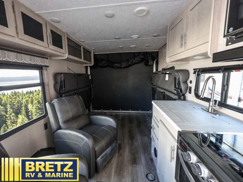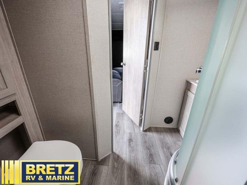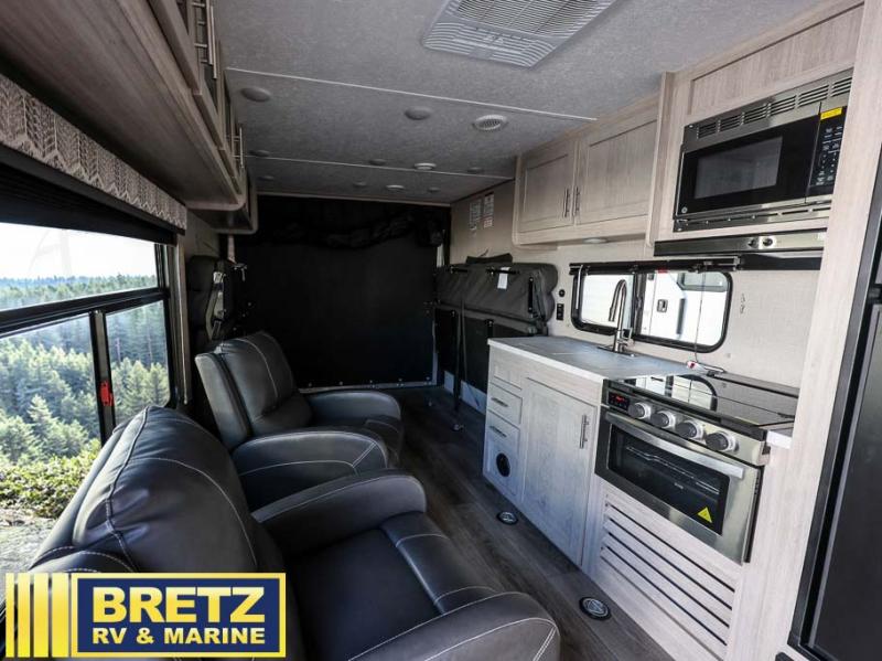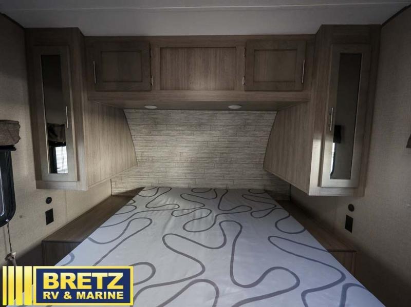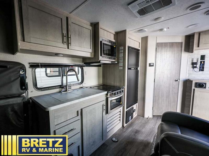 The best looking, most affordable toy hauler is found in the Catalina Trailer Blazer by Coachmen. Each one is constructed with a seamless alpha roof membrane, an enclosed and fully sealed underbelly, and a cambered structural steel I-beam frame for added support. There is a rear loading cargo door with a 3,000 lb. capacity, a black out screen wall with a zip walk-thru and windows, plus 500 lb. tie-downs to secure your toys. You'll love the interior with its Congoleum woodplank linoleum flooring, pleated night shades, and LED interior lighting. Head outside to find an electric awning with multicolored LED lights and a remote, a 15' Toy Loc cable, a "Leash Link" quick hookup D-ring for pets, and upgraded aluminum wheels. The Catalina Trail Blazer also comes with RV-LINK 4G LTE connectivity with a WiFi booster and extender, a JBL Aura Cube media center, plus premium JBL interior speakers to ensure you'll never go bored!