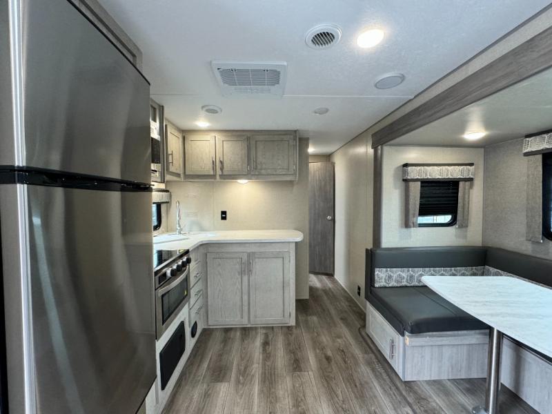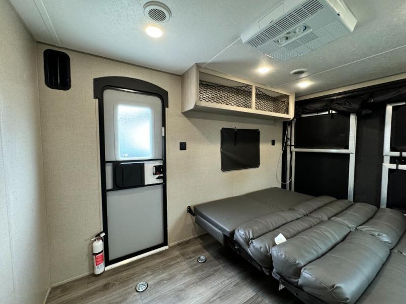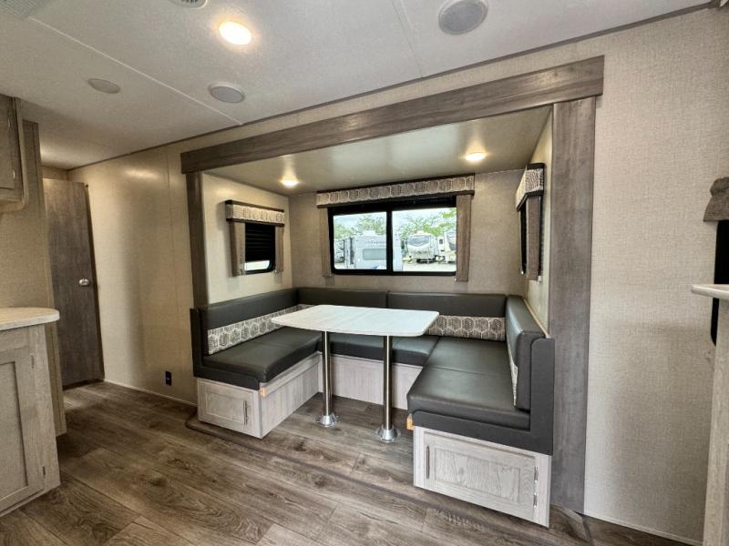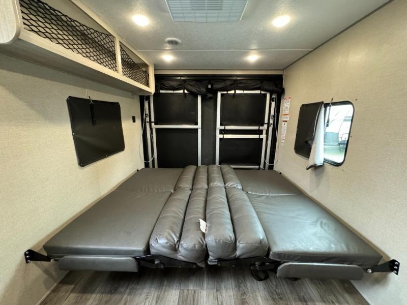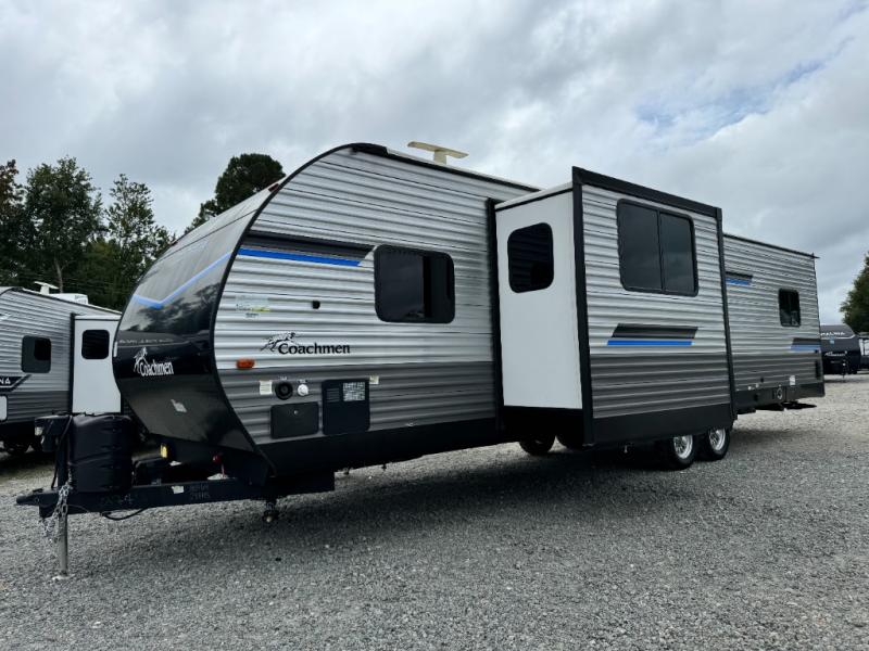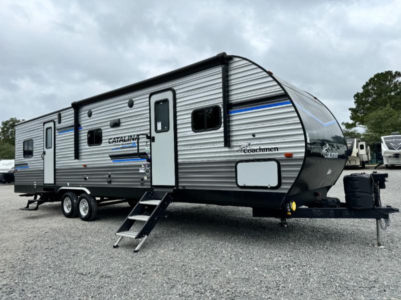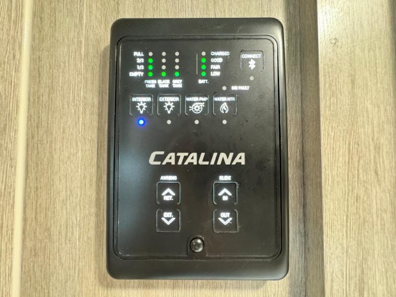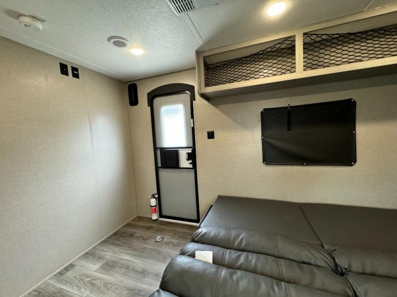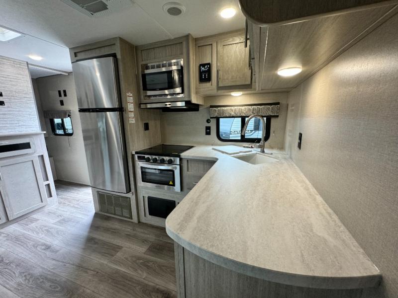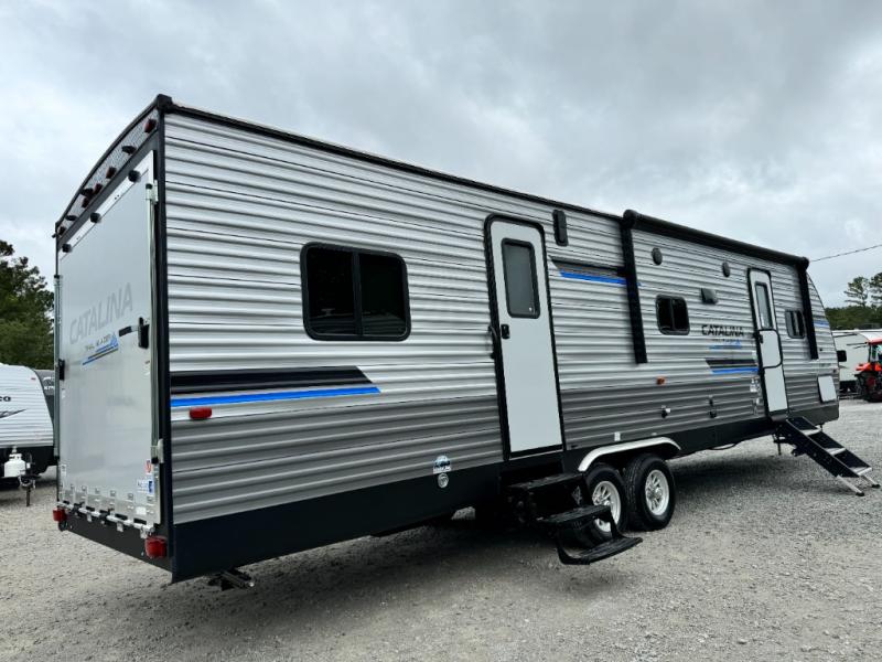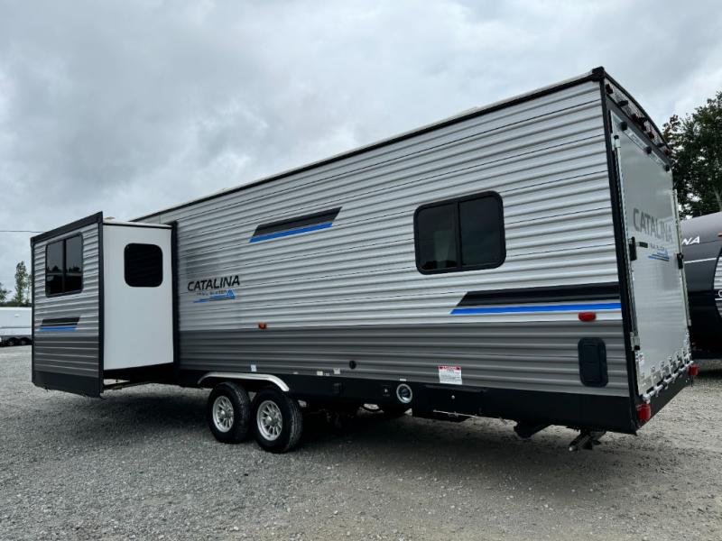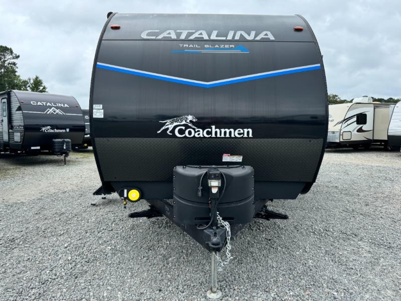 The best looking, most affordable toy hauler is found in the Catalina Trailer Blazer by Coachmen. Each one is constructed with a seamless alpha roof membrane, an enclosed and fully sealed underbelly, and a cambered structural steel I-beam frame for added support. There is a rear loading cargo door with a 3,000 lb. capacity, a black out screen wall with a zip walk-thru and windows, plus 500 lb. tie-downs to secure your toys. You'll love the interior with its Congoleum woodplank linoleum flooring, pleated night shades, and LED interior lighting. Head outside to find an electric awning with multicolored LED lights and a remote, a 15' Toy Loc cable, a "Leash Link" quick hookup D-ring for pets, and upgraded aluminum wheels. The Catalina Trail Blazer also comes with RV-LINK 4G LTE connectivity with a WiFi booster and extender, a JBL Aura Cube media center, plus premium JBL interior speakers to ensure you'll never go bored!