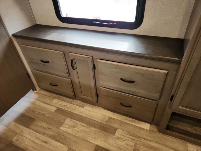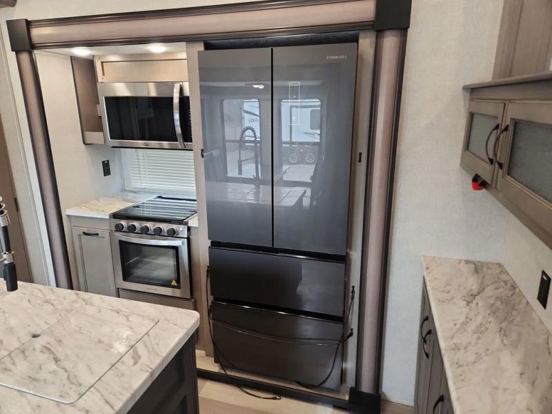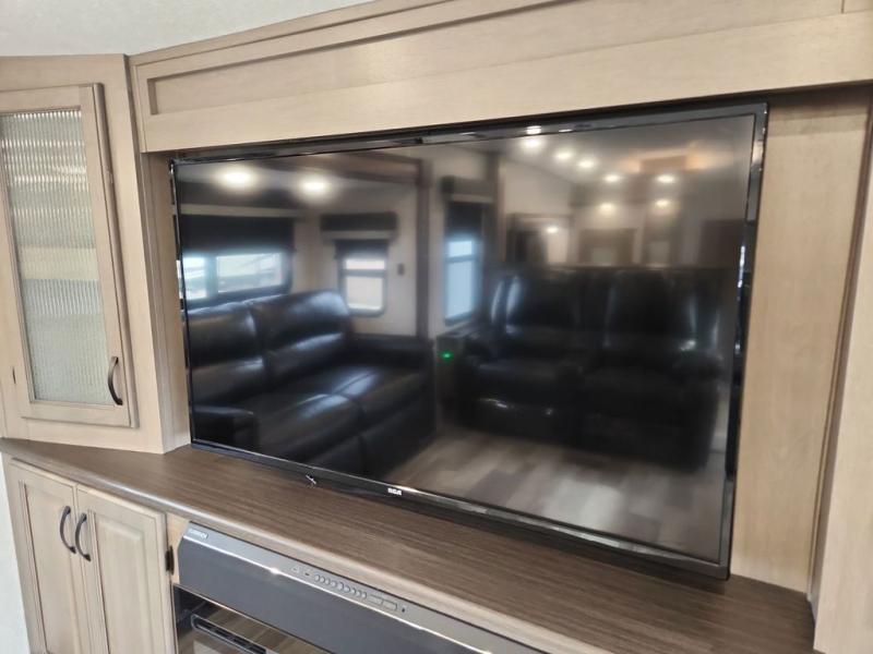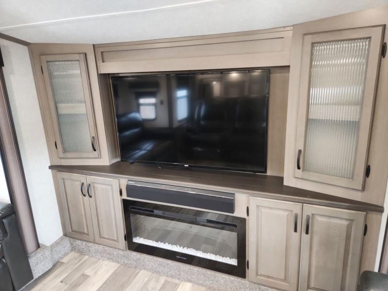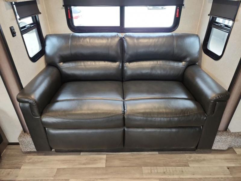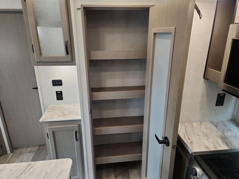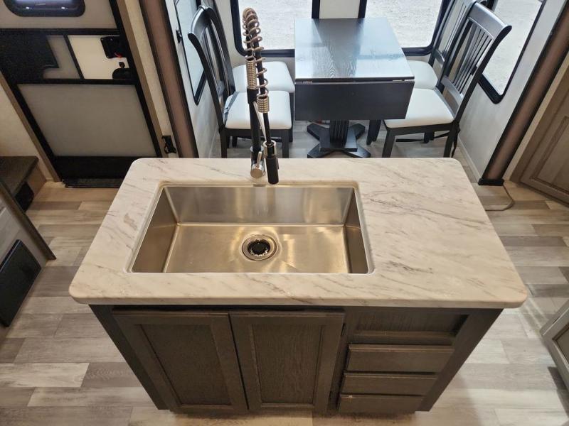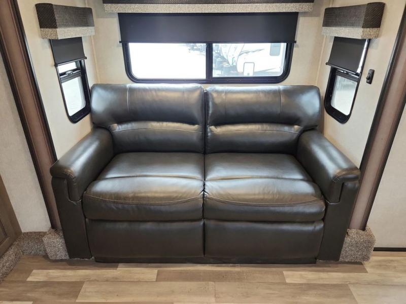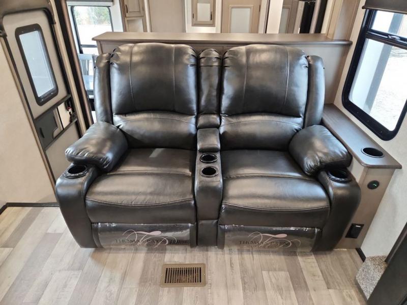 Camping or full-timing in this spacious fifth wheel will make the whole family happy. Your crew will love to visit in the front living area that included two tri-fold hide-a-bed sofas, theatre seating with a side table, plus an entertainment center for an optional 50" LED TV. The kitchen is any chef's dream with its kitchen island, residential pantry, plus a second pantry, and stainless steel appliances. And the free-standing table will allow you to dine just like you do at home. Head to the master suite to find a queen bed slide out with a king bed option, two dressers, plus a full rear bath with dual bath sinks!