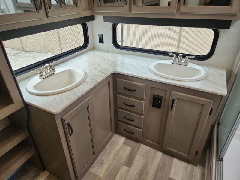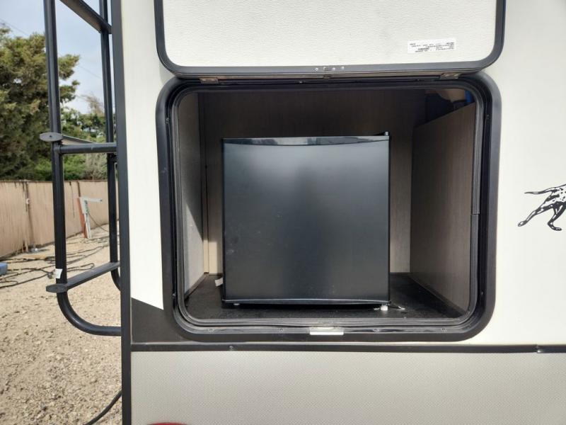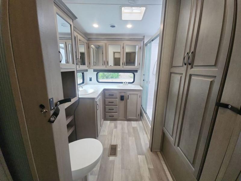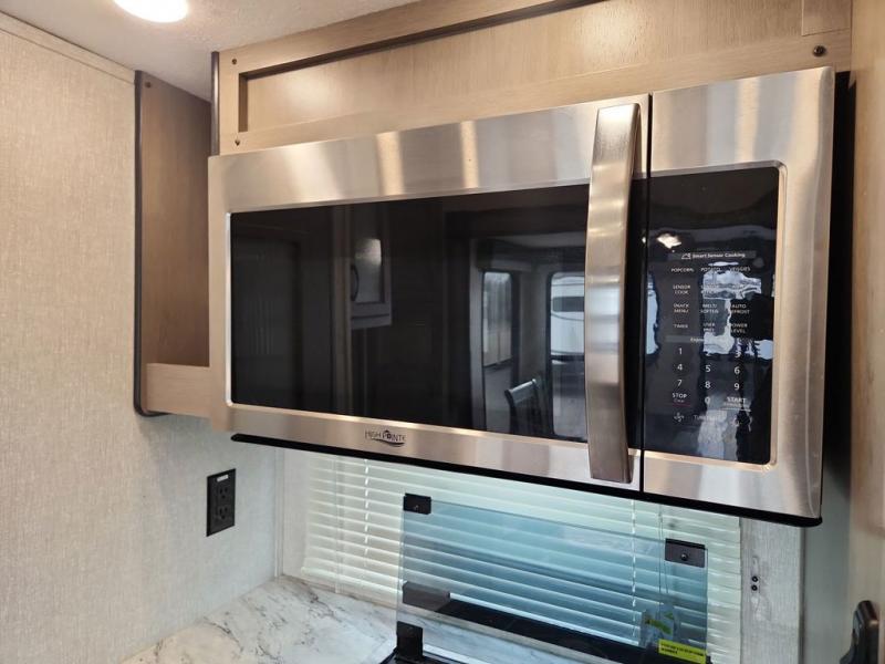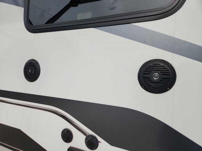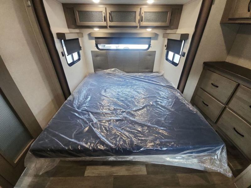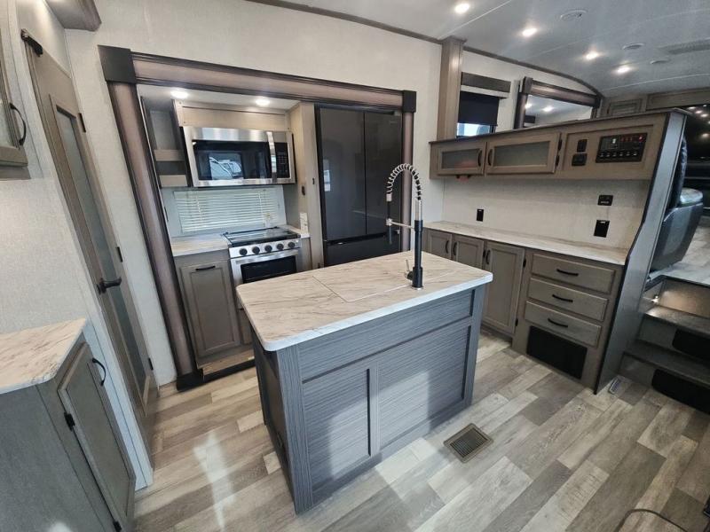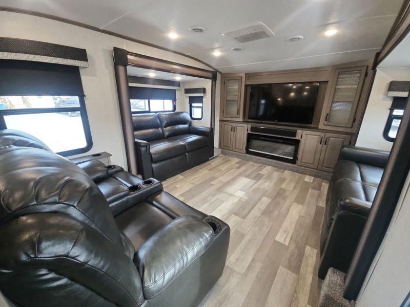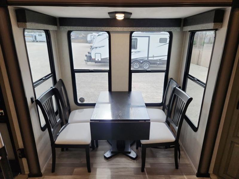 Camping or full-timing in this spacious fifth wheel will make the whole family happy. Your crew will love to visit in the front living area that included two tri-fold hide-a-bed sofas, theatre seating with a side table, plus an entertainment center for an optional 50" LED TV. The kitchen is any chef's dream with its kitchen island, residential pantry, plus a second pantry, and stainless steel appliances. And the free-standing table will allow you to dine just like you do at home. Head to the master suite to find a queen bed slide out with a king bed option, two dressers, plus a full rear bath with dual bath sinks!