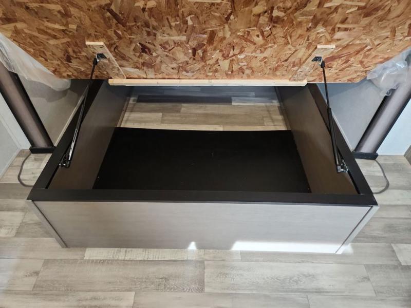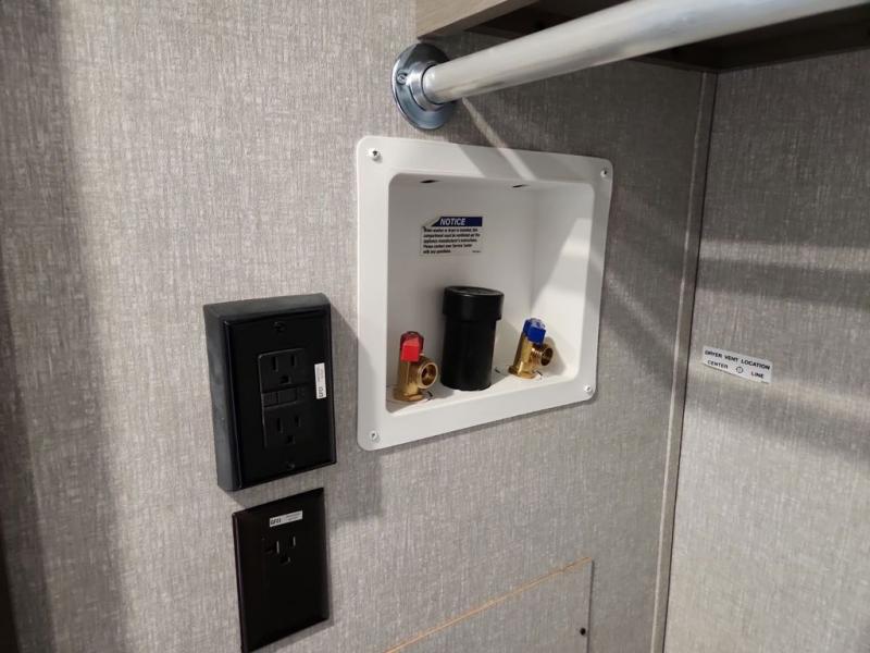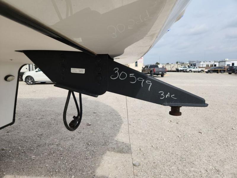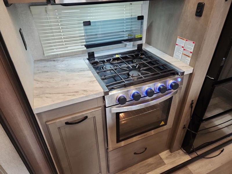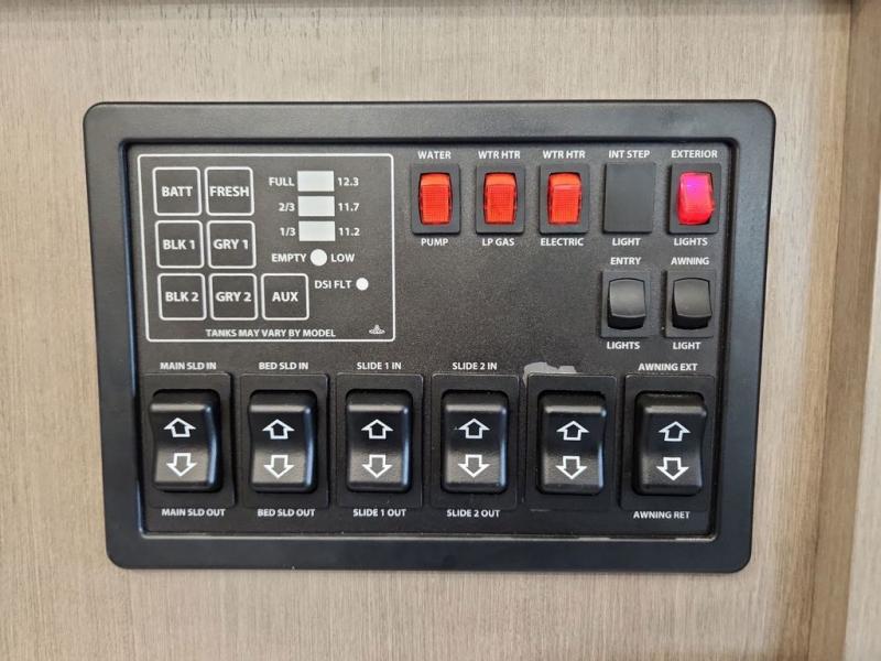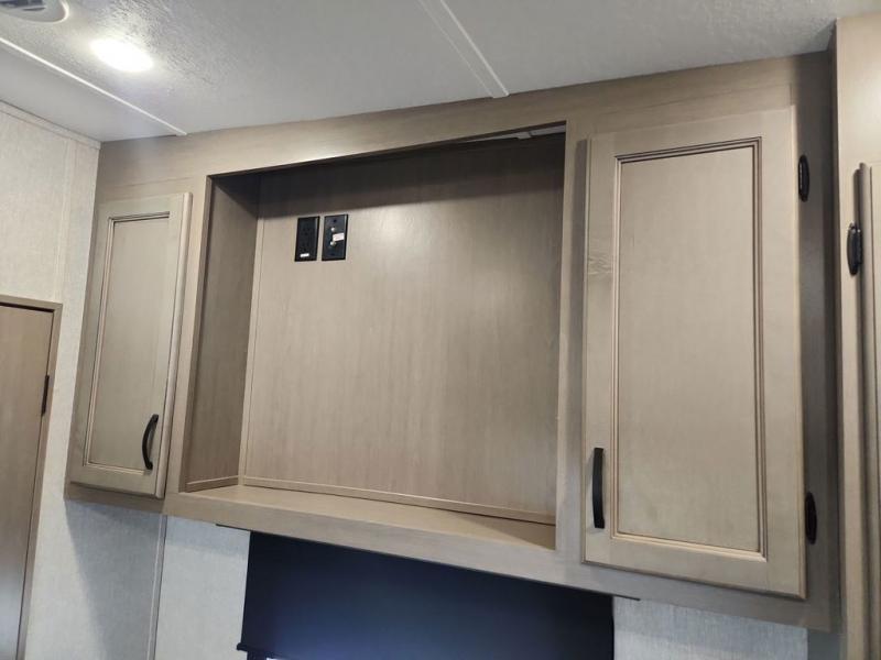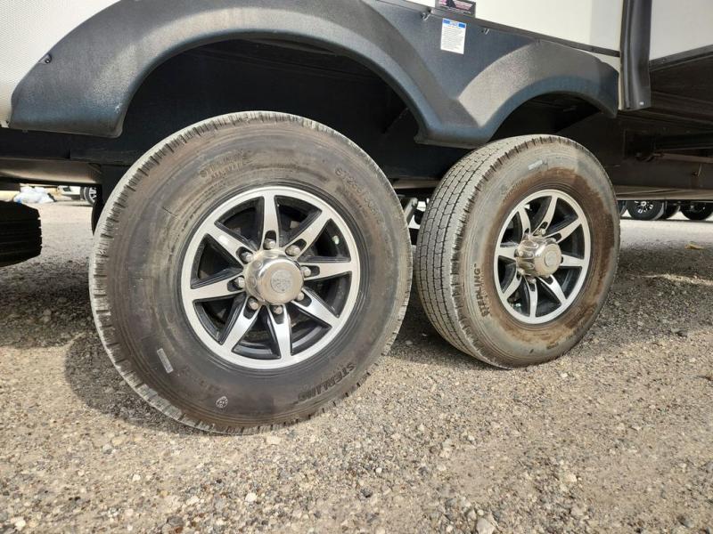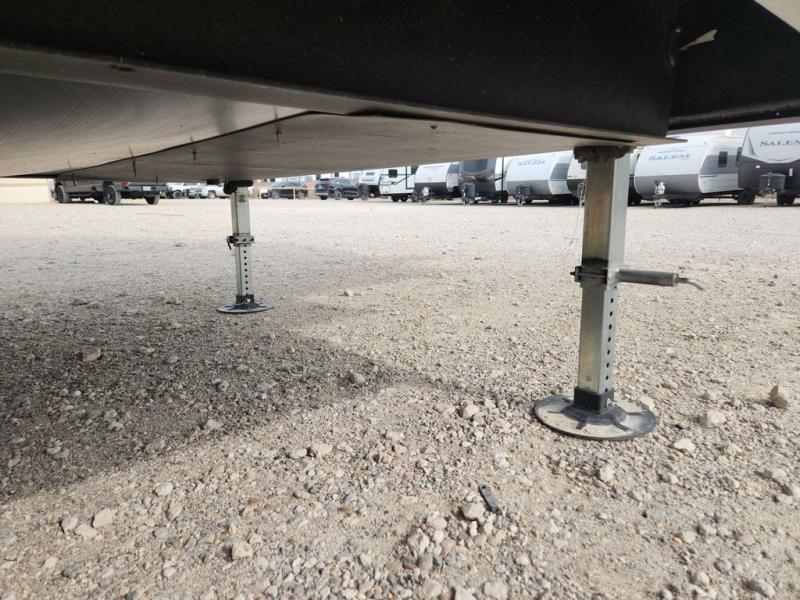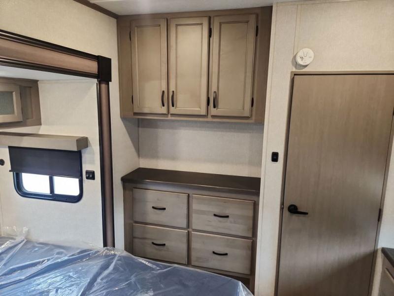 Camping or full-timing in this spacious fifth wheel will make the whole family happy. Your crew will love to visit in the front living area that included two tri-fold hide-a-bed sofas, theatre seating with a side table, plus an entertainment center for an optional 50" LED TV. The kitchen is any chef's dream with its kitchen island, residential pantry, plus a second pantry, and stainless steel appliances. And the free-standing table will allow you to dine just like you do at home. Head to the master suite to find a queen bed slide out with a king bed option, two dressers, plus a full rear bath with dual bath sinks!