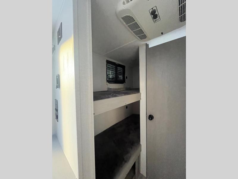 This Clipper Cadet bunk model is perfect for your growing family of three or four. In front, a booth dinette with large overhead shelf is great for dining during the day, and can easily be converted to sleeping space for two. An entertainment center and optional fireplace are featured just inside the door on your left. The children will love the 28" x 72" bunk beds and a convenient corner bath with toilet and 24" x 36" shower is right nearby for late night trips. Cook up family meals with the two burner cook-top easily inside when you don't feel like cooking over an open campfire There is a single sink, pantry, and refrigerator for your perishables as well. On the outside, a 10' awning provides more living space to enjoy, and there is exterior storage both up front and in back beneath the awning for camp chairs and outside toys and games.