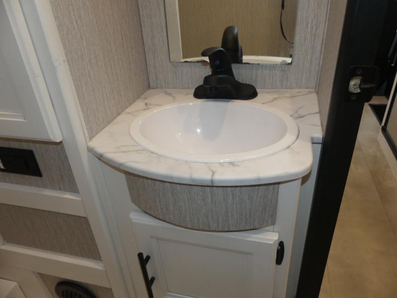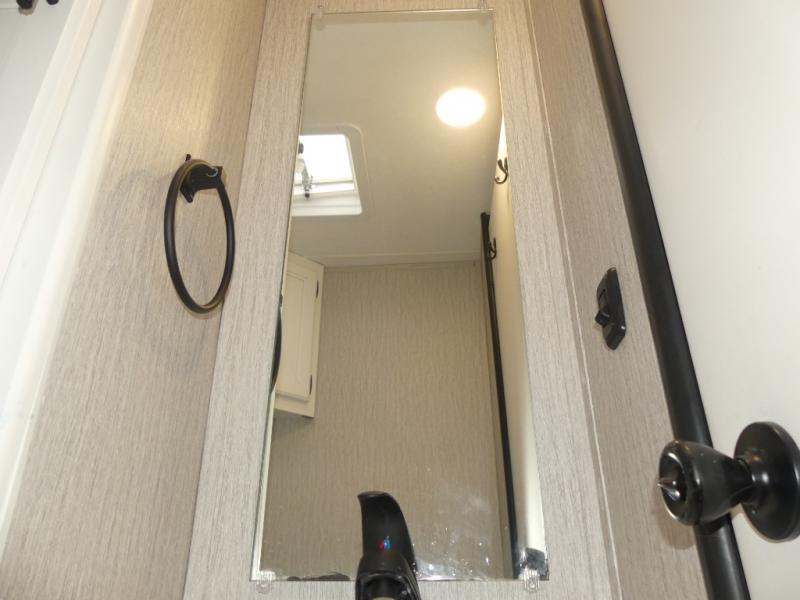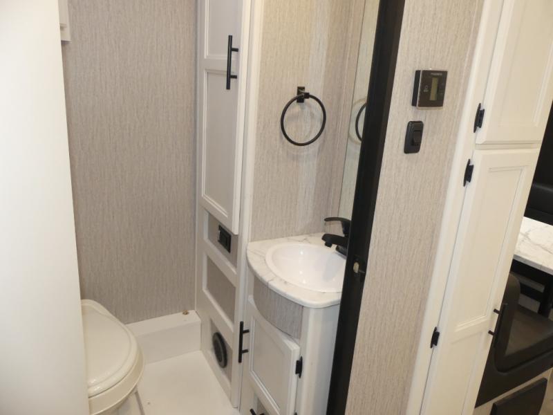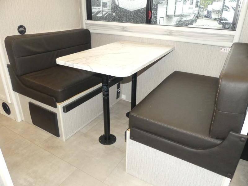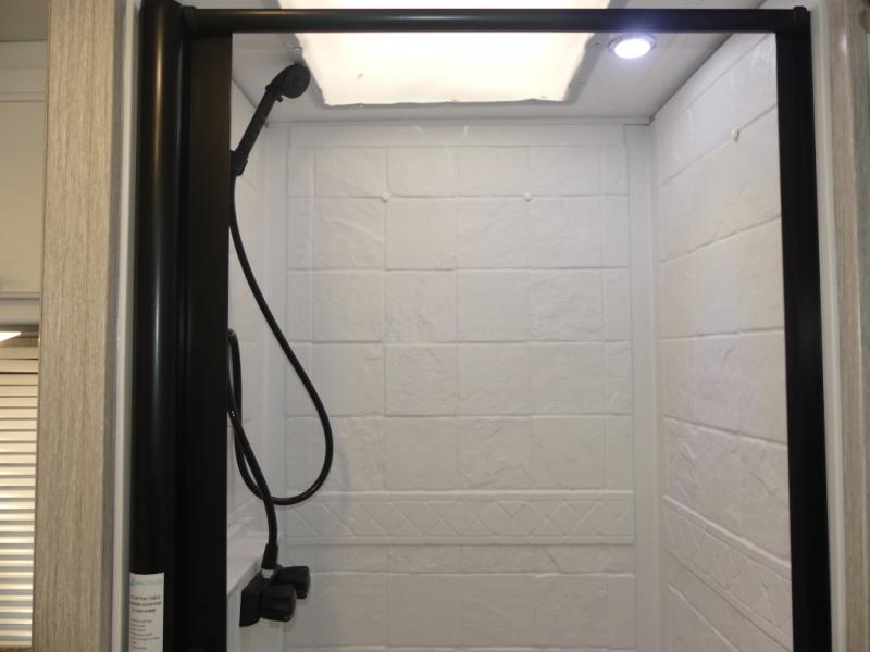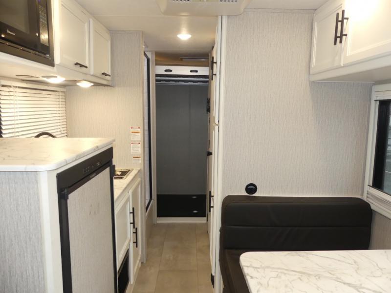 This coach is compact and full of features for you and your favorite person or family of three to enjoy road trips and camping in tighter spaces than most! The chef of your group can prepare a quick lunch on the two burner cooktop, and you can dine together on the dinette/sofa that offers sleeping for one at night. There is a large shower to clean up in, and the private toilet and sink is just across the hall so two people can freshen up at once. This coach also includes plenty of storage space in overhead compartments, within the pantry for snacks and paper goods, and even under the double-size bed where you might like to store your bike through the exterior cargo doors that open on both sides!
