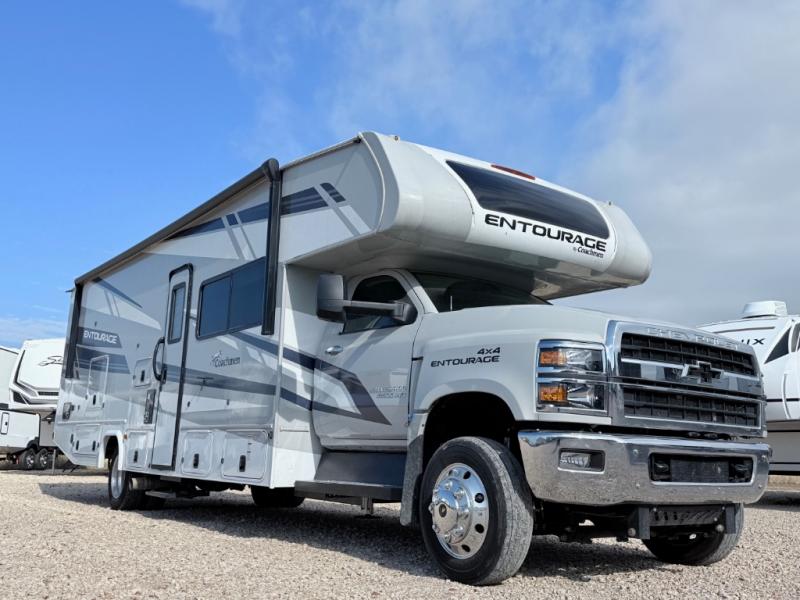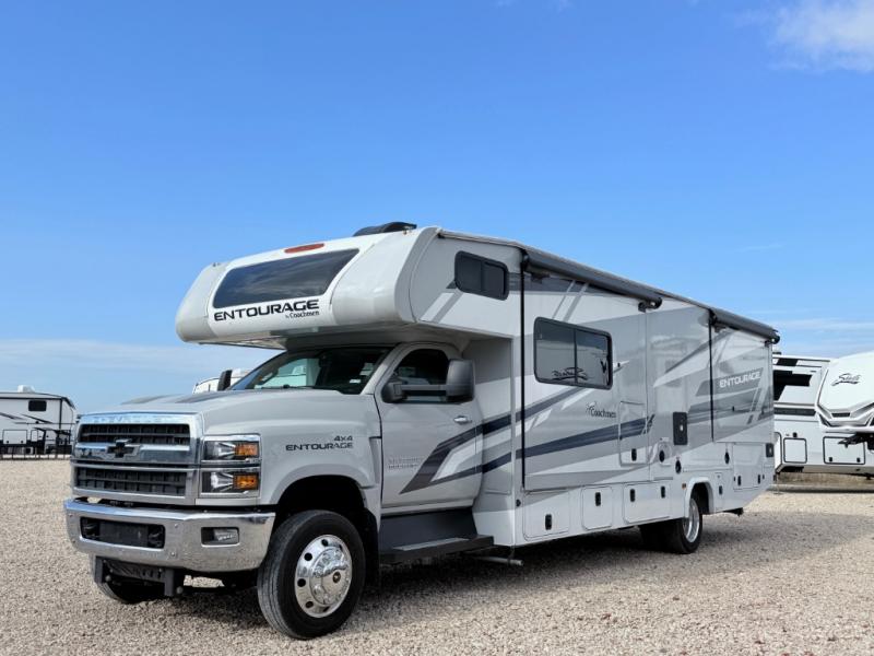 The Entourage is Coachmen's first Super C diesel motorhome and it is packed with upscale appointments and solid construction so you can enjoy the RV lifestyle for years to come. This coach features a 4x4 diesel chassis (either a Chevy Silverado 5500 with a 6.6L V8 diesel engine including a 10K tow hitch, or choose the International CV chassis with 15K tow hitch), plus 50 amp service and a 2,000 watt invertor for all your power needs. The mandatory Icon Package includes a porcelain macerator toilet, auto generator start with dual batteries, 50 amp service, a tankless water heater, and more!