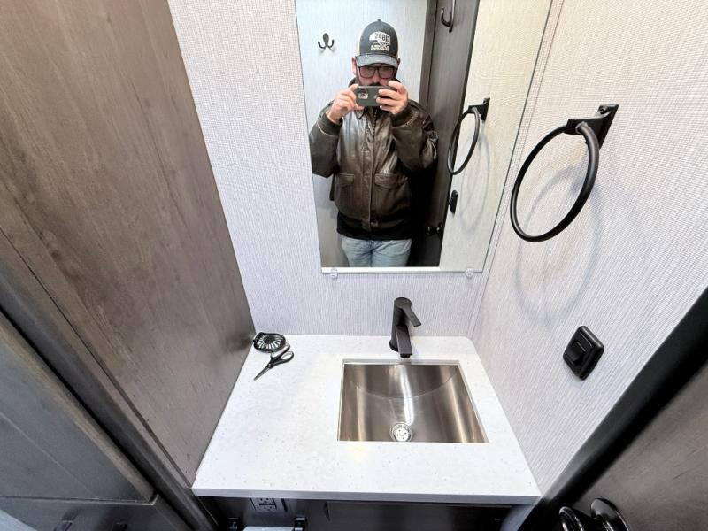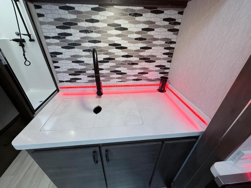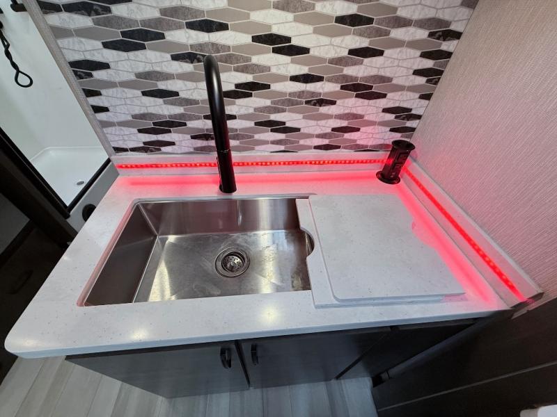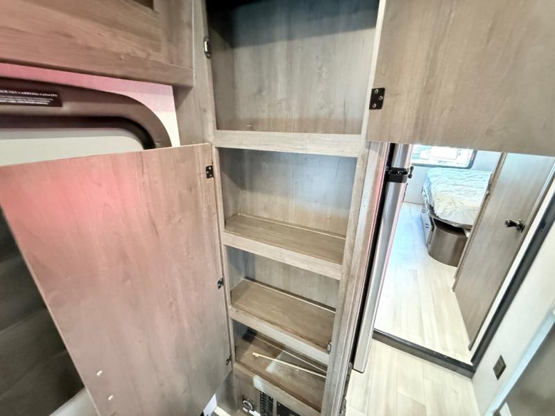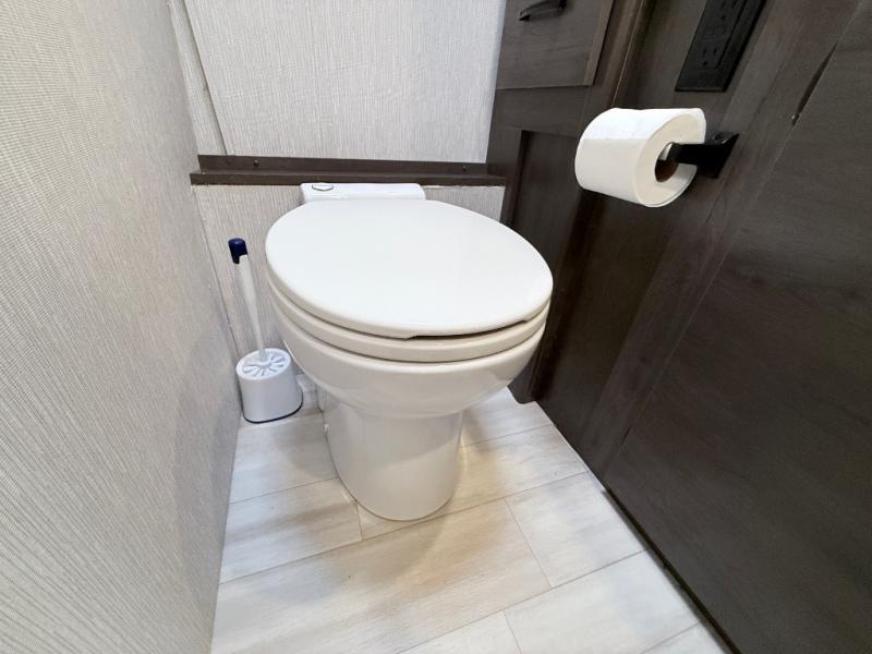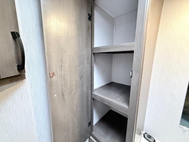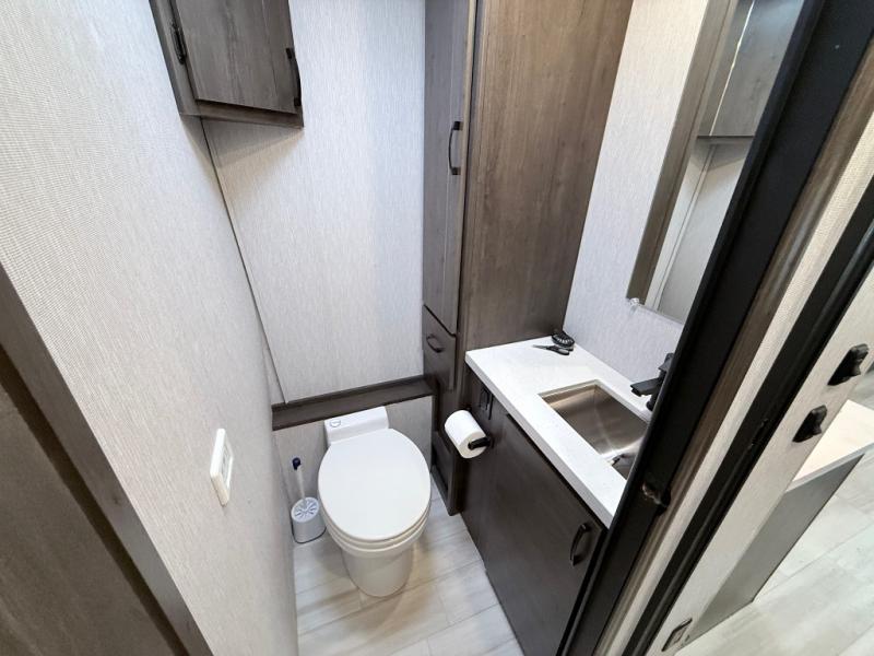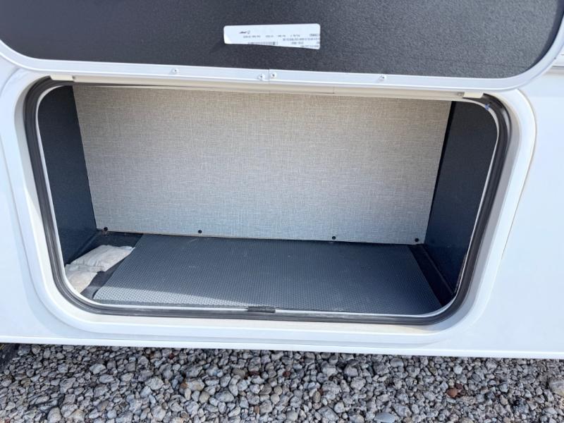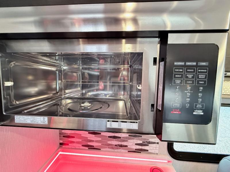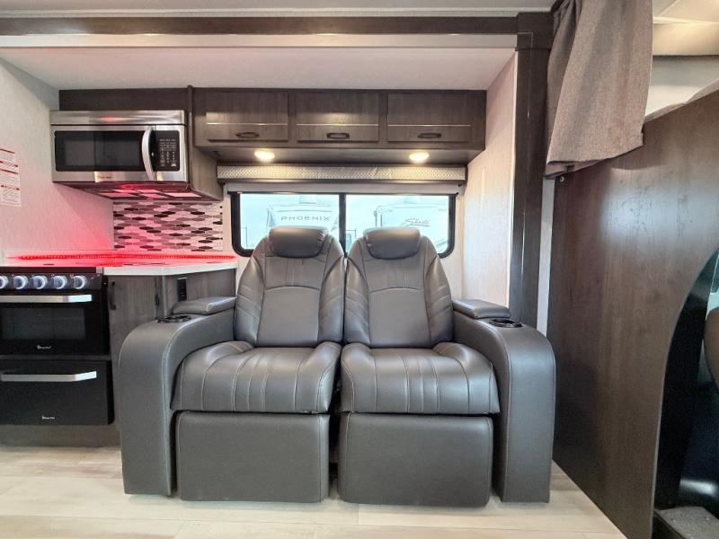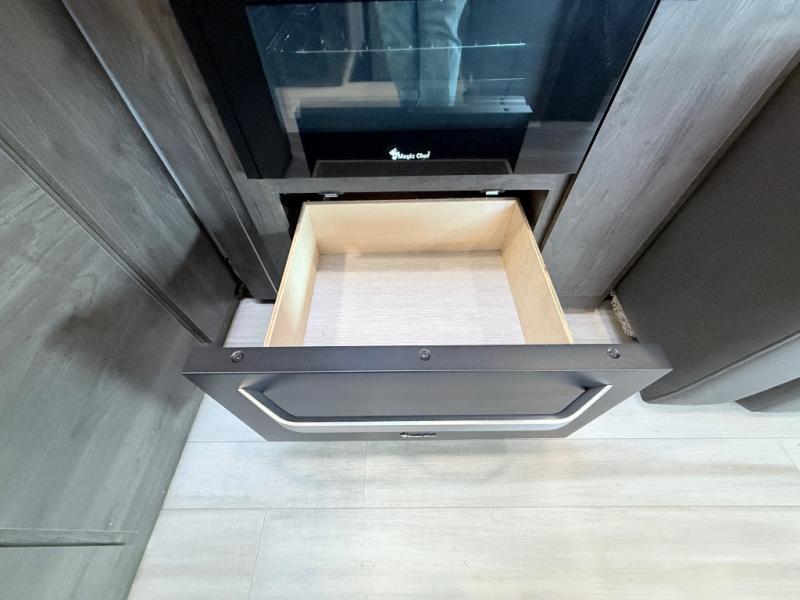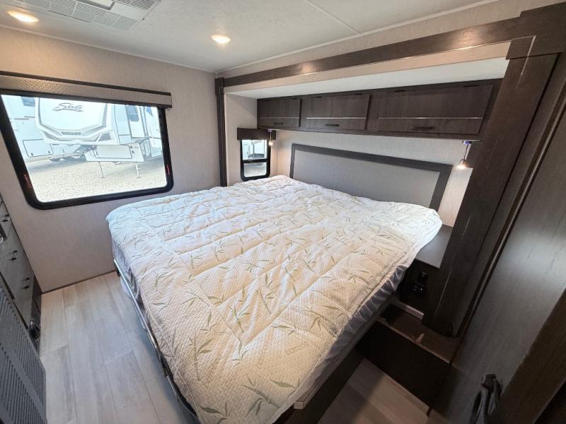 This coach will meet your every need, whether you're a weekend warrior or full-time RVer. Once you arrive at the campground, make a quick lunch on the cooktop or in the convection microwave, and the countertop extension will provide more space to prep fresh veggies. There is a refrigerator and a pantry to store food for the week, plus overhead cabinets for spices and dishes. After lunch is cleaned up, you can relax around the J-lounge with a pedestal table and an extension to sit more people. And the sofa can be switched out for optional recliners if you don't need the additional sleeping space. This coach features a split-style bath with an independent shower and a private toilet and sink right across the hall so two people can freshen up at once. The rear private bedroom includes a power inclining king bed, dual wardrobes, a TV, plus washer and dryer prep to make wash day easier than ever. Specifications shown are for Chevy Silverado 5500 chassis, see dealer for International CV chassis differences.