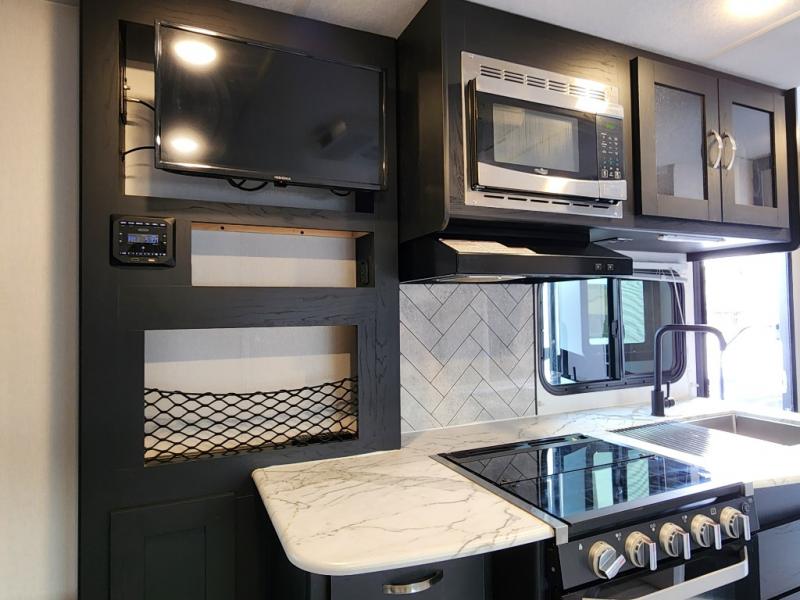 This is the perfect couple's trailer to take to the lake every other weekend. You will enjoy your own queen bed up front that includes vaulted under-bed storage for your luggage. The sofa slide out with a free-standing table provides a place to relax and dine together, and if you have an overnight guest, they can sleep here. The chef can prepare meals on the three burner cooktop or in the microwave oven, and there is a dual basin American stonecast sink for easy clean up. This model also includes a full bath with a linen closet for clean towels, and a 32" radius shower with a skylight for more standing space.