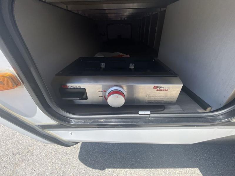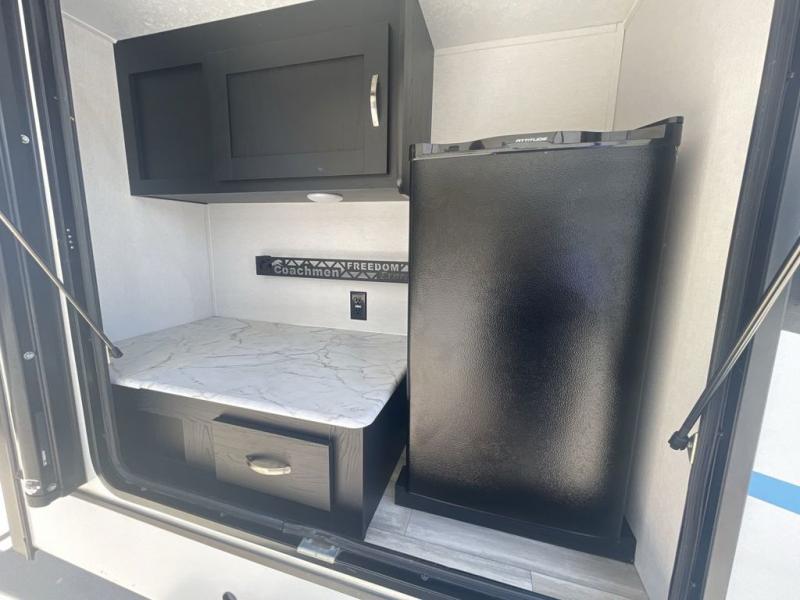 With any Coachmen Freedom Express Liberty Edition travel trailer, there is aluminum cage construction, vacuum bonded interior and exterior walls with Azdel composite, a heated and enclosed underbelly for four seasons of travel, and Tufflex PVC roofing. Some other features include hidden hinge cabinetry, Carefree flooring, a porcelain toilet, and the AIR 360+ amplified omnidirectional VHF/UHF, FM and WiFi antenna with optional 4G LTE Gateway add-on. And the required Express Pack includes an exterior griddle with side table, 50 AMP service, frameless windows and a ladder to reach the roof.