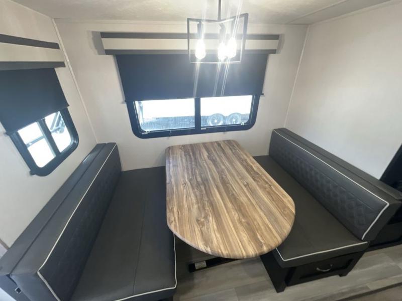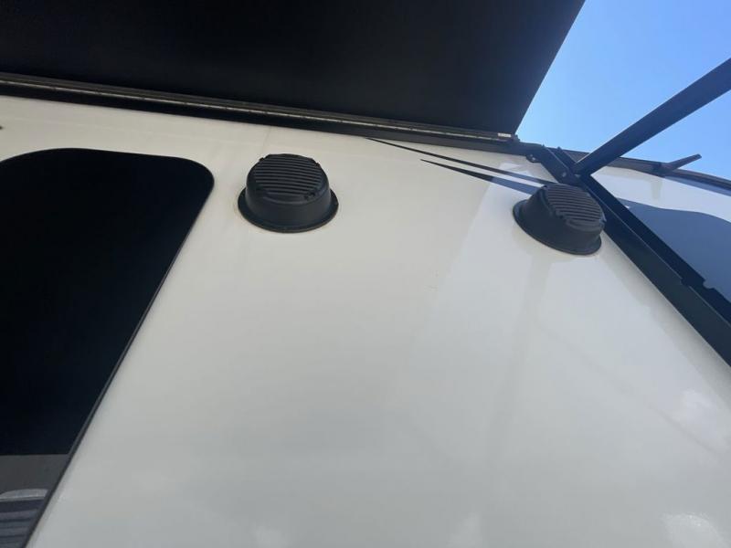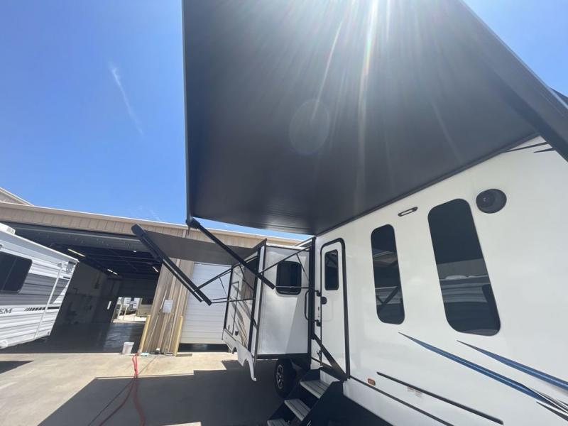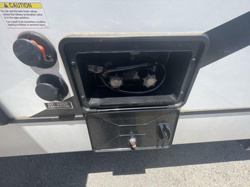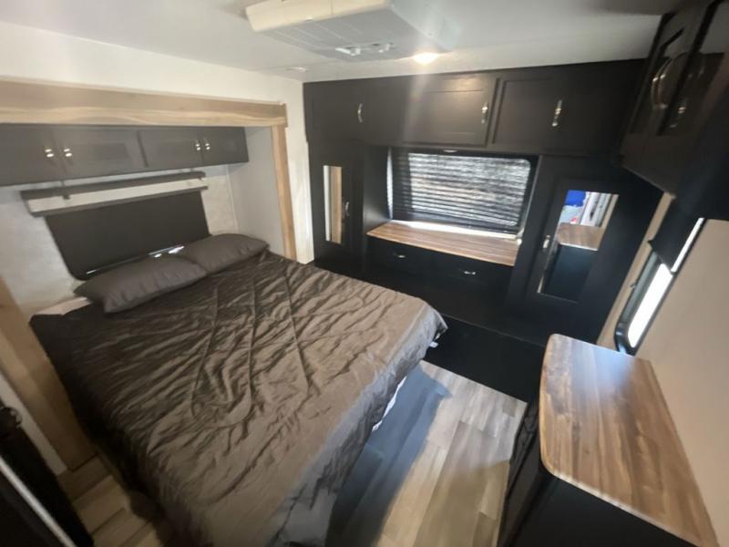 This spacious trailer offers dual opposing slides in the main living and kitchen area and a queen bed slide in the bedroom giving you lots of floor space in both areas! The kitchen offers full amenities including a large pantry, extra counter space, a center island, and a booth dinette. And the cook will be able to enjoy the LED TV and fireplace while making meals. Everyone can relax on the theater seats and the hide-a-bed sofa with end tables when visiting, and the furniture can double as sleeping space if needed. You will have your own bedroom to unwind with plenty of storage in the dressers and wardrobes. And the full bathroom offers a shower, linen storage and laundry bag, plus extra counter space for your toiletries.