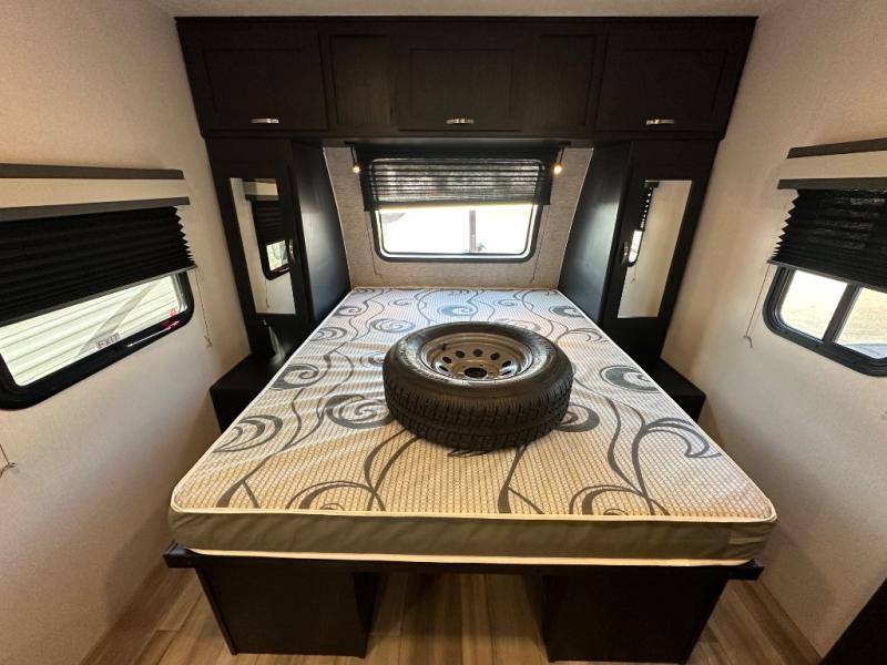 This is the perfect couple's trailer to take to the lake every other weekend. You will enjoy your own queen bed up front that includes vaulted under-bed storage for your luggage. The sofa slide out with a free-standing table provides a place to relax and dine together, and if you have an overnight guest, they can sleep here. The chef can prepare meals on the three burner cooktop or in the microwave oven, and there is a dual basin American stonecast sink for easy clean up. This model also includes a full bath with a linen closet for clean towels, and a 32" radius shower with a skylight for more standing space.