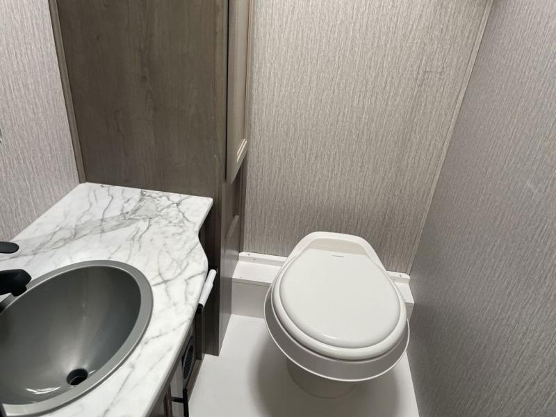 Sneak off for a getaway in this motorhome that has everything you might need! The private rear bedroom has a 60” x 80” queen bed with storage on either side and plenty of room to walk around. The bathroom is split, with the shower on one side and the sink and toilet behind a separate door so sharing is a breeze. Relax up front on either the sofa or the roomy 42” x 71” dinette, with cabinets above for all your supplies. A bunk over the cab provides yet another sleeping area that will be popular with little ones. Time to get out there in the Freelander!
