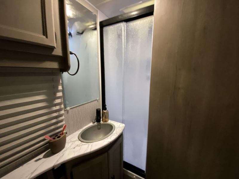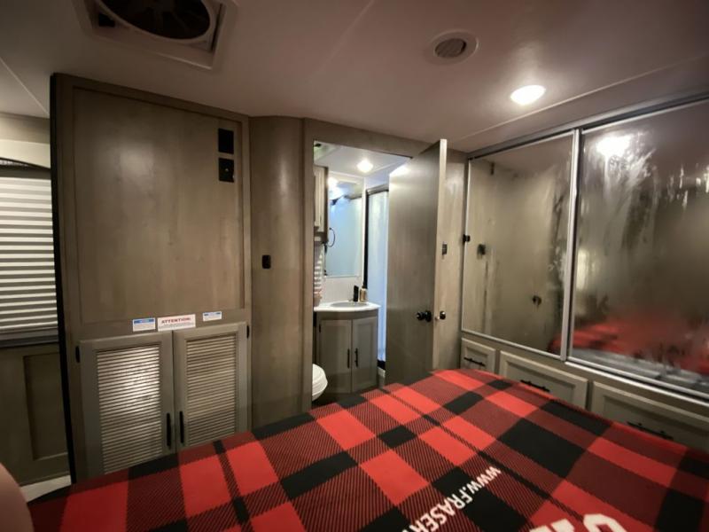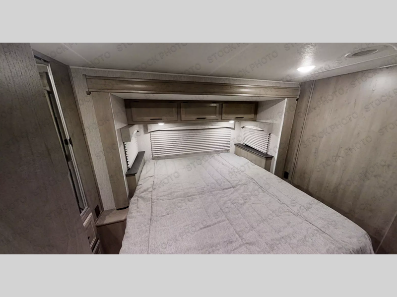 Enjoy many fun trips in this spacious motorhome! Step up to the rear private bedroom with a 72” x 80 king bed, and stow all your clothes in the wardrobe. Adjacent to the bedroom is a rear corner bath with a linen closet which even has room for an optional washer and dryer. The center kitchen has an angled countertop with an extension to allow for maximum cooking space, and a 12V refrigerator stows all your snacks. You’ll enjoy those meals on the J-Lounge or relax on the facing sofa. Overhead you’ll find plentiful cabinets for storage plus a TV. Outside under the power awning is an exterior entertainment center. This model also includes the CRV Supersprings Ride with heavy duty stabilizer bars, chassis electronic stability control, SumoSprings front shock absorbers, and more!
