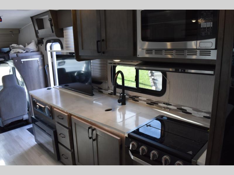 With each Leprechaun Class C gas motorhome by Coachmen you will enjoy "better" interior appointments, like the premium hardwood cabinet doors and drawer fronts, the one-piece thermofoil countertops, and the premium vinyl flooring. You will sleep soundly each night on the upgraded mattress, and staying clean will be easy with the premium showerhead and faucet in the bath. These models include reclining cockpit seats, cruise control, and a rear backup camera so you can easily get in and out of the campground. The Leprechaun is constructed with Azdel composite sidewalls, CrossFlex PVC, polyester reinforced roof material, and vacu-bond laminated walls, roof, and floor for a durable motorhome made to last.
