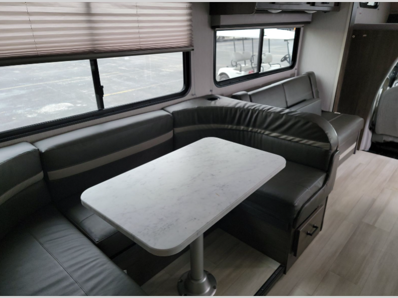 With each Leprechaun Class C gas motorhome by Coachmen you will enjoy "better" interior appointments, like the premium hardwood cabinet doors and drawer fronts, the one-piece thermofoil countertops, and the premium vinyl flooring. You will sleep soundly each night on the upgraded mattress, and staying clean will be easy with the premium showerhead and faucet in the bath. These models include reclining cockpit seats, cruise control, and a rear backup camera so you can easily get in and out of the campground. The Leprechaun is constructed with Azdel composite sidewalls, CrossFlex PVC, polyester reinforced roof material, and vacu-bond laminated walls, roof, and floor for a durable motorhome made to last.