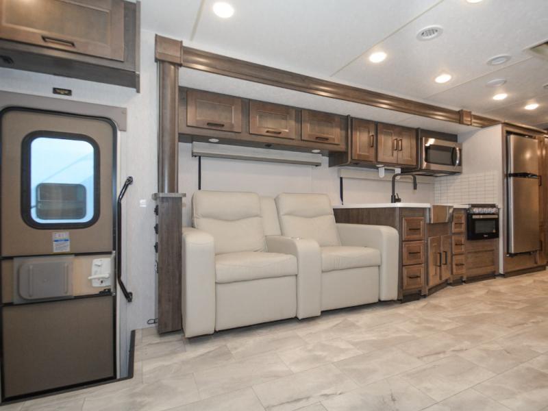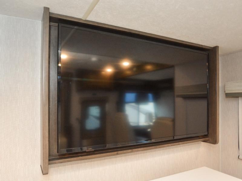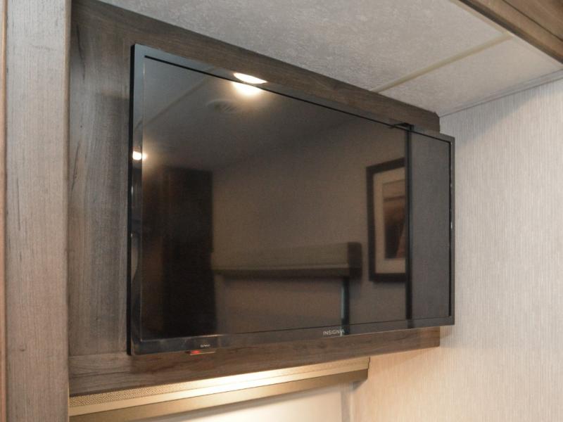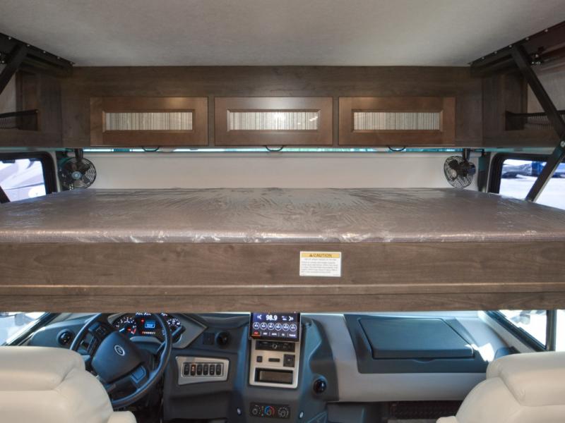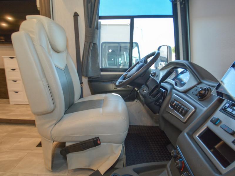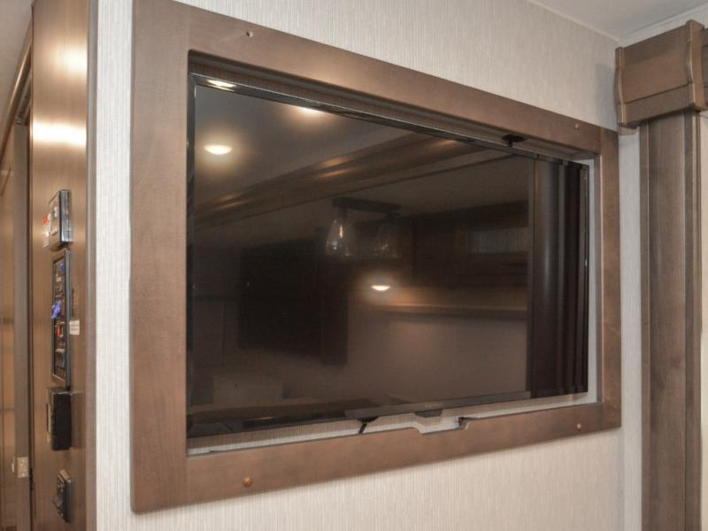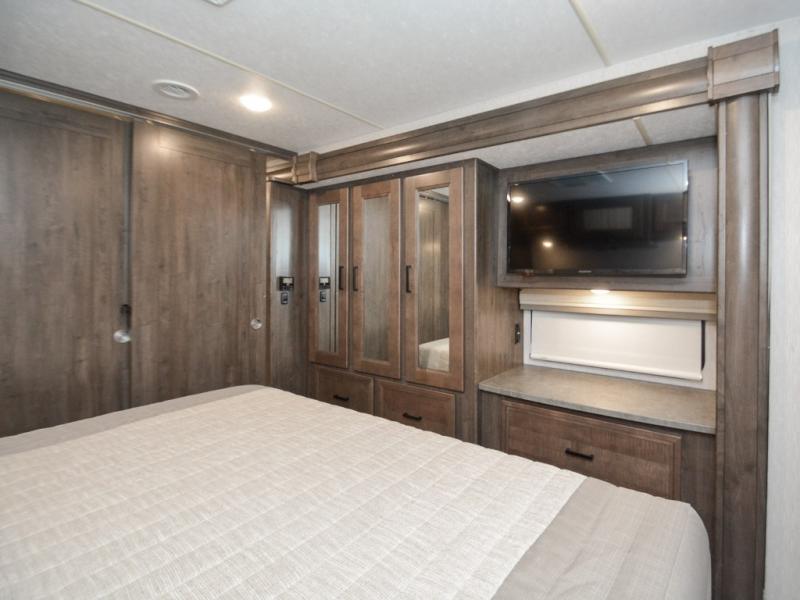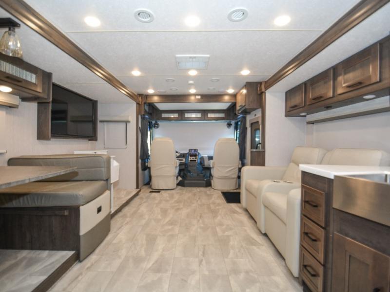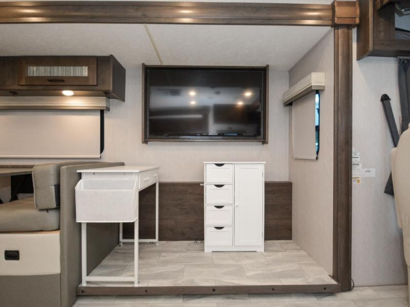 Travel coast-to-coast in this spacious and accommodating motorhome. Between theater seating and swivel captain's seats - there's never a bad seat to enjoy the 50" LCD TV. The well-equipped galley and booth dinette offer all the convenience and comfort for home-cooked meals, or enjoy cookouts under the 20' power awning while the exterior sidewall TV entertains. The full bath includes a glass shower door plus a shower skylight for natural lighting. The rear bedroom will be your oasis away from it all with a comfortable king bed, wardrobe, and a 32" LCD TV with more room for family and friends on the drop down bunk above the cockpit.