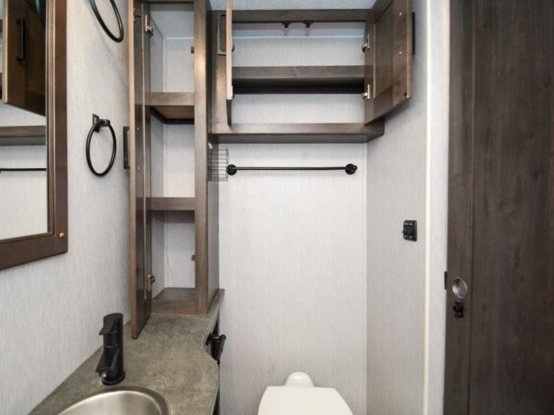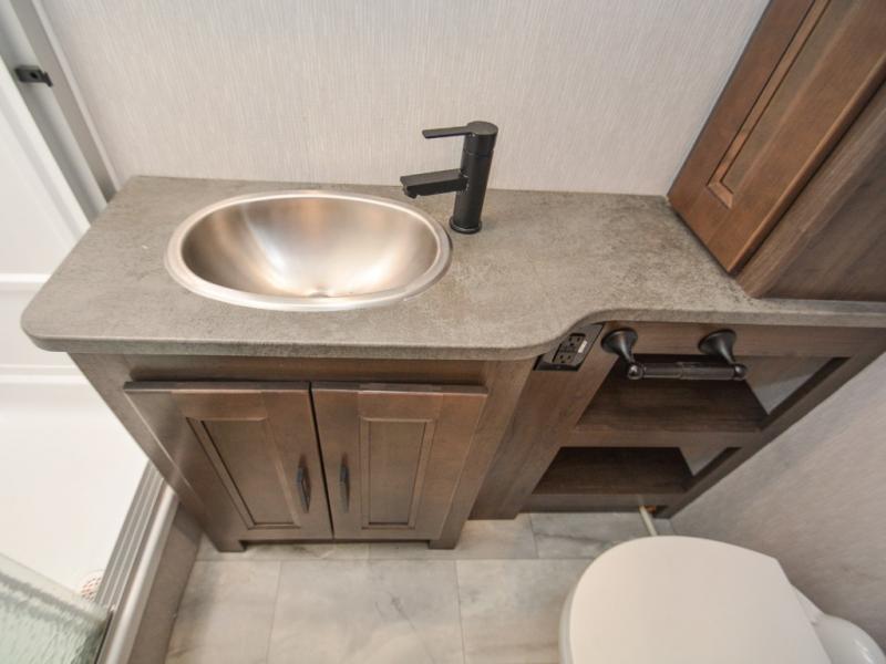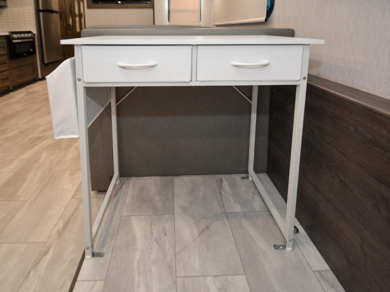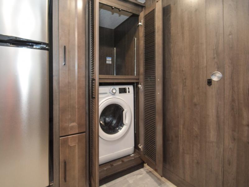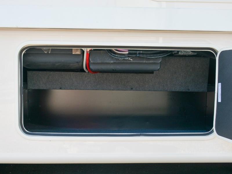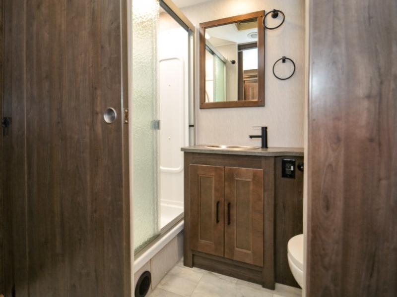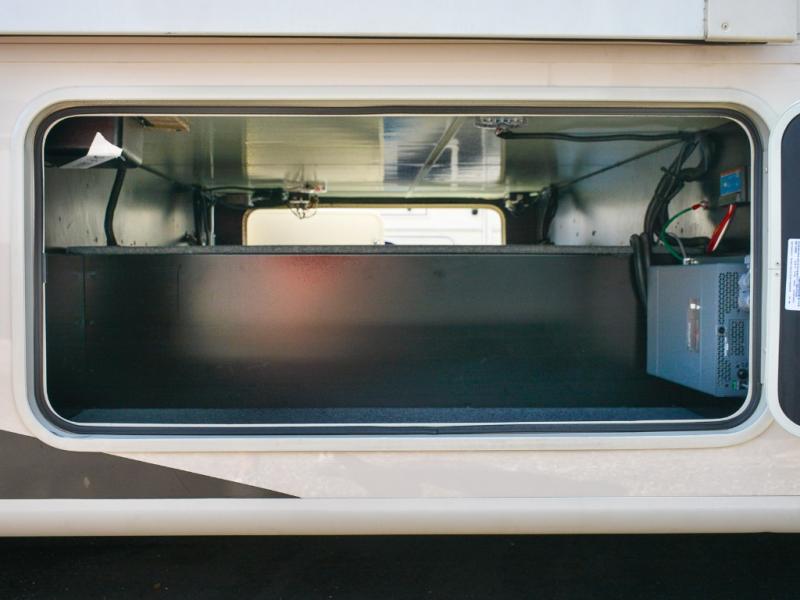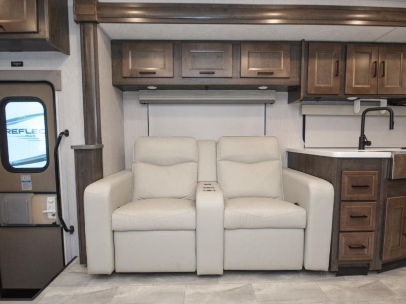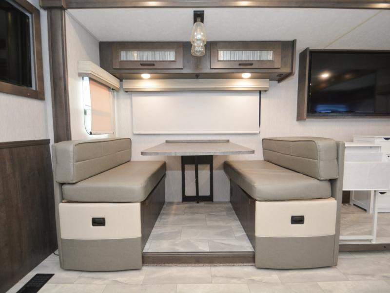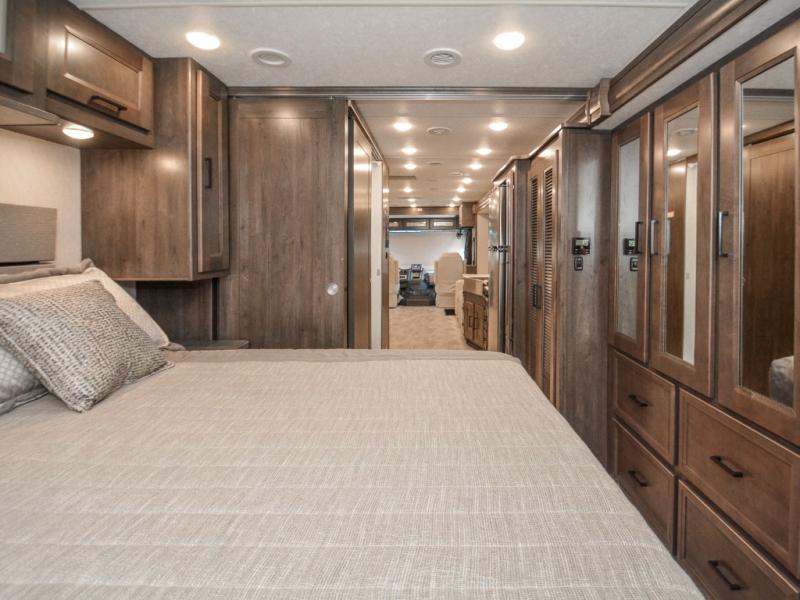 Travel coast-to-coast in this spacious and accommodating motorhome. Between theater seating and swivel captain's seats - there's never a bad seat to enjoy the 50" LCD TV. The well-equipped galley and booth dinette offer all the convenience and comfort for home-cooked meals, or enjoy cookouts under the 20' power awning while the exterior sidewall TV entertains. The full bath includes a glass shower door plus a shower skylight for natural lighting. The rear bedroom will be your oasis away from it all with a comfortable king bed, wardrobe, and a 32" LCD TV with more room for family and friends on the drop down bunk above the cockpit.