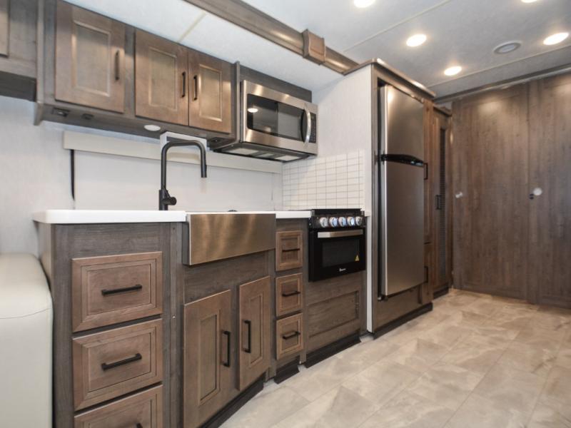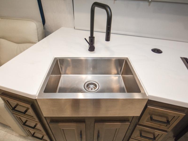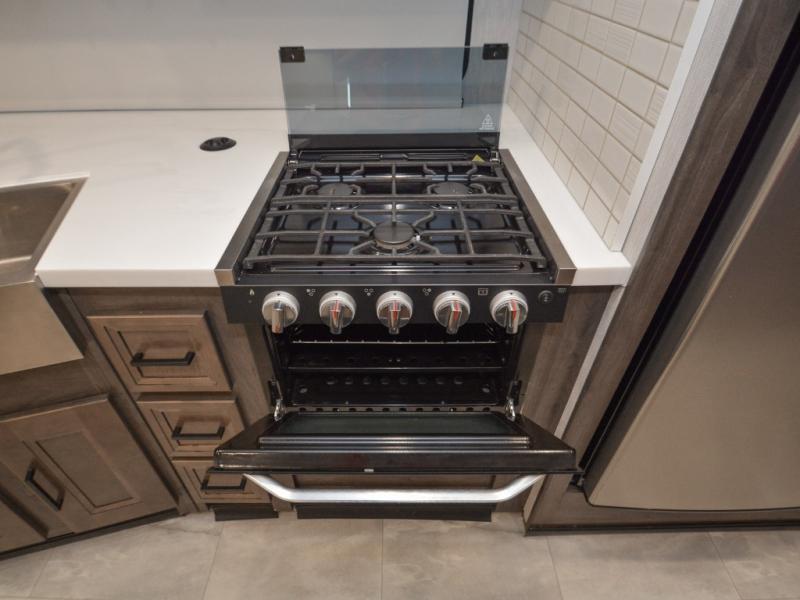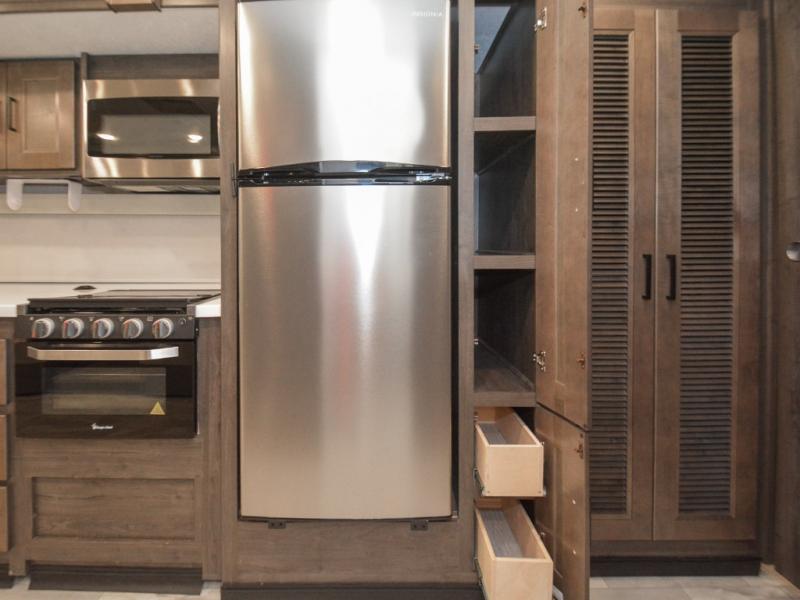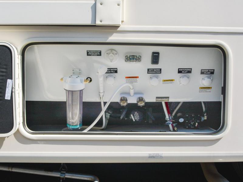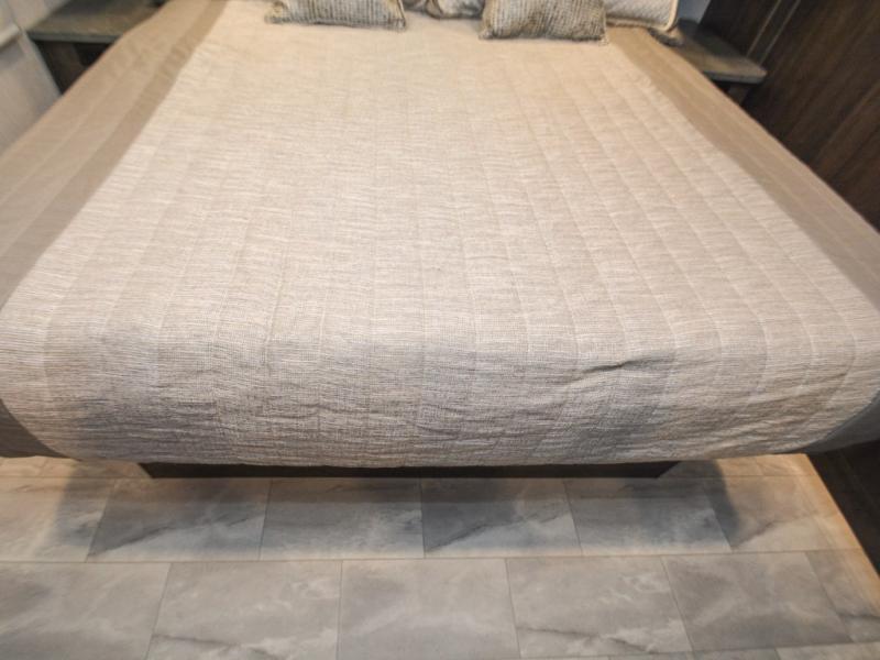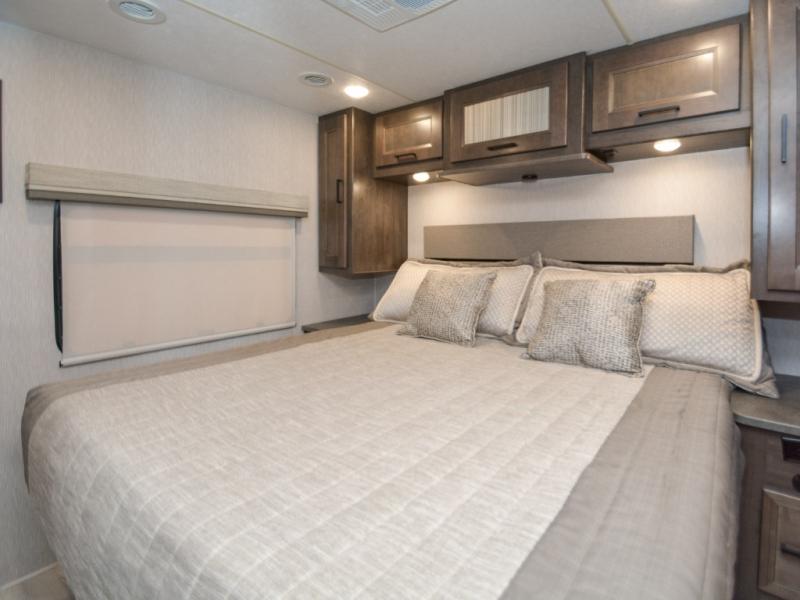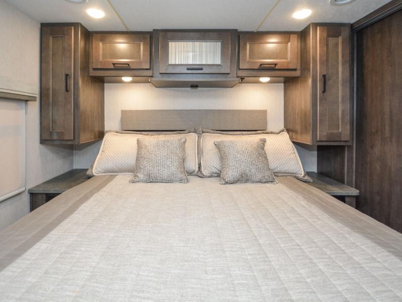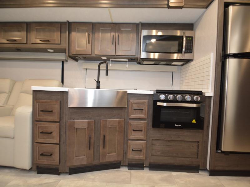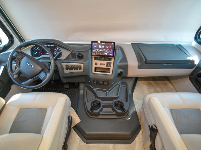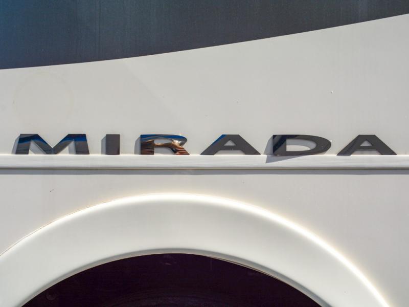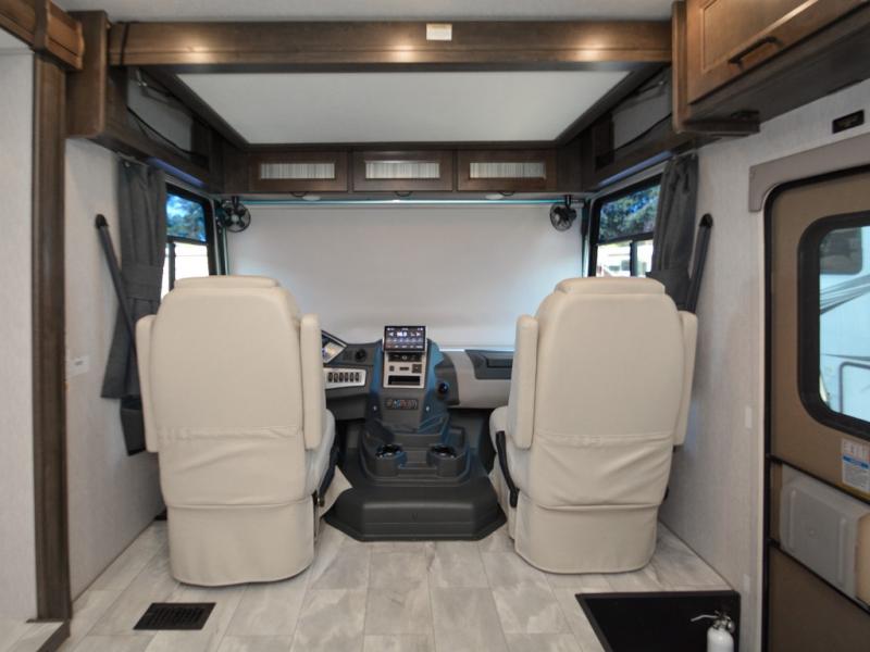 Each Mirada Class A gas motorhome by Coachmen is constructed with a crowned, laminated fiberglass roof with Azdel Superlite composite for added durability, along with high gloss "Oyster" gelcoat sidewalls. There is a 7.3L V8 engine on a Ford F53 chassis for power you can feel, and a 10" touch screen radio with AM/FM radio with Bluetooth capability. The 5.5 kW gas generator, dual coach batteries, and 100W solar panel with a controller will meet all your power needs, and the automatic leveling jacks make setting up camp a breeze. Head inside to find premium linoleum throughout, hardwood cabinet doors, kitchen tile backsplash, and solar privacy shades throughout to name a few comforts. The open road is yours for the taking in a Mirada Class A gas motorhome!
