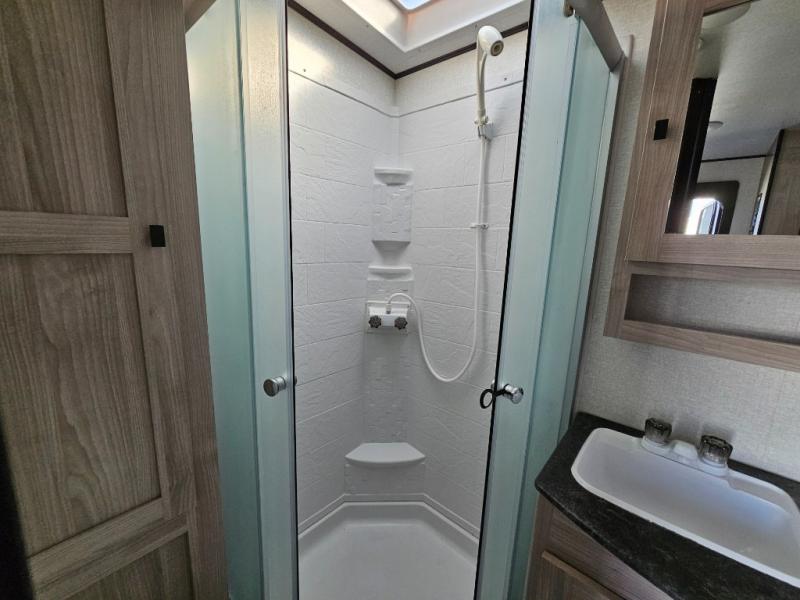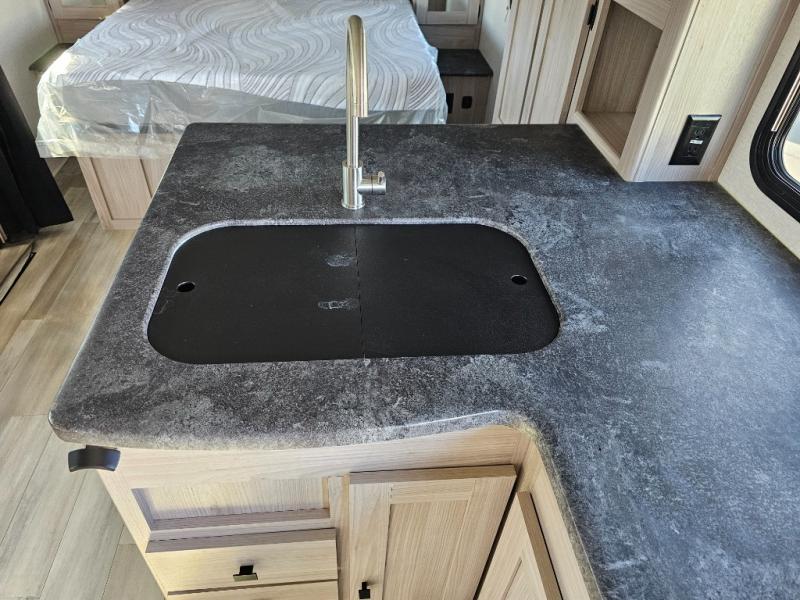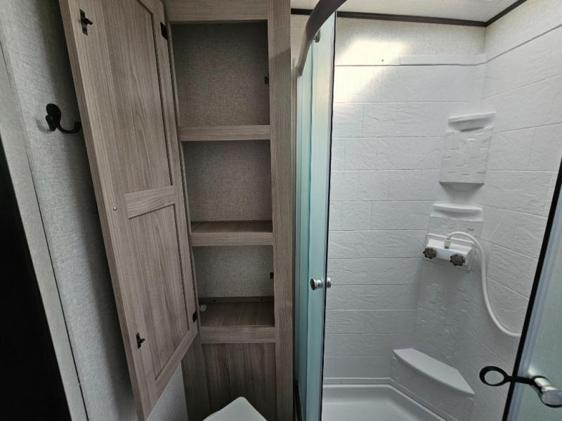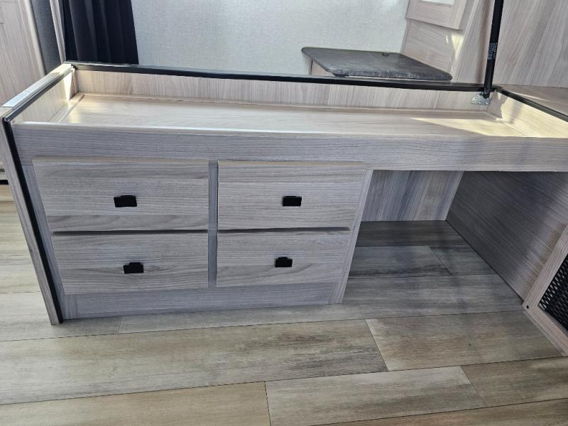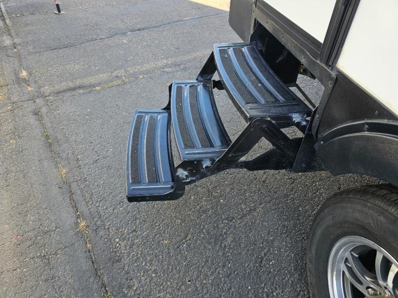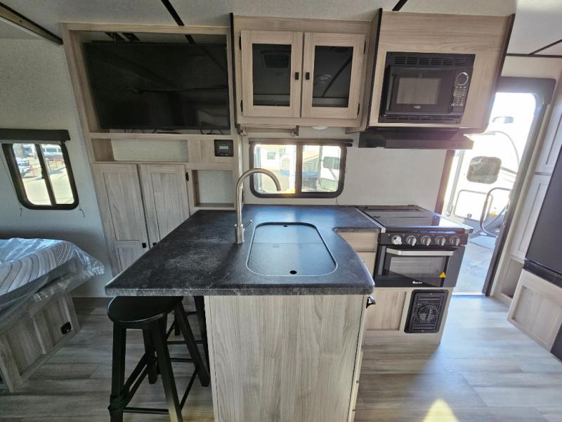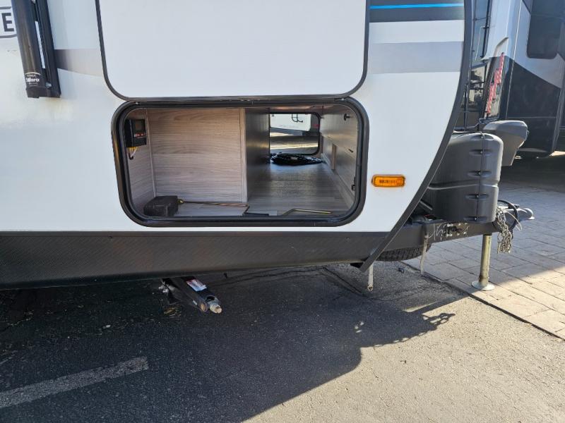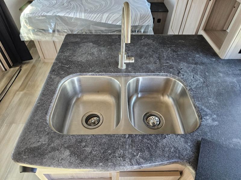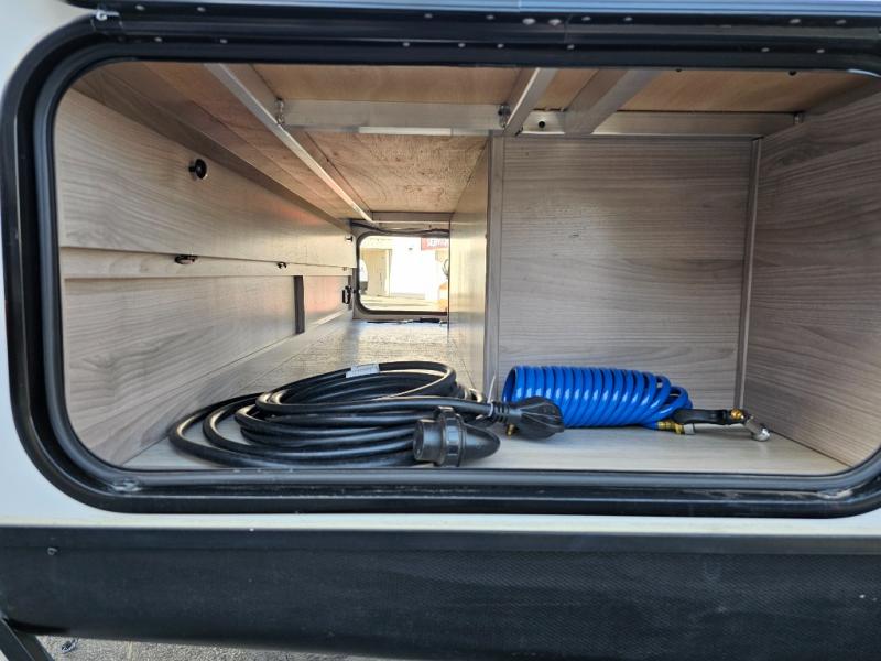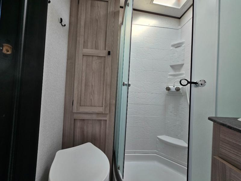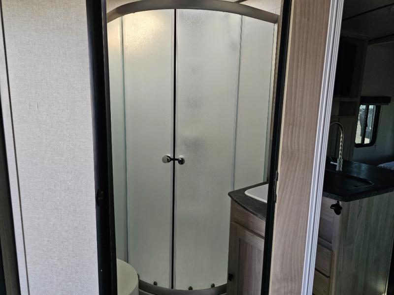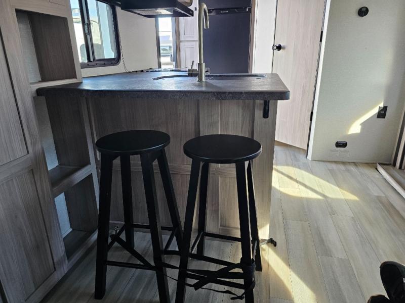 Sleep like royalty at any campsite when you have this trailer setup. You will find the interior is spacious with a slide out sofa including end tables for your drinks and cellphones, and the rear corner bathroom is convenient with a radius shower and linen storage. Your dog can stay clean as well with the exterior dog wash and the dog leash clip will keep them safely at the campsite. While outside you might decide to relax under the power awning, and store a few items in the pass-through compartment up front including fishing poles. And the cook will love the L-shaped counter, the appliances, the sink cover hide-away space, the hutch and the bar stools when wanting to take a break or visit with friends.