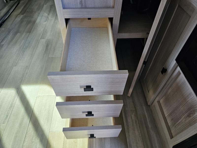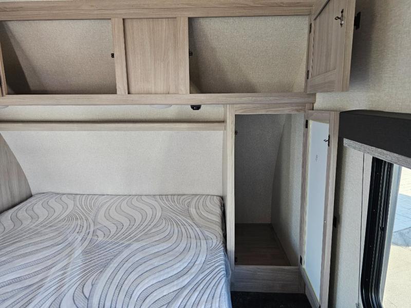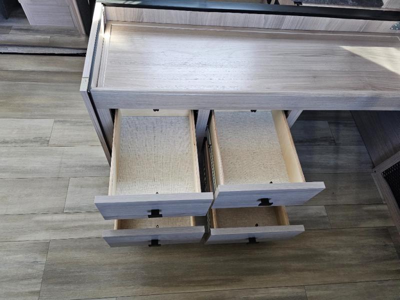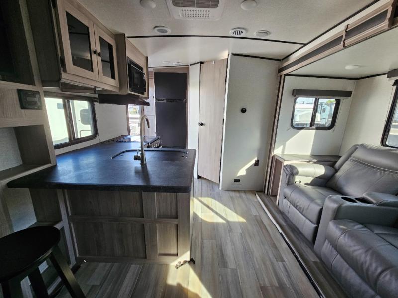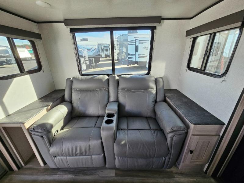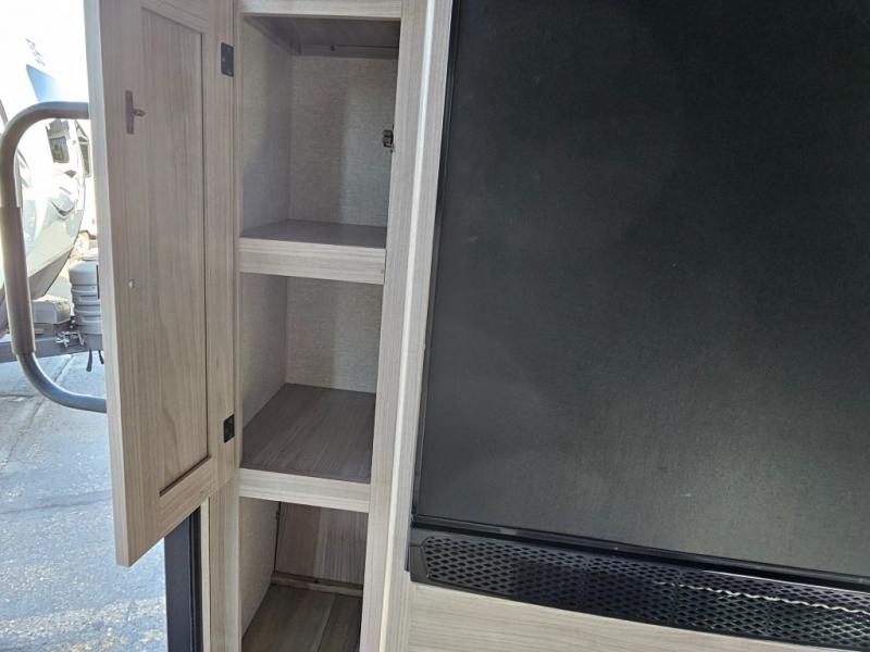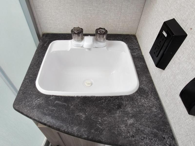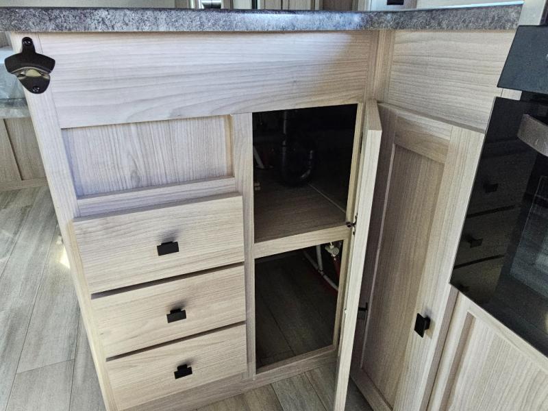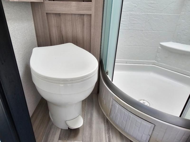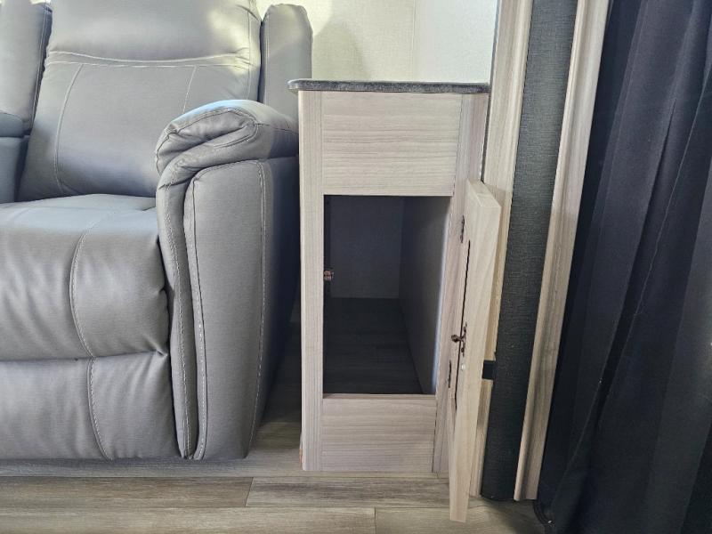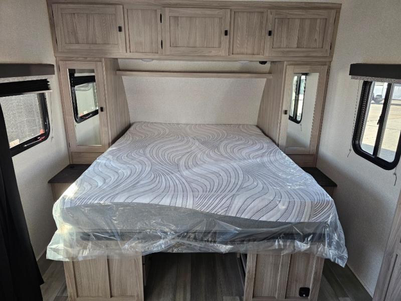 Sleep like royalty at any campsite when you have this trailer setup. You will find the interior is spacious with a slide out sofa including end tables for your drinks and cellphones, and the rear corner bathroom is convenient with a radius shower and linen storage. Your dog can stay clean as well with the exterior dog wash and the dog leash clip will keep them safely at the campsite. While outside you might decide to relax under the power awning, and store a few items in the pass-through compartment up front including fishing poles. And the cook will love the L-shaped counter, the appliances, the sink cover hide-away space, the hutch and the bar stools when wanting to take a break or visit with friends.