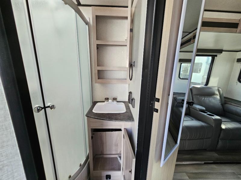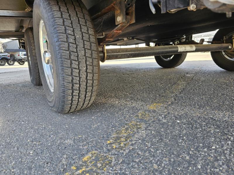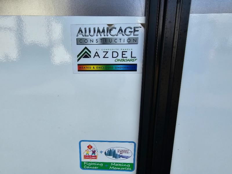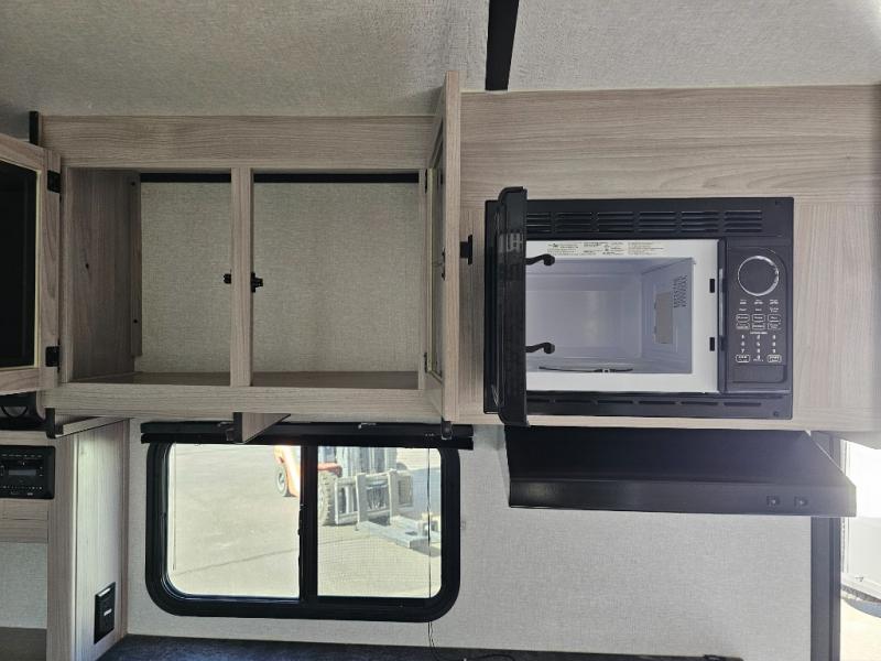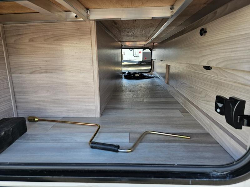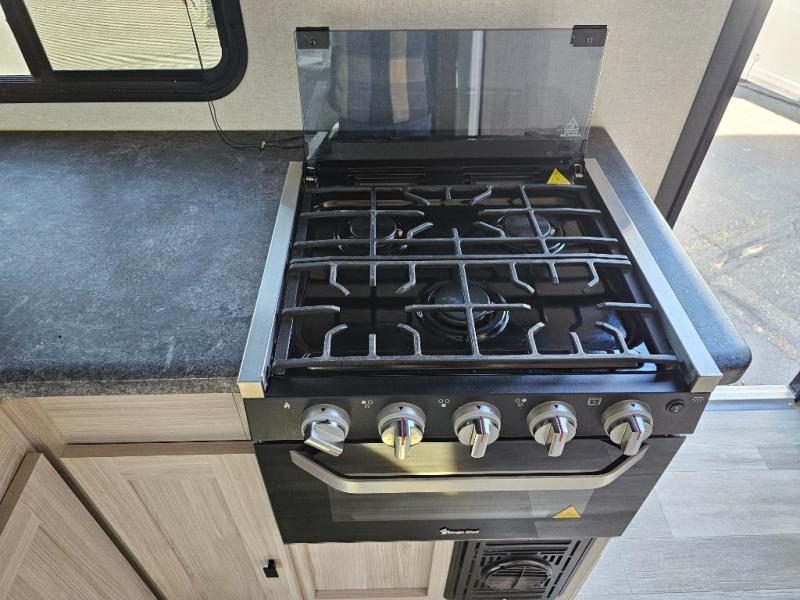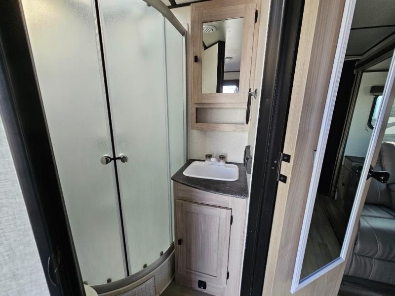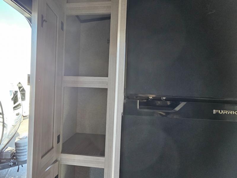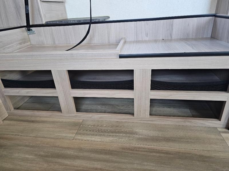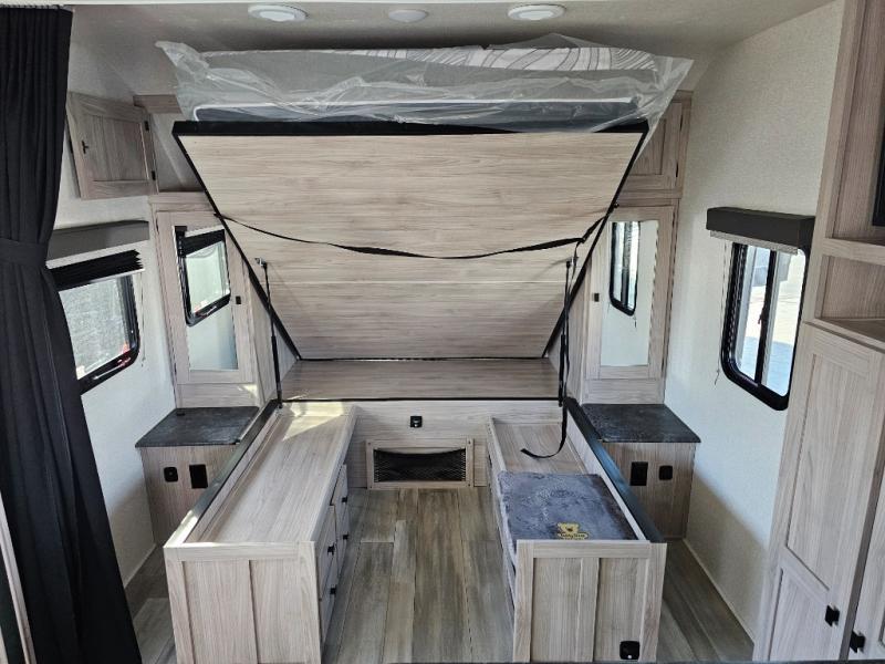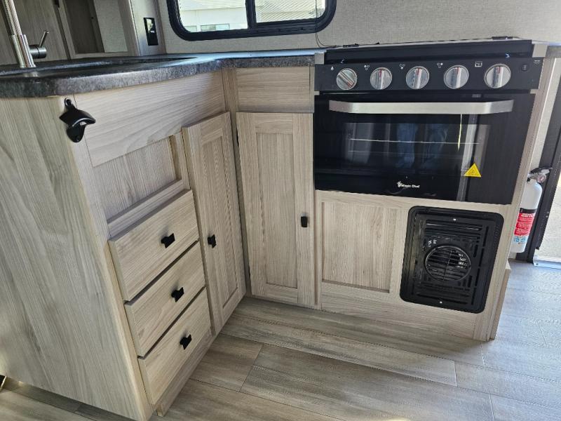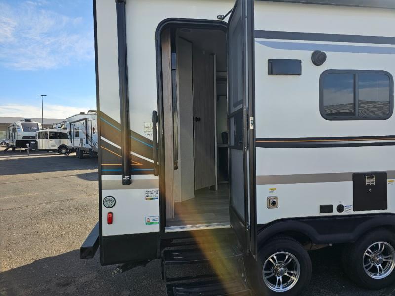 Sleep like royalty at any campsite when you have this trailer setup. You will find the interior is spacious with a slide out sofa including end tables for your drinks and cellphones, and the rear corner bathroom is convenient with a radius shower and linen storage. Your dog can stay clean as well with the exterior dog wash and the dog leash clip will keep them safely at the campsite. While outside you might decide to relax under the power awning, and store a few items in the pass-through compartment up front including fishing poles. And the cook will love the L-shaped counter, the appliances, the sink cover hide-away space, the hutch and the bar stools when wanting to take a break or visit with friends.