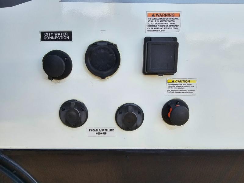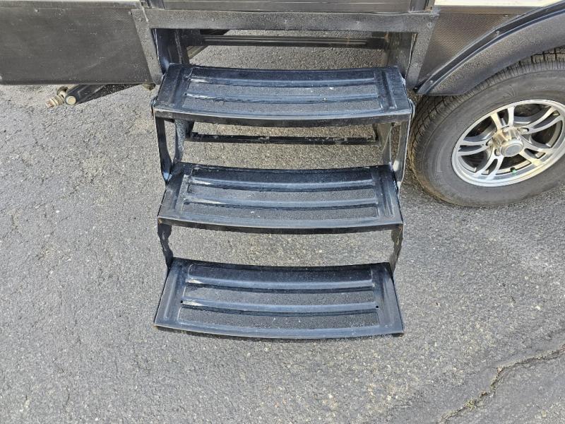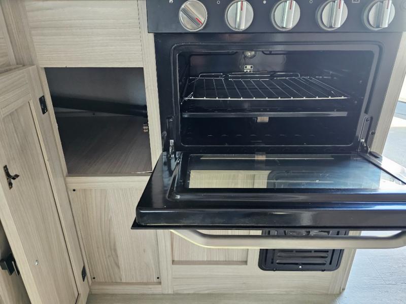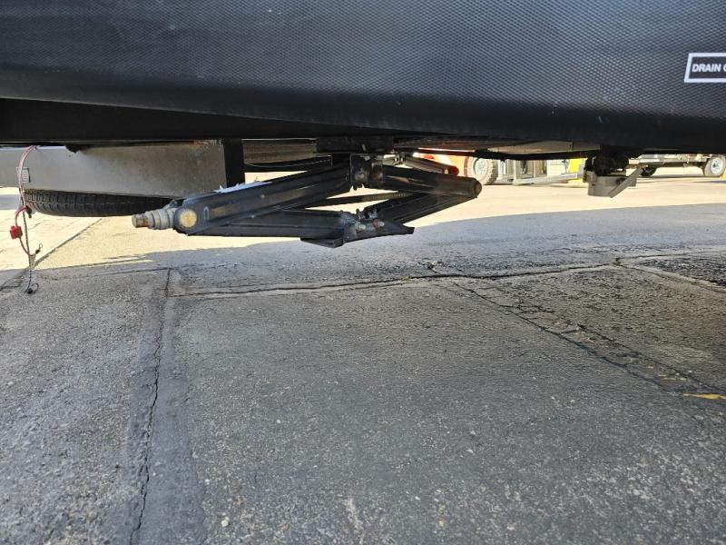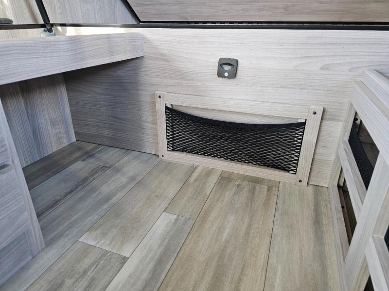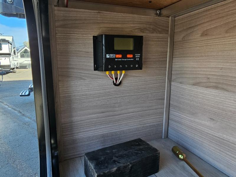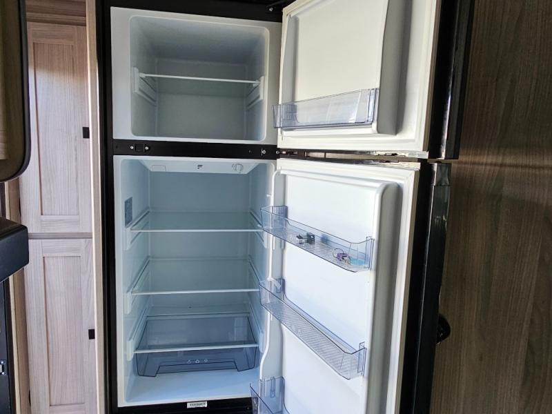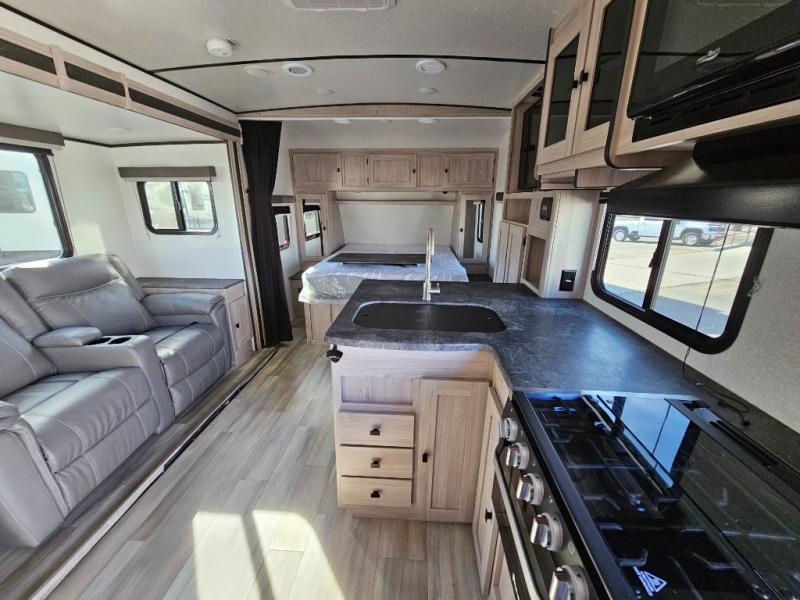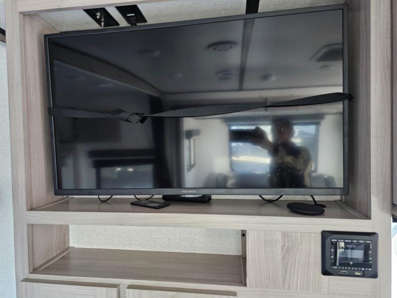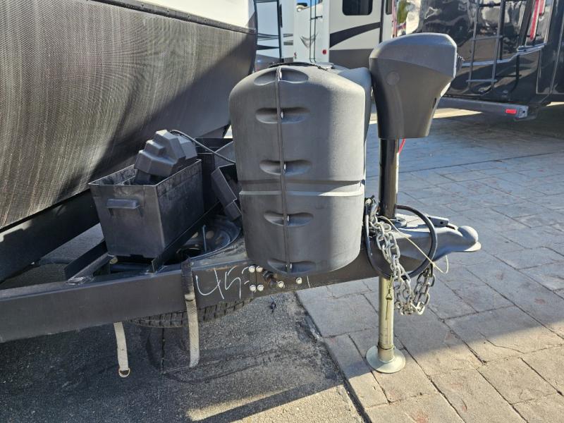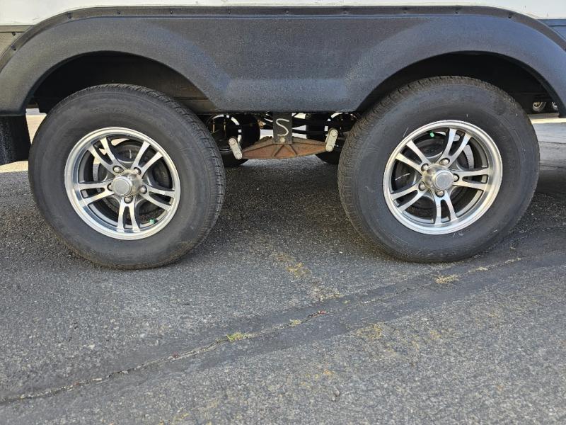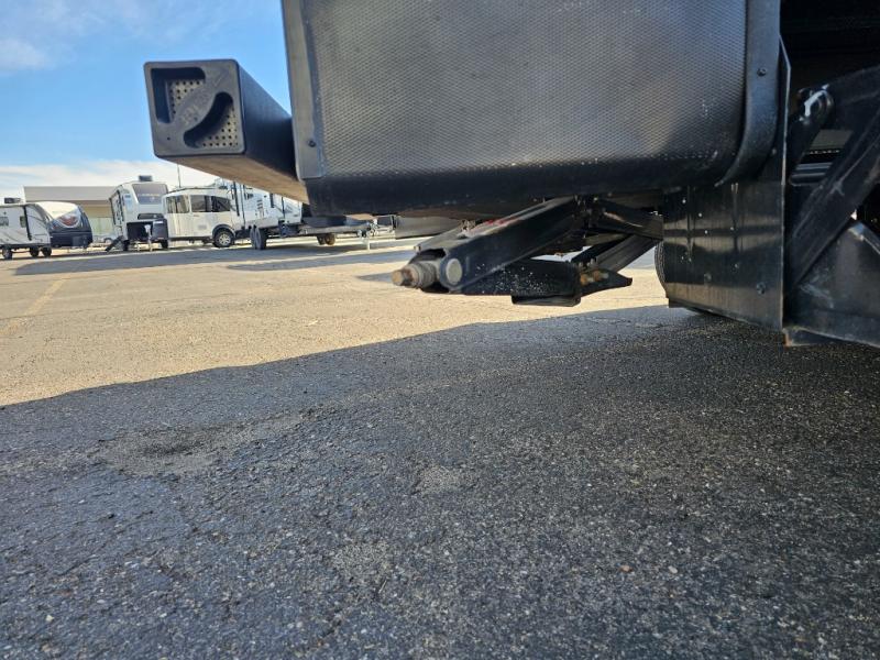 Sleep like royalty at any campsite when you have this trailer setup. You will find the interior is spacious with a slide out sofa including end tables for your drinks and cellphones, and the rear corner bathroom is convenient with a radius shower and linen storage. Your dog can stay clean as well with the exterior dog wash and the dog leash clip will keep them safely at the campsite. While outside you might decide to relax under the power awning, and store a few items in the pass-through compartment up front including fishing poles. And the cook will love the L-shaped counter, the appliances, the sink cover hide-away space, the hutch and the bar stools when wanting to take a break or visit with friends.