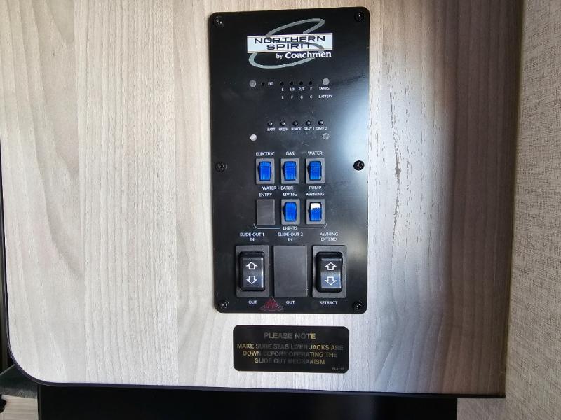 With any Northern Spirit Ultra Lite travel trailer by Coachmen, the "Twice Cool" dual ducted air conditioning system, the motion activated floor lights in the bedroom and bathroom, the lighted USB ports, the digital level, and the motion activated pass-through storage light plus fishing pole storage, will make your camping experience simplified. The heated and enclosed underbelly provides protection on the road and allows you to camp during any season, the 100W solar panel with 10 amp controller provides off-grid camping, and the power tongue jack makes setup easier. Each is built with a painted fiberglass front cap with LED strip lights, a laminated, aluminum framed floor, rear wall, and sidewalls, plus 5" trusses with interior vault. Make your decision today, and camp with everything in its place!