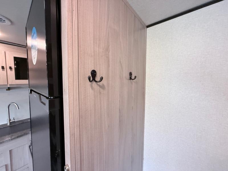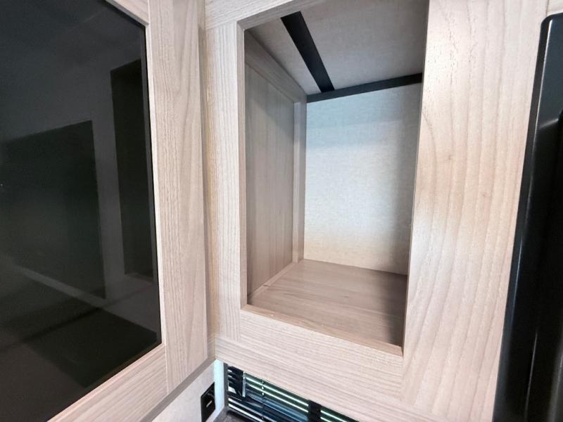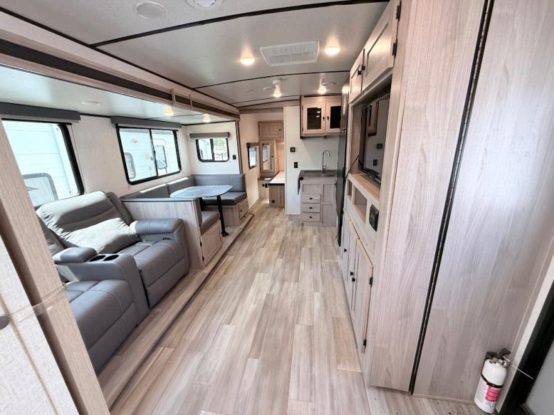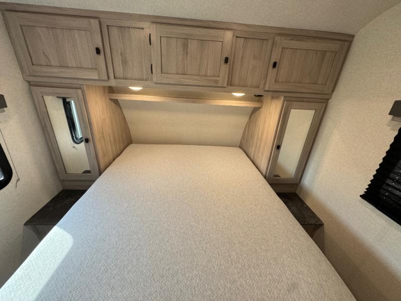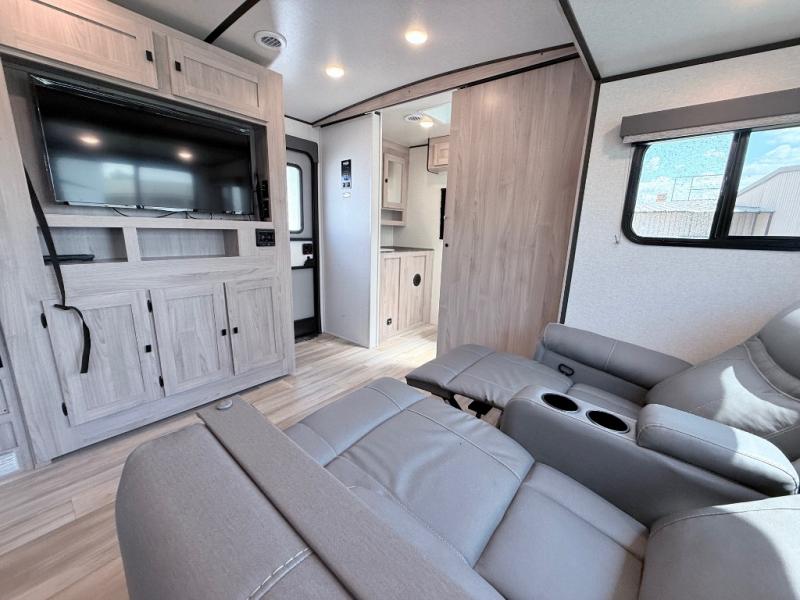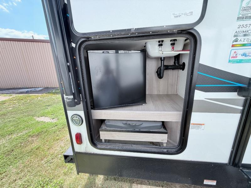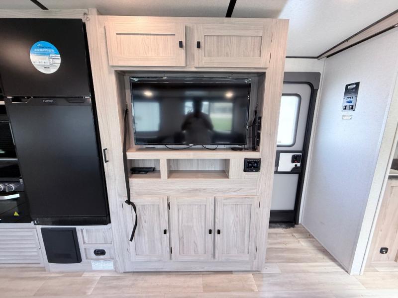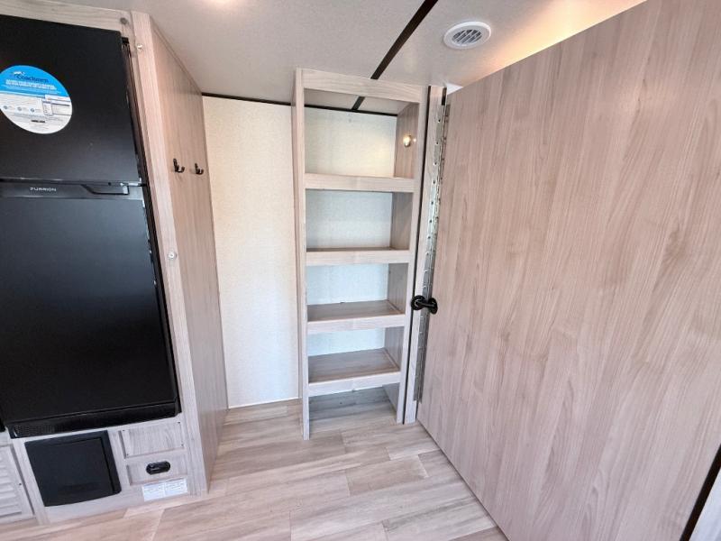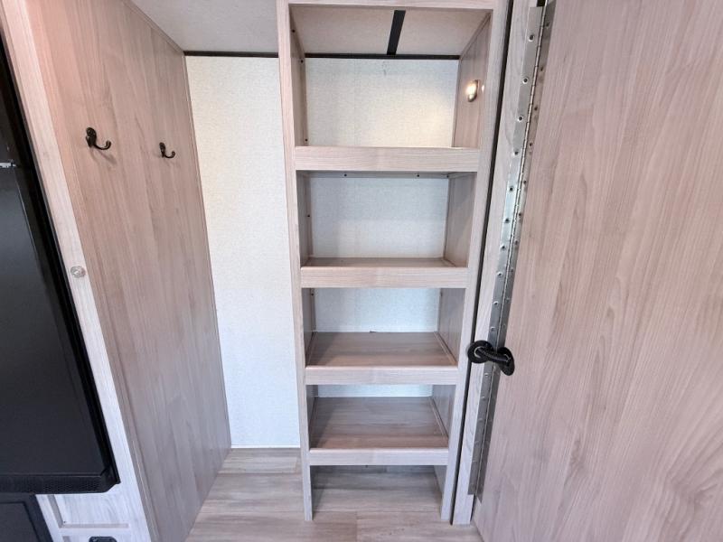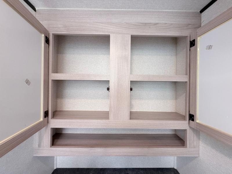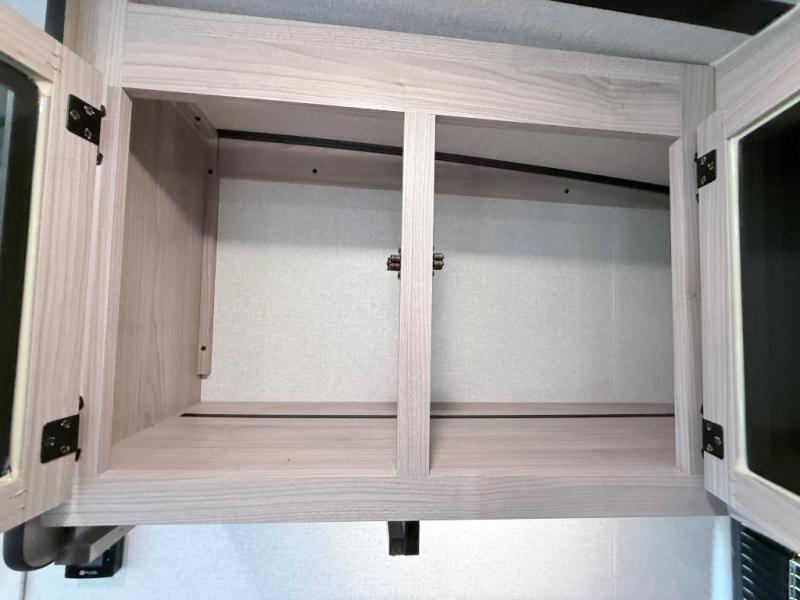 Looking for plenty of storage in your next RV? This trailer has a hidden swing-out pantry behind the entertainment center, a closet, overhead cabinets and a pet center for your dog's food and water. You will also find storage in the front bedroom that includes a space savings sliding door for privacy, MAX bed storage underneath with drawers and places for your shoes, plus you will have wardrobes for hanging clothes and nightstands for your cellphone and keys. The rear full bathroom is spacious and includes overhead cabinets, a counter for toiletries and a shower. The cook will love the L-shaped kitchen corner with everything nearby to whip up meals, plus there is a flip-up counter extension. And don't forget about the outside kitchen, the power awning, and the pass-through compartment.